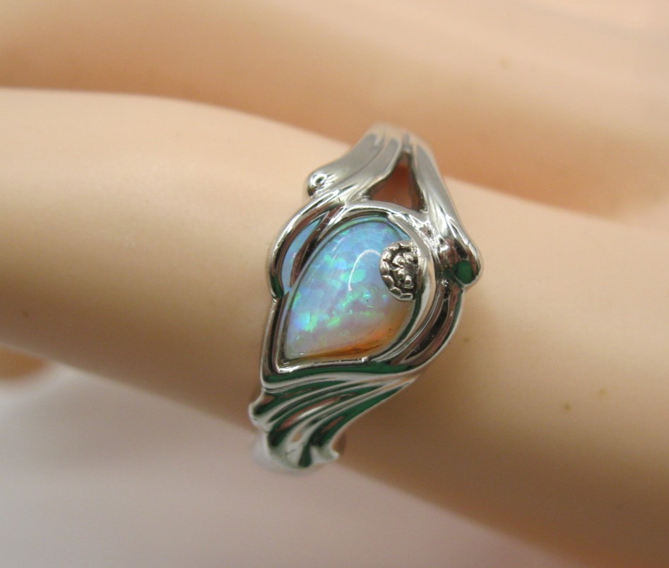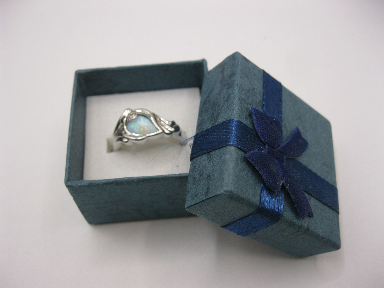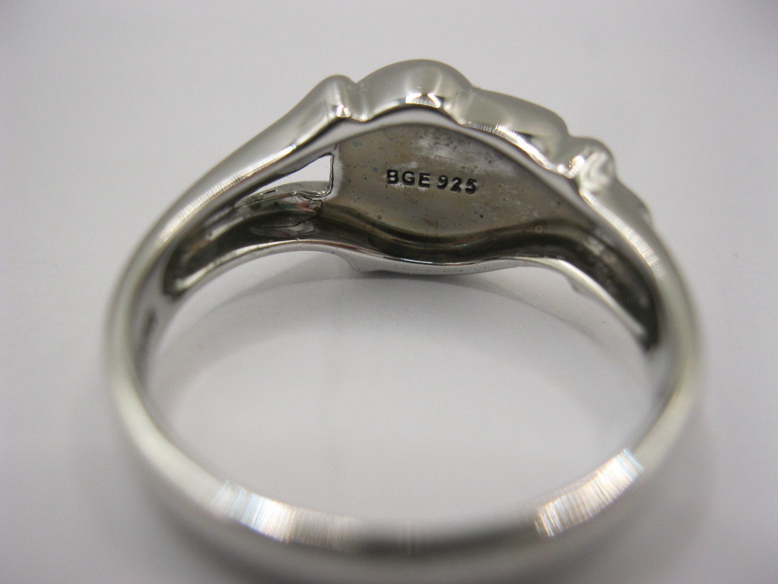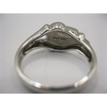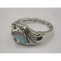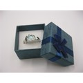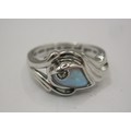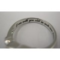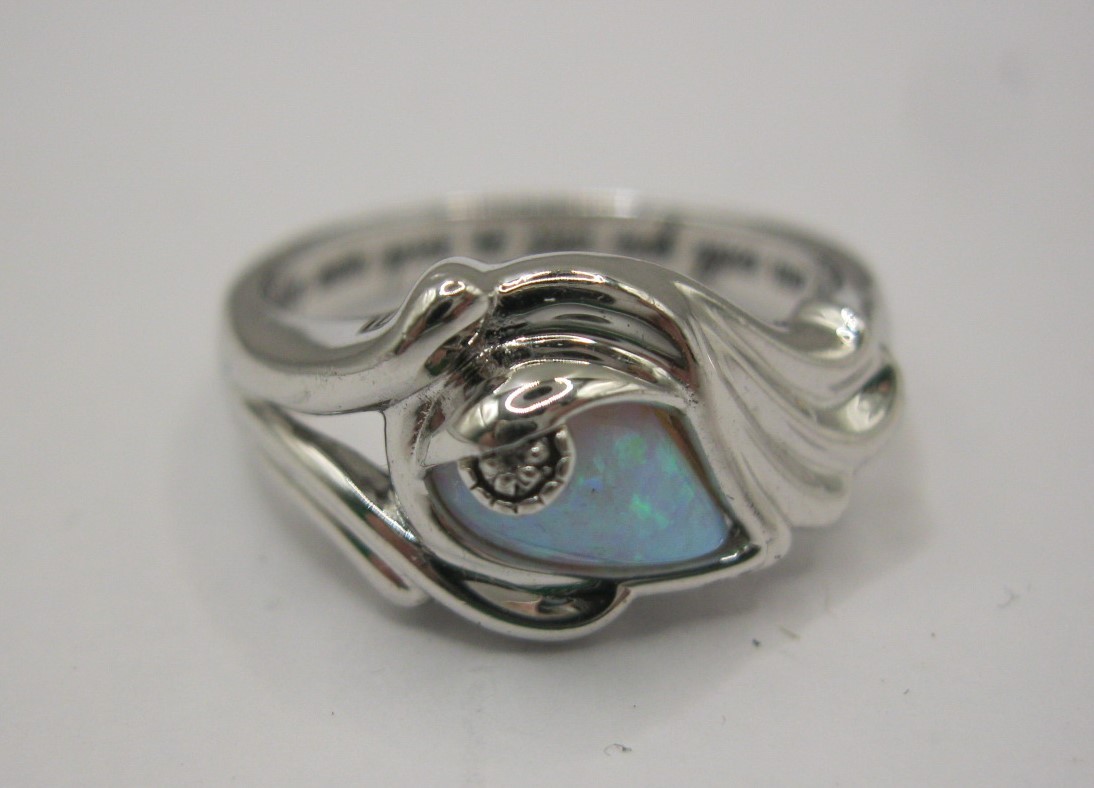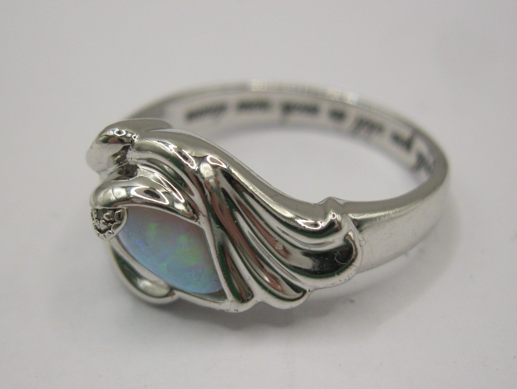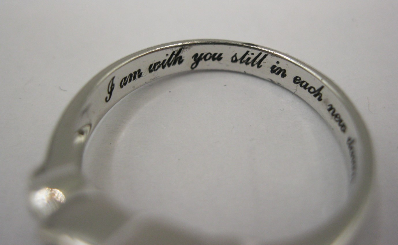 A 925 silver dress ring set with an opalescent style stone, engraved inside 'I am with you still in each new dawn'. Ring size Q, approx. 4.6g. With a blue presentation box