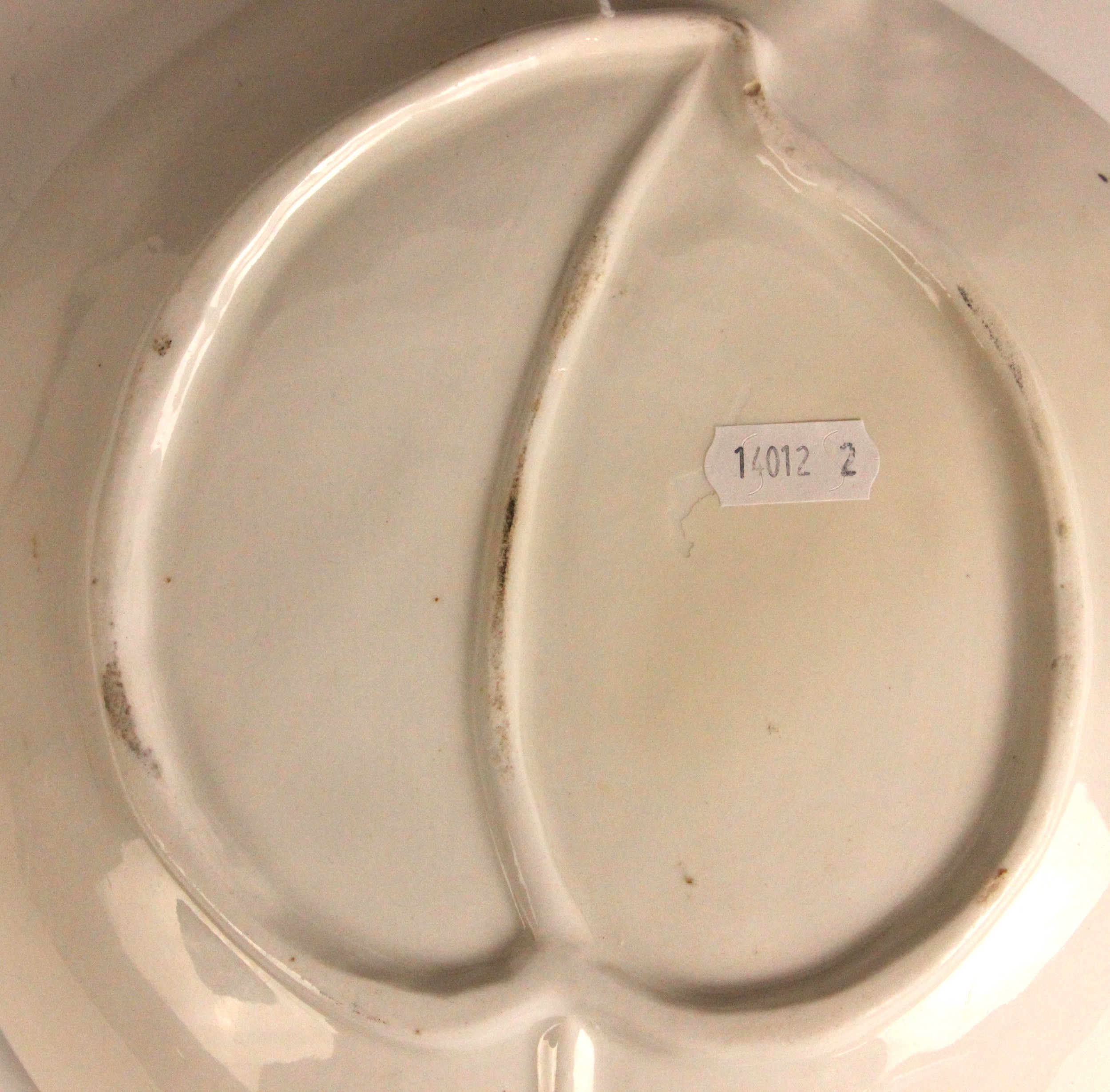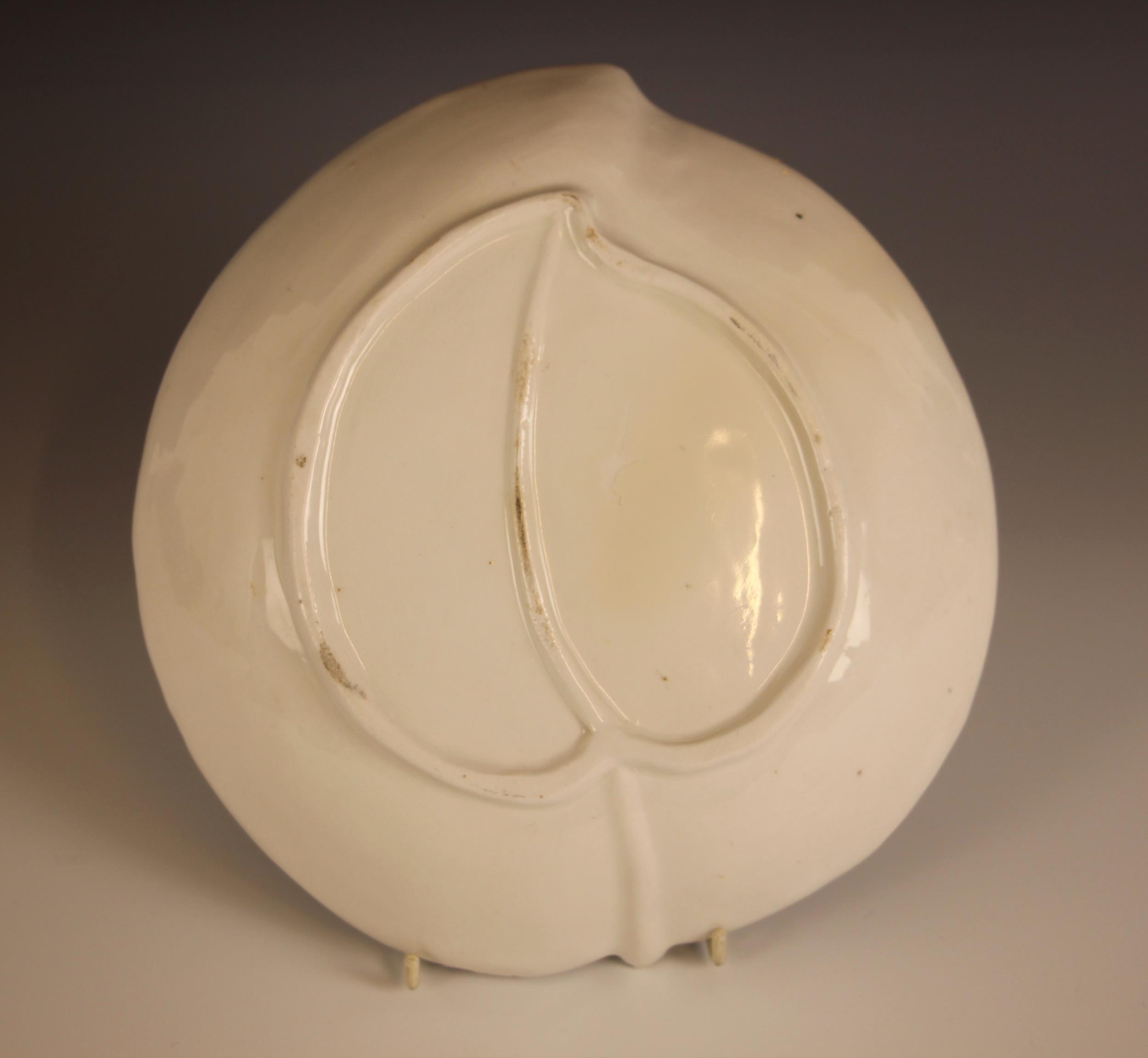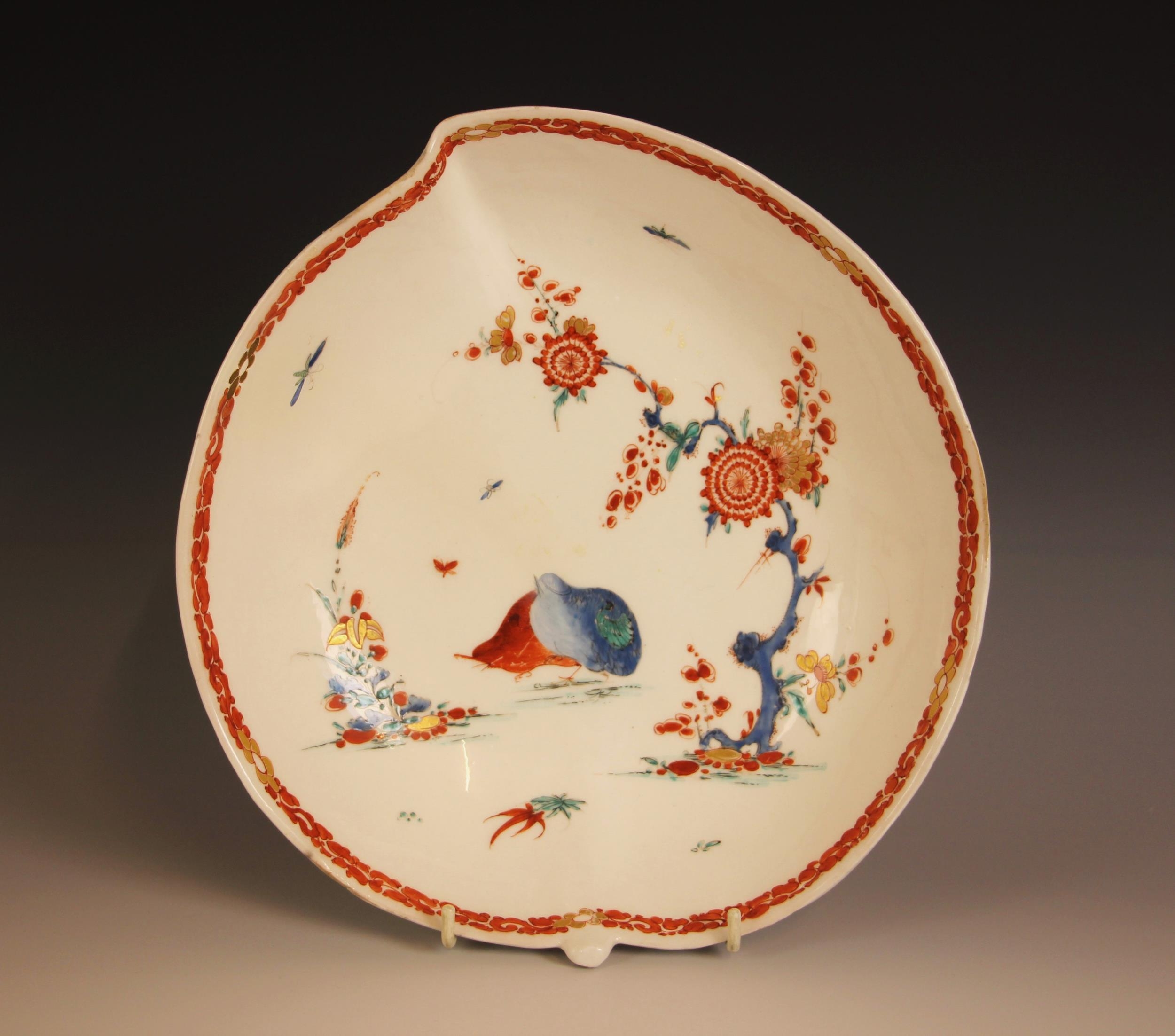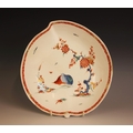 A Bow porcelain kakiemon palette leaf shaped dish in the 'Two Quail' pattern, mid 18th century circa 1760, the underside with raised central stem, unmarked, 15.5cm wide, 5cm deep (at fault)