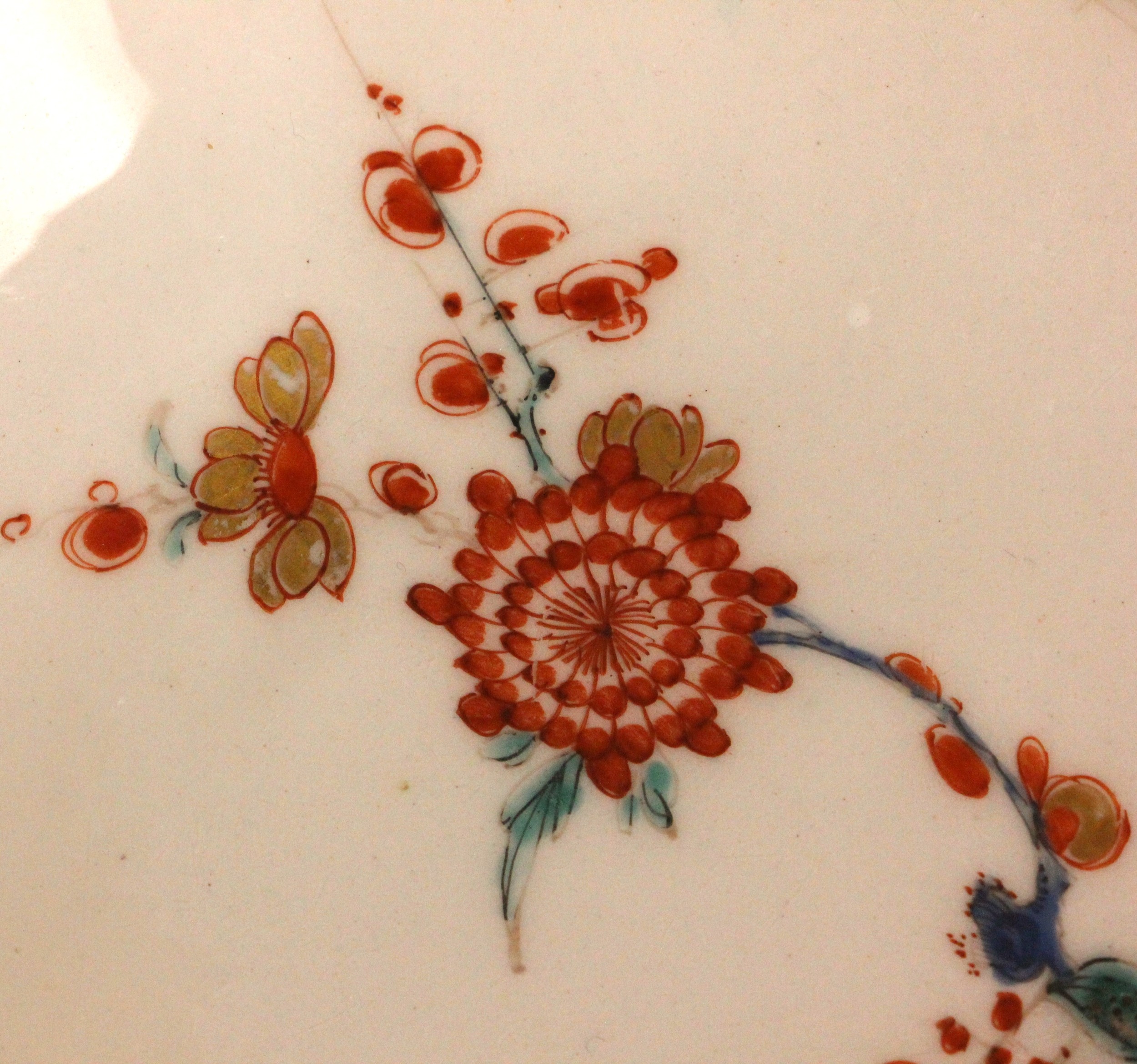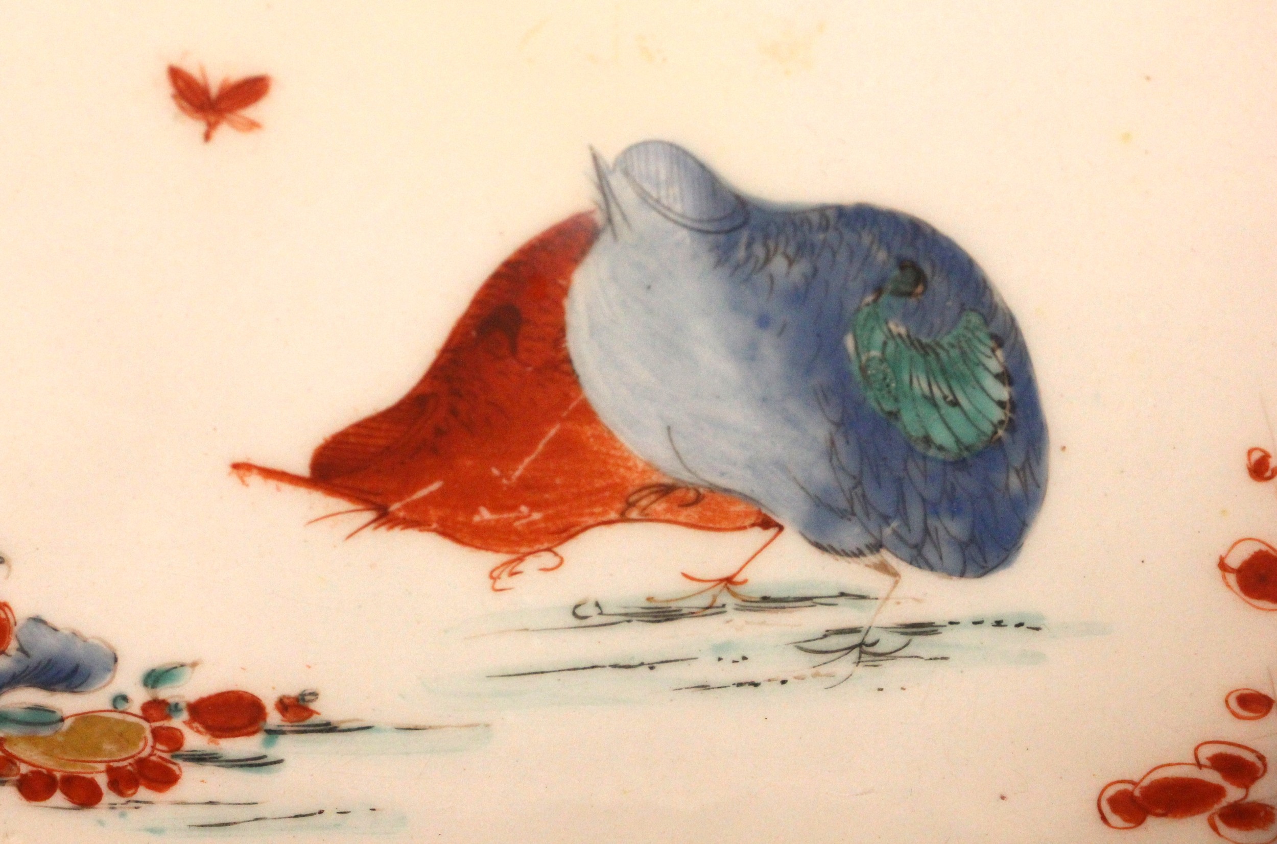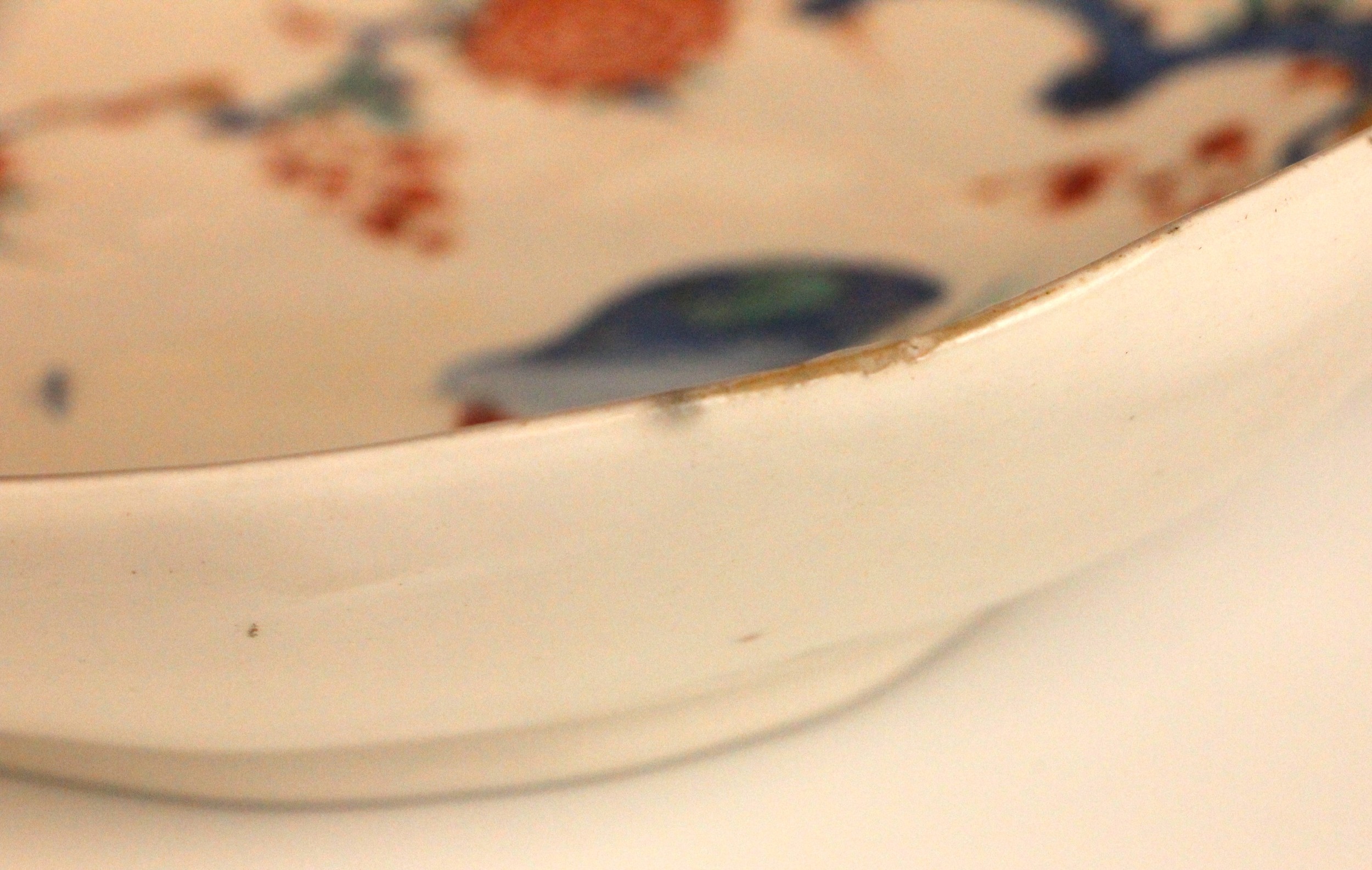 The dish shows worn flaked losses due to restoration, most noticeably to the base, the odd stain and the odd glazing fault to the rim. The foot rim shows wear commensurate with age and use. The interior shows wear including fine surface scratching, including to the gilt highlights and the red quail.