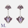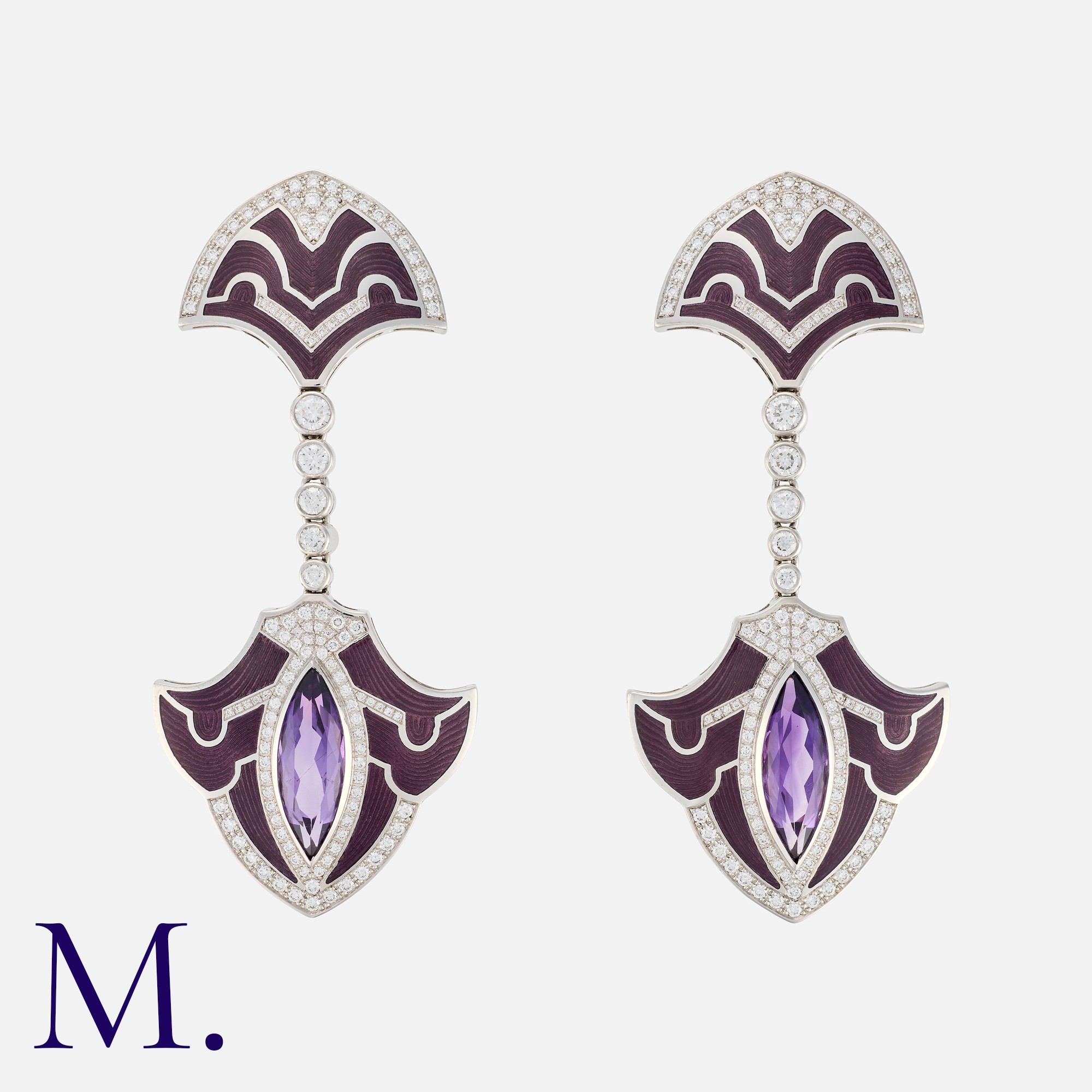 A Large Pair of Amethyst, Diamond and Enamel in 18 carat white gold, set with round cut diamonds totalling approximately 3.50 carats, marquise cut amethysts, accented with purple enamel decoration. Marked 750 for 18 carat gold.
