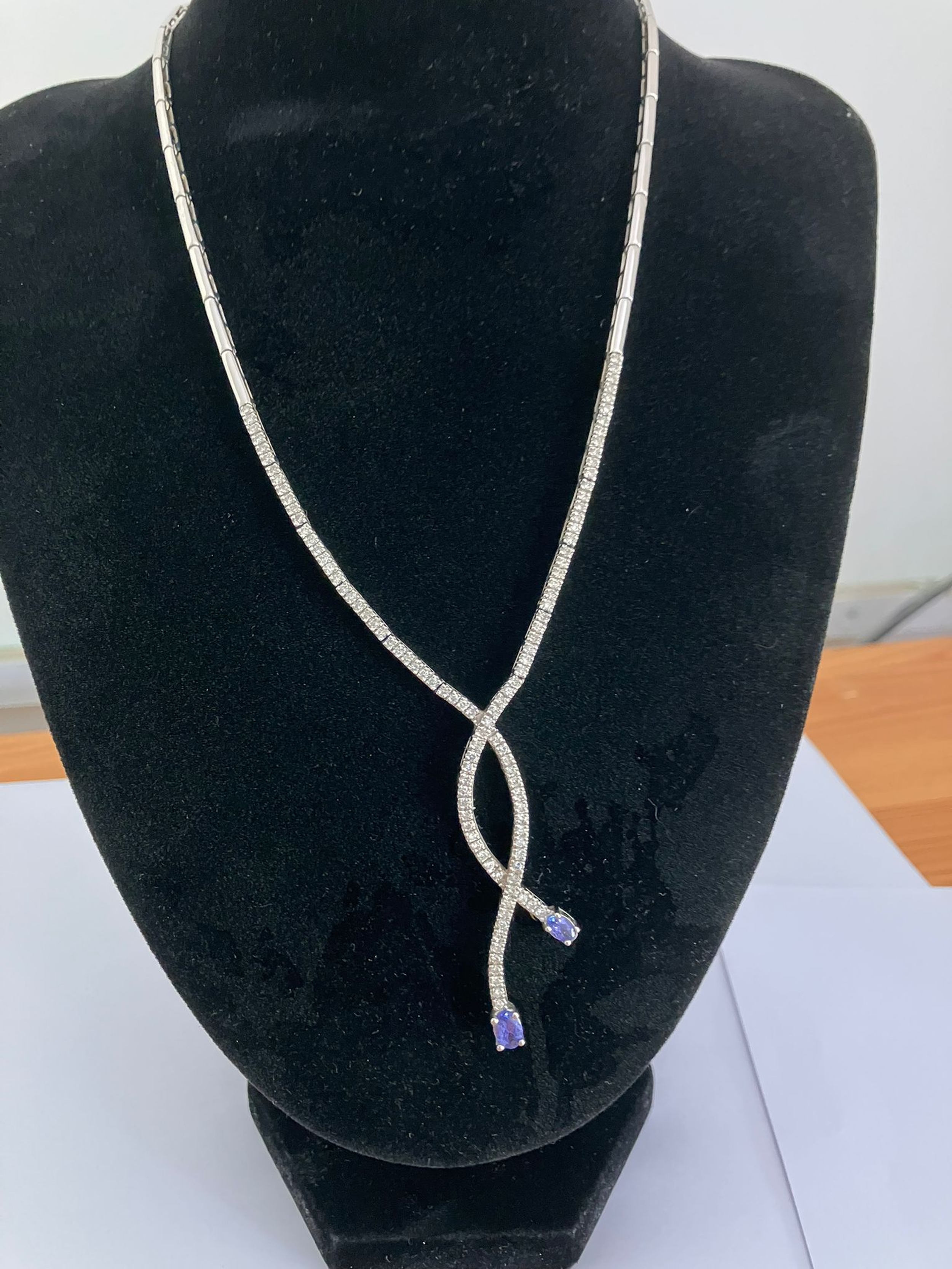 Exquisite 14 CARAT WHITE GOLD NECKLACE set with 112 x DIAMONDS and 2 x TANZANITE Gemstones. 20.5 grams. 42 cm + 5 cm knot detail. An exceptional piece of Jewellery, please see pictures.
