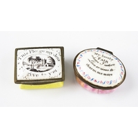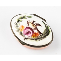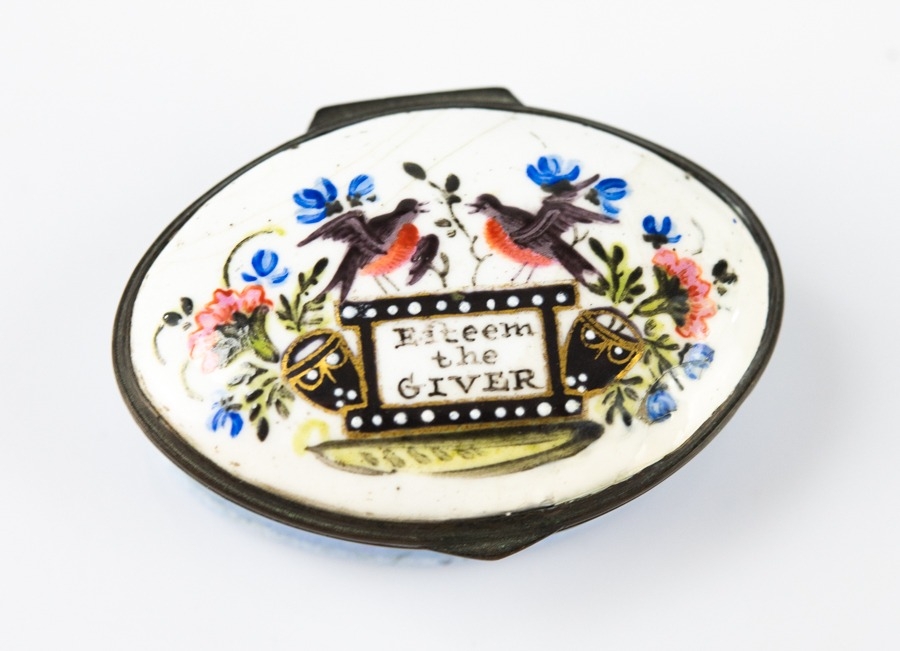 18TH CENTURY OVAL ENAMEL PATCH BOX painted in colours with vases of flowers and birds and centred with a jewelled plaque "Esteem the Giver", all on a white ground, mirror cracked, pale blue base, 2⅛" wide (5.5cm), minor hairline cracks and slight wear to letters