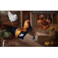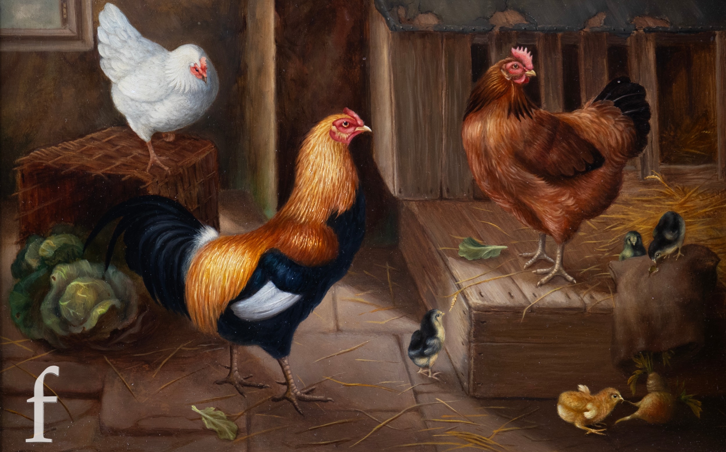 Follower of Edgar Hunt (1876-1953) - A cockerel and hens in a barn interior, oil on board, framed, 19cm x 29cm, frame size 30cm x 39cm.