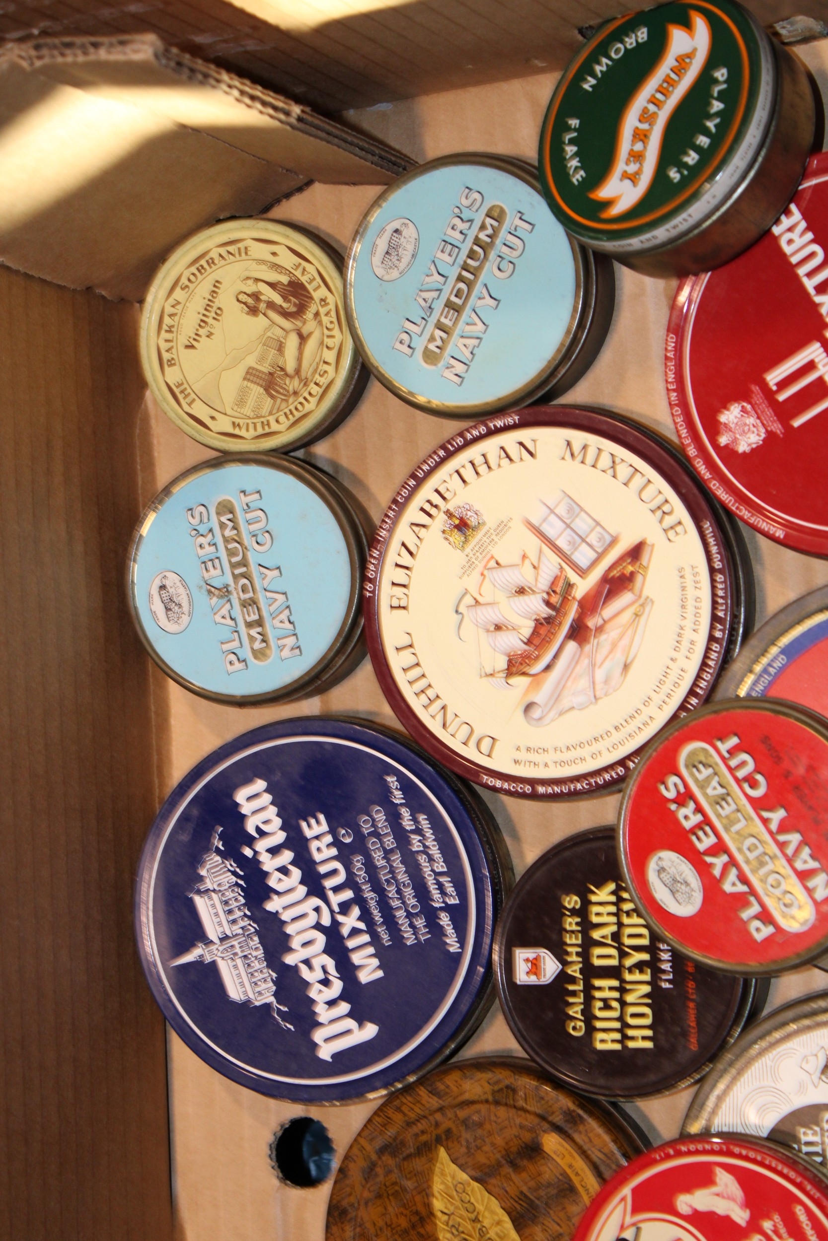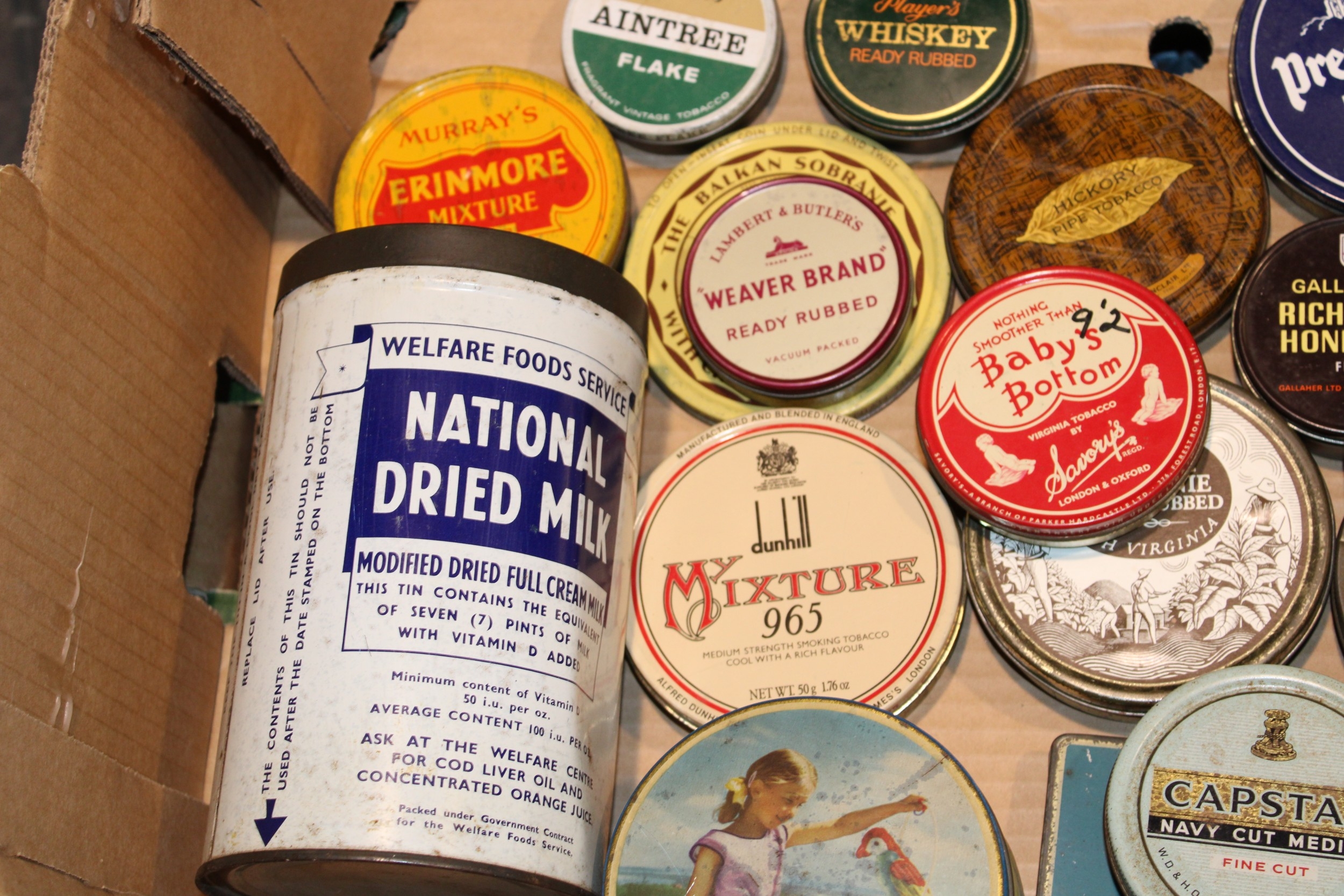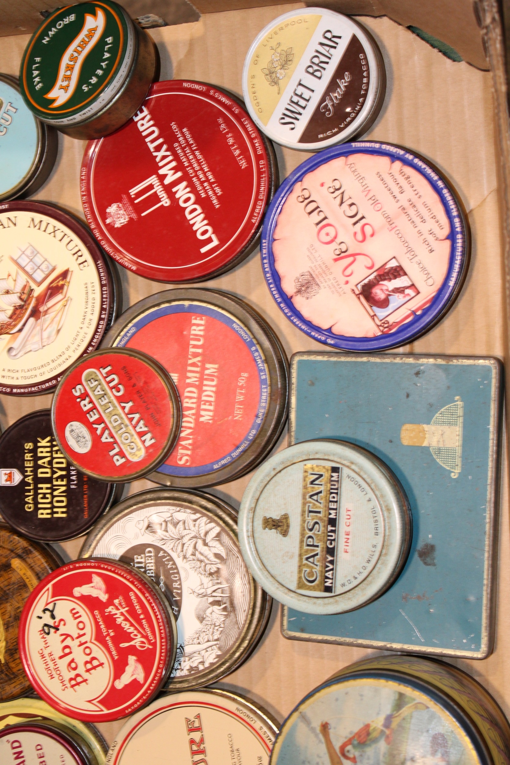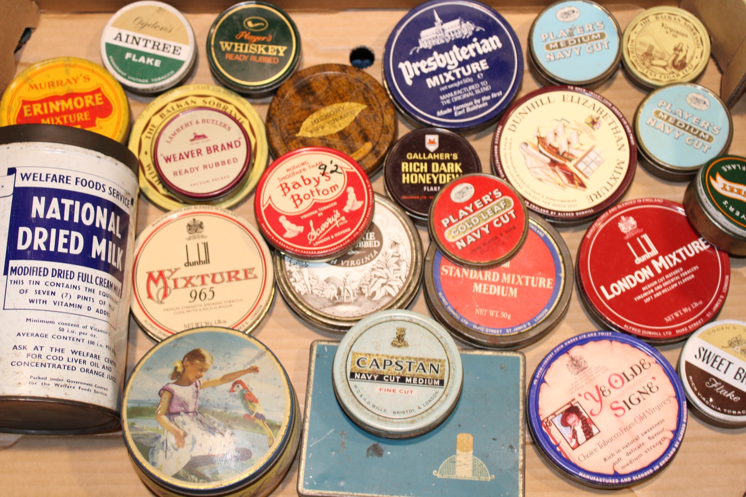 A collection of vintage tins comprising mostly early tobacco tins together with am Edward Sharp Toffee tin, of note 'Baby's Bottom' Virginia Tobacco by Savoy's, (Qty).