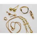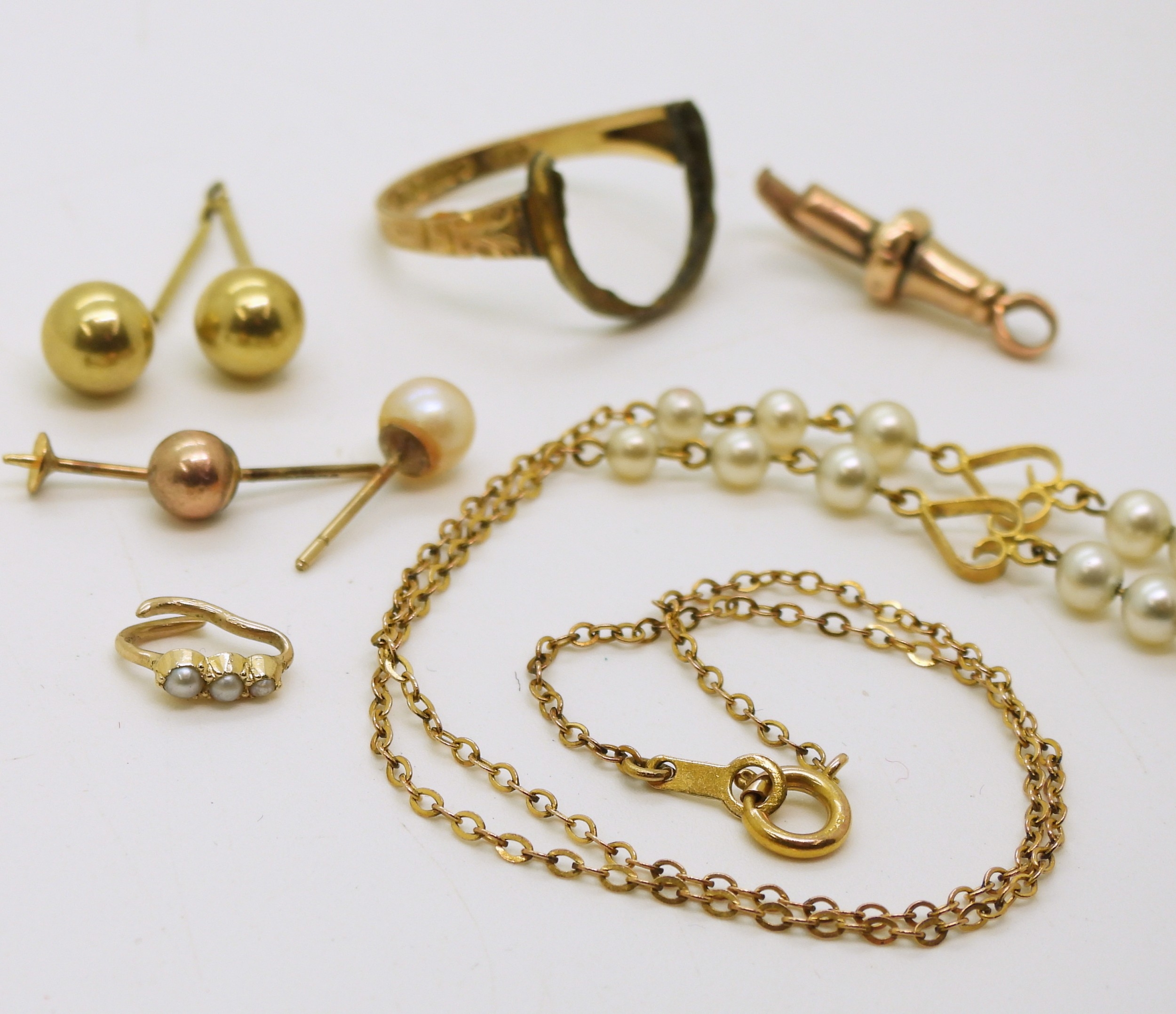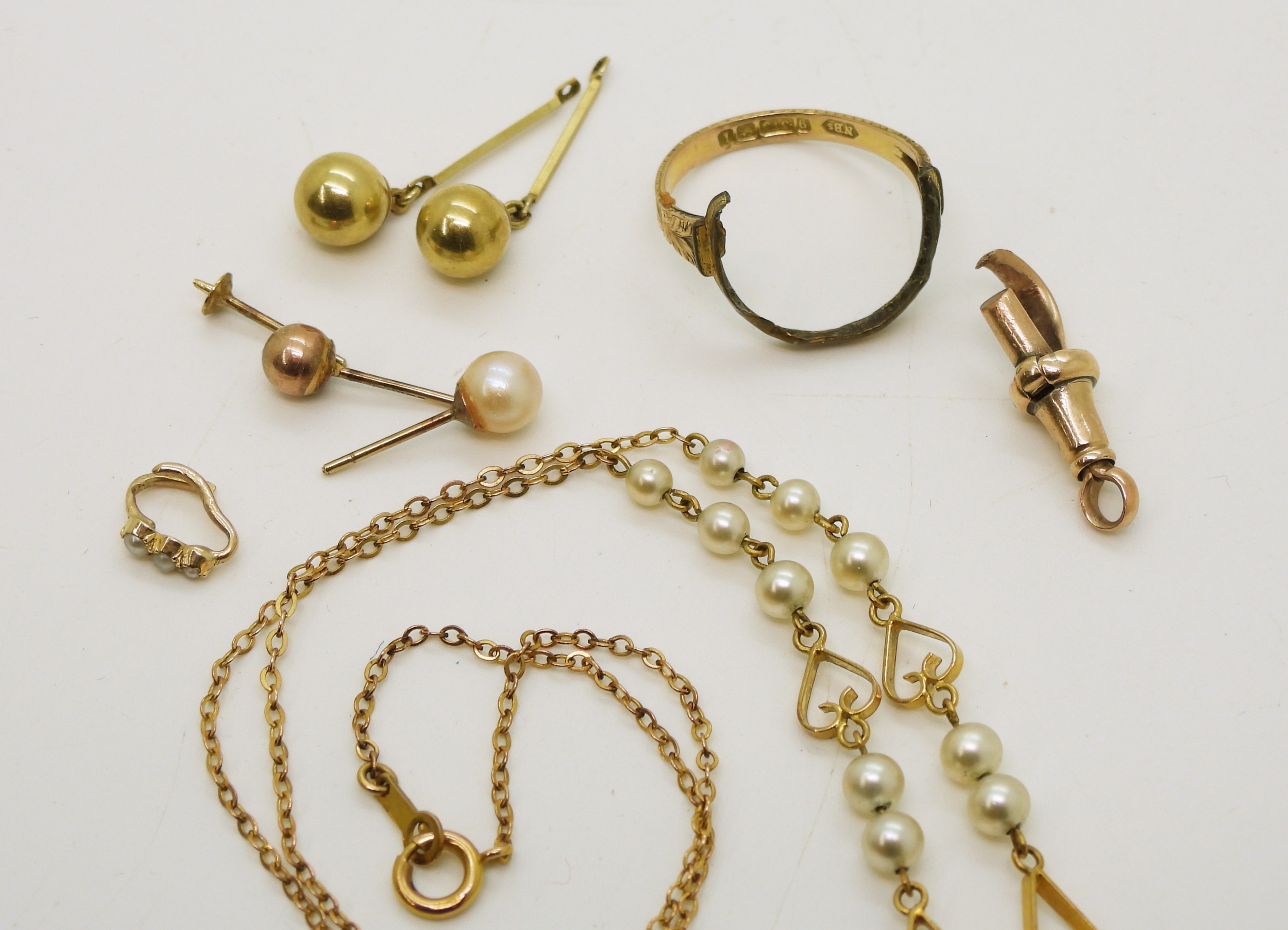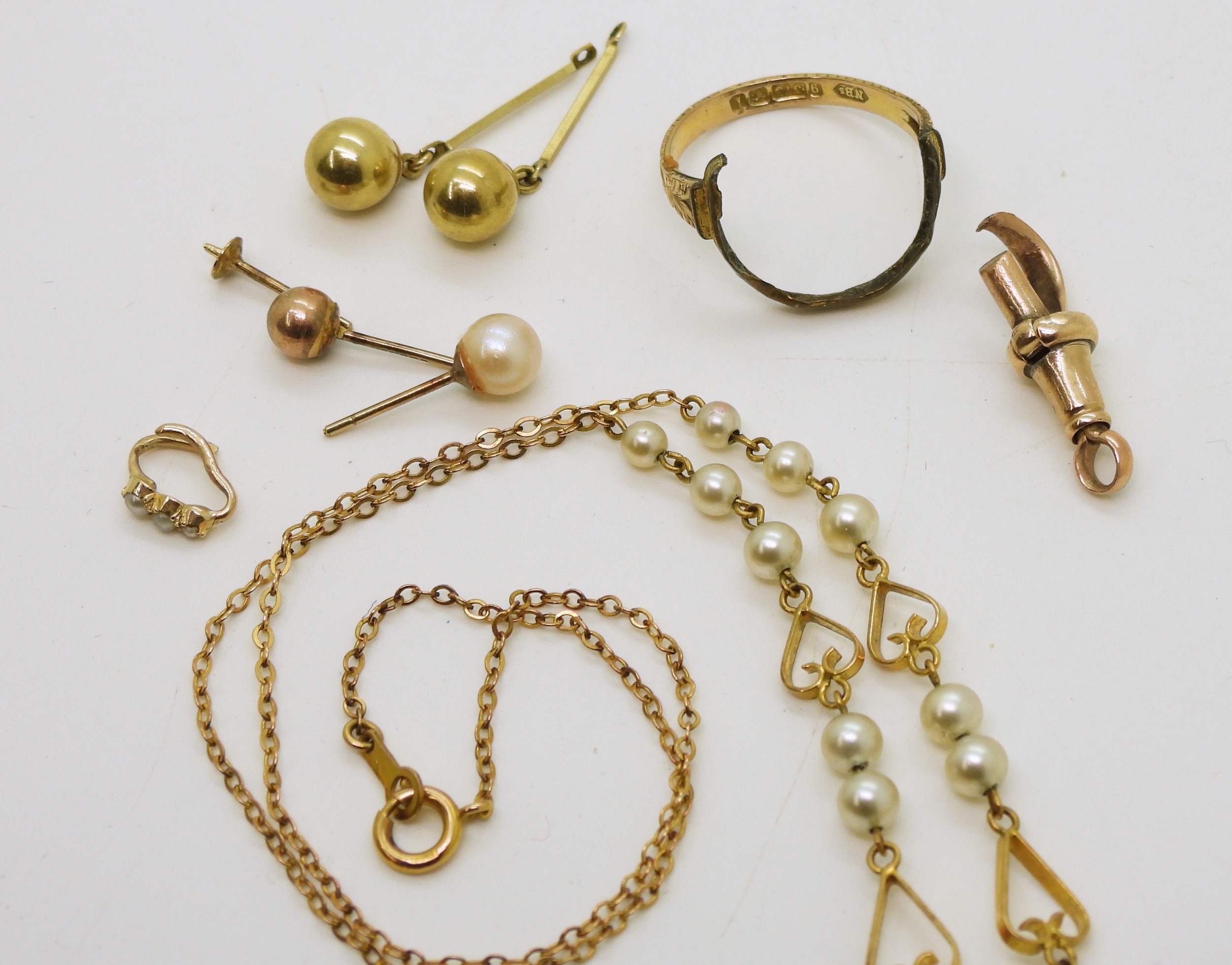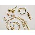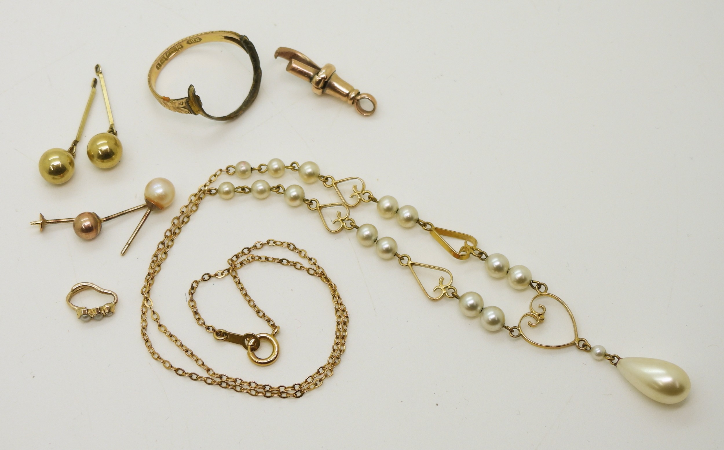 A 9ct gold and faux pearl necklace length 41cm, weight 4.7gms, and a collection of (af) partial ring, odd earrings, bails, lobster claw weight together 5gms