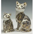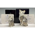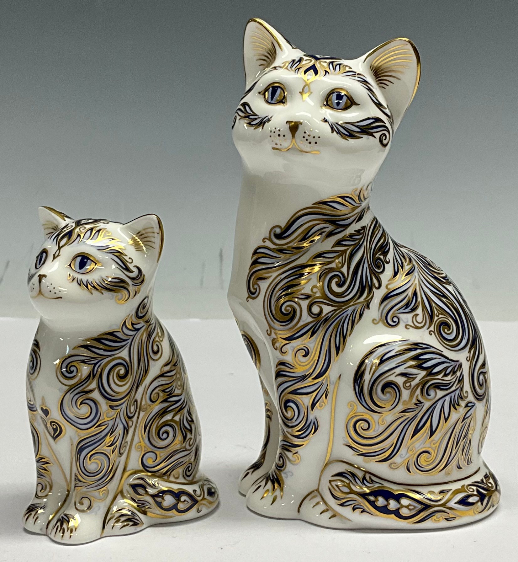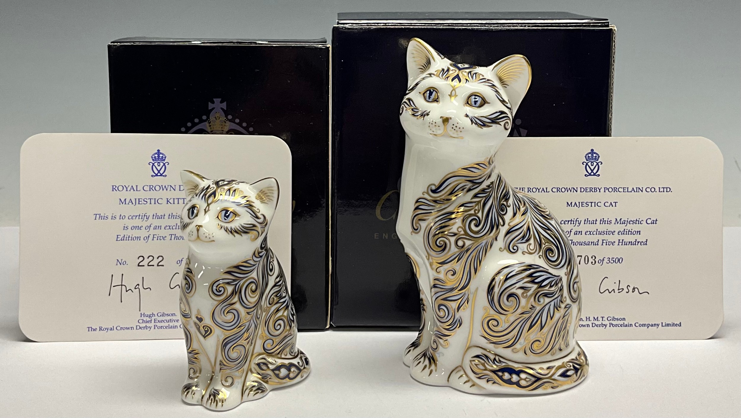 An associated pair of Royal Crown Derby paperweights, Majestic Cat, exclusive limited edition, 2,703/3,500, gold stopper, 13cm high, printed mark in red, certificate, boxed; Majestic Kitten, gold stopper, 8cm, printed mark, certificate, boxed (2)