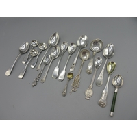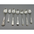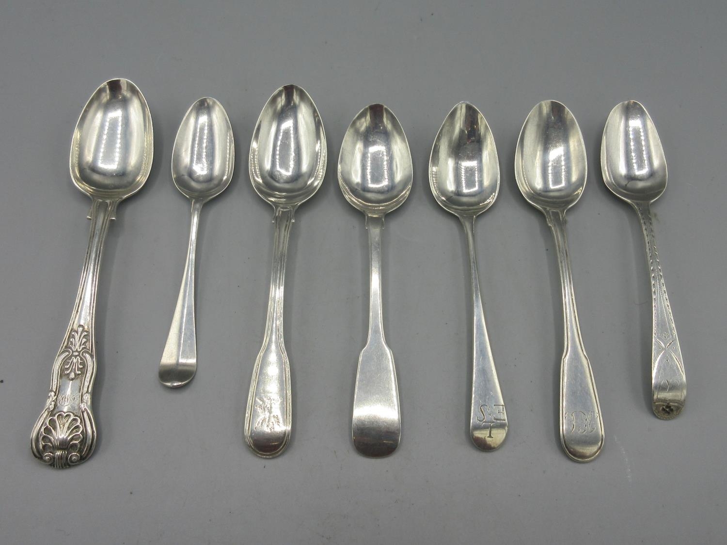 Georgian silver monogrammed teaspoon with engraved pattern, London 1804, Georgian silver monogrammed dessert spoon in kings pattern by William Eaton, London 1829, and five other Georgian silver spoons, 4.1ozt