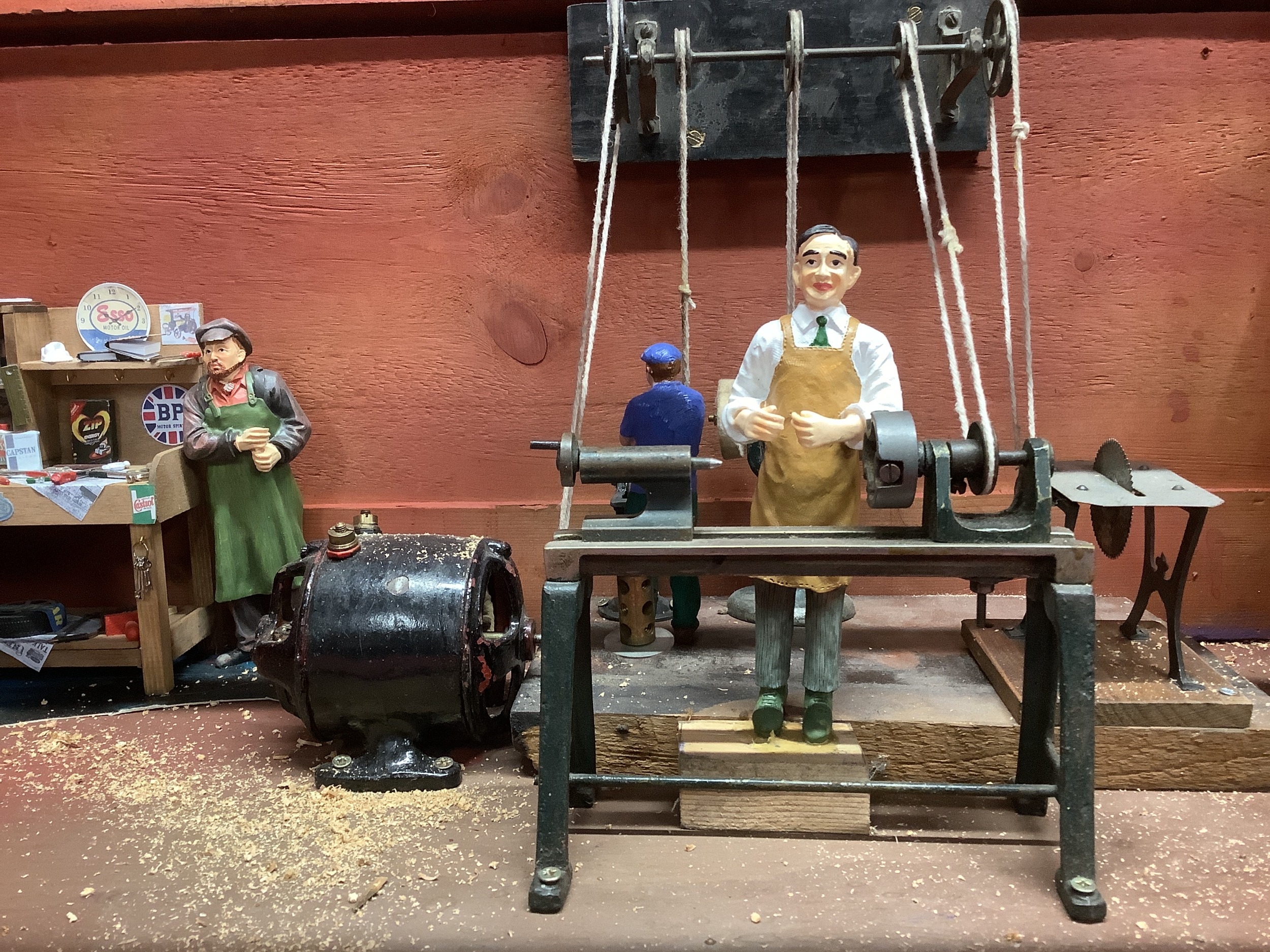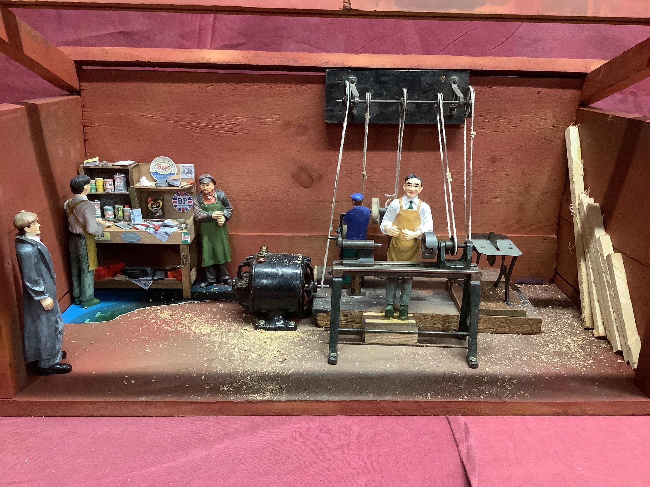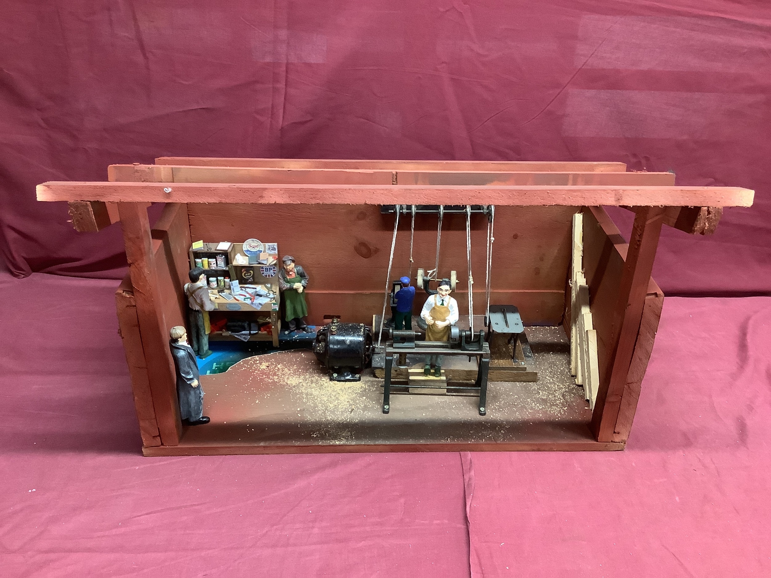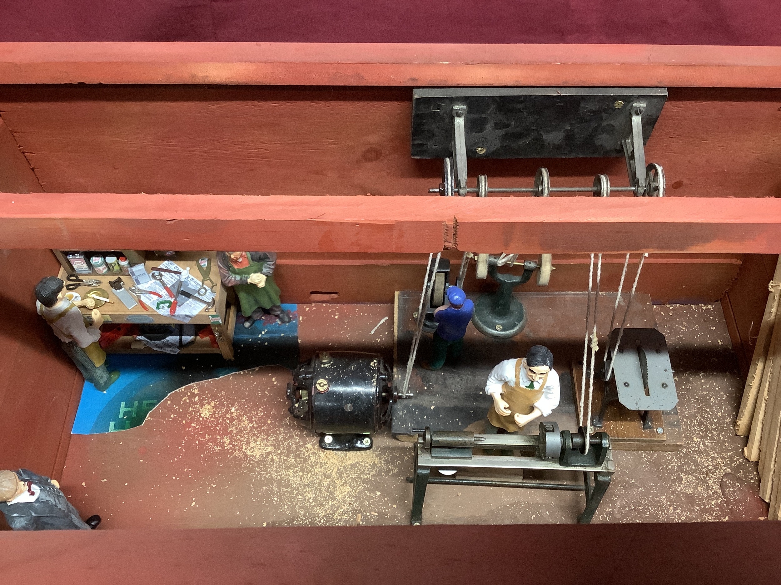 A Scratch Built Live Steam Working Model of a Workshop, consisting of lathe, circular saw, polishing wheels, grinding and electric motor, all well presented in a wooden diorama with work bench and figures, overall size 62 x 28 x 40cm.
