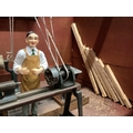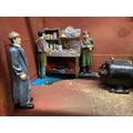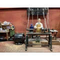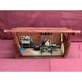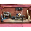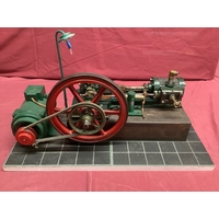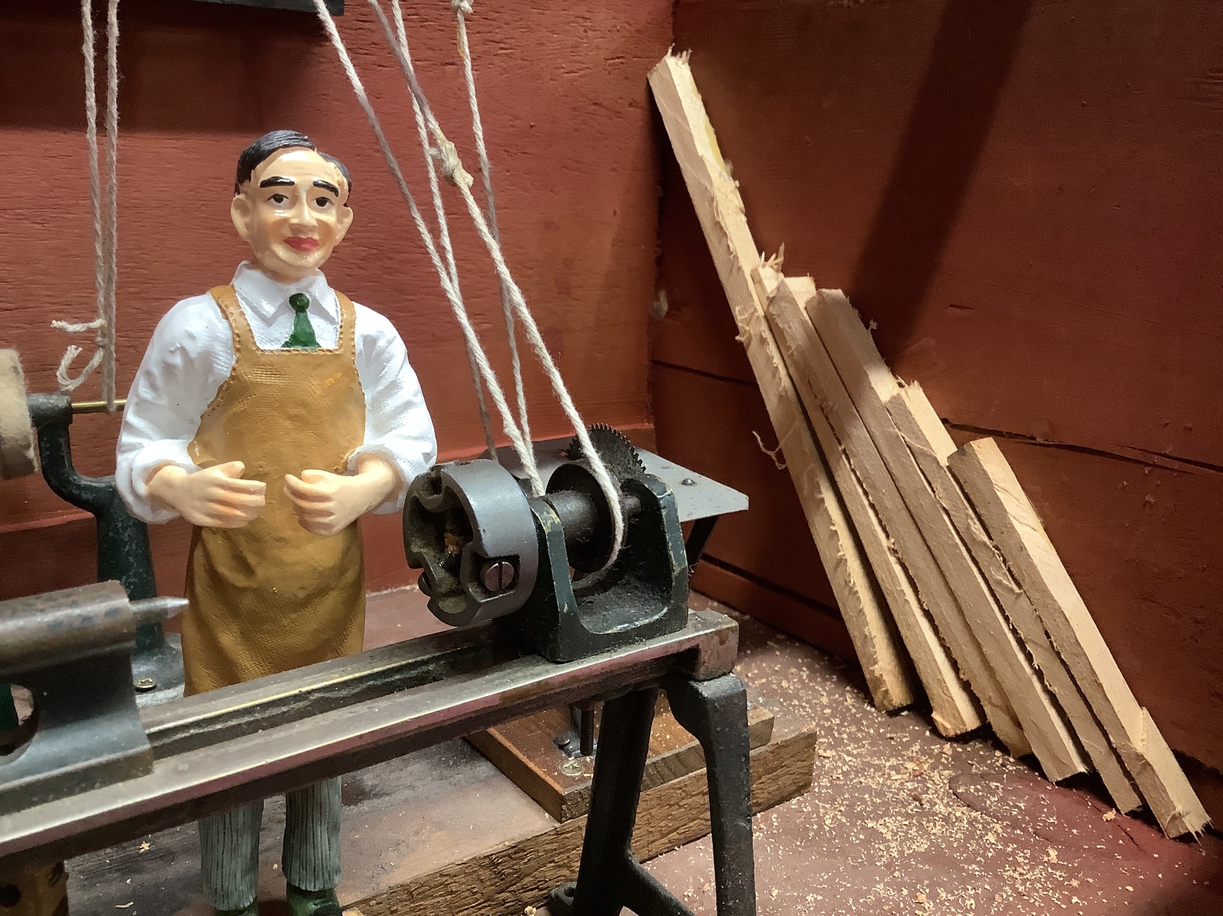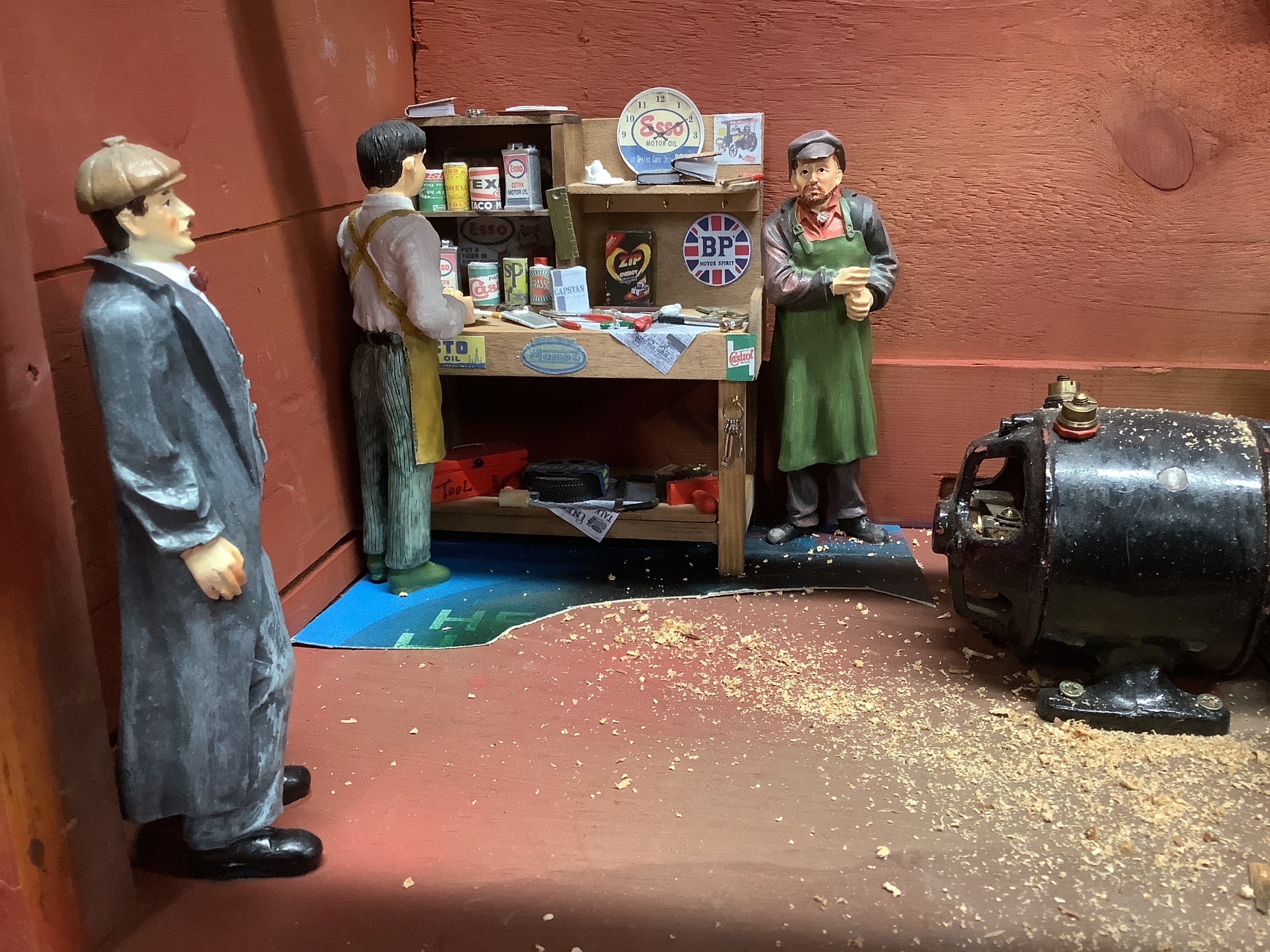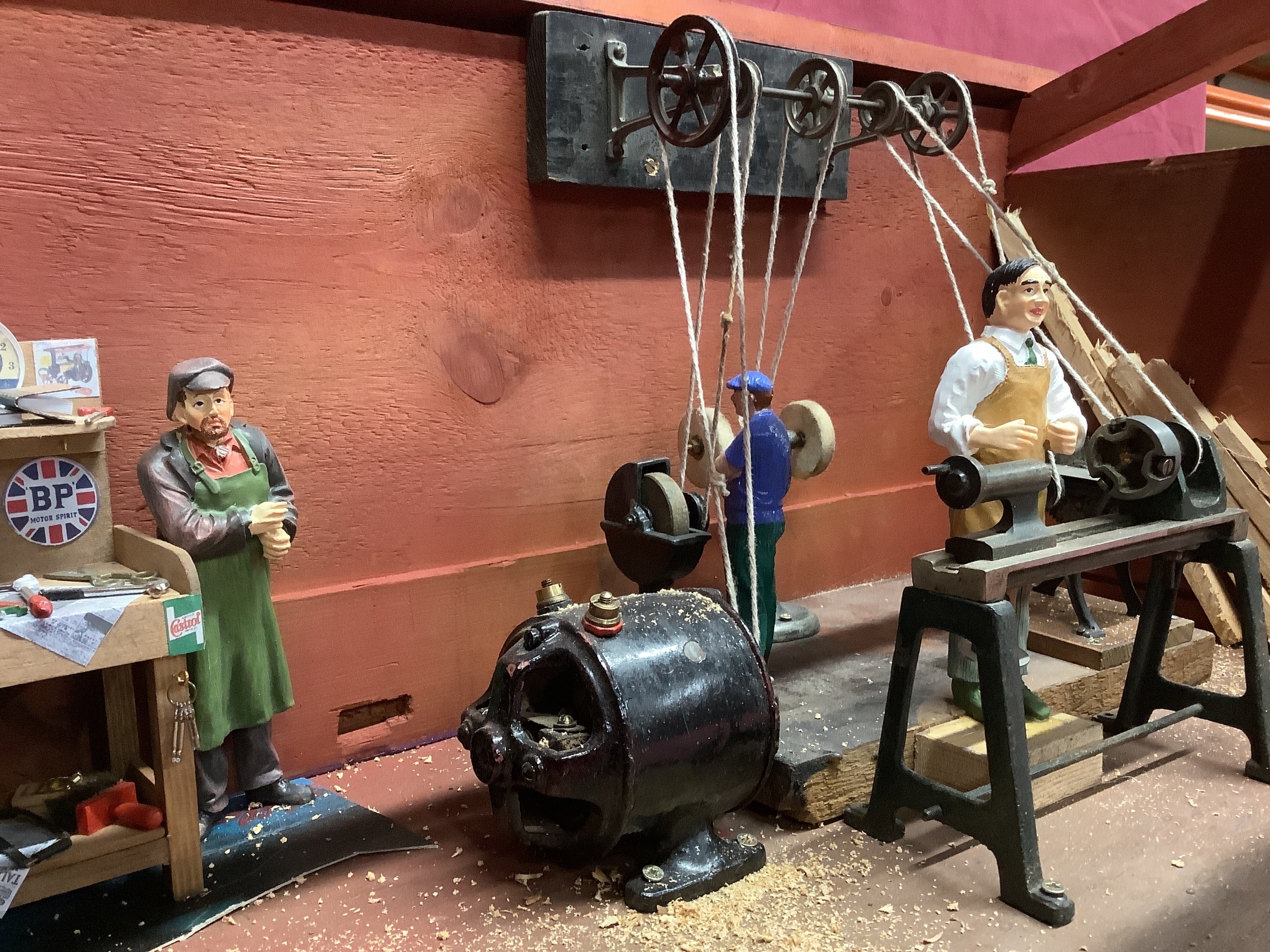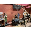 A Scratch Built Live Steam Working Model of a Workshop, consisting of lathe, circular saw, polishing wheels, grinding and electric motor, all well presented in a wooden diorama with work bench and figures, overall size 62 x 28 x 40cm.