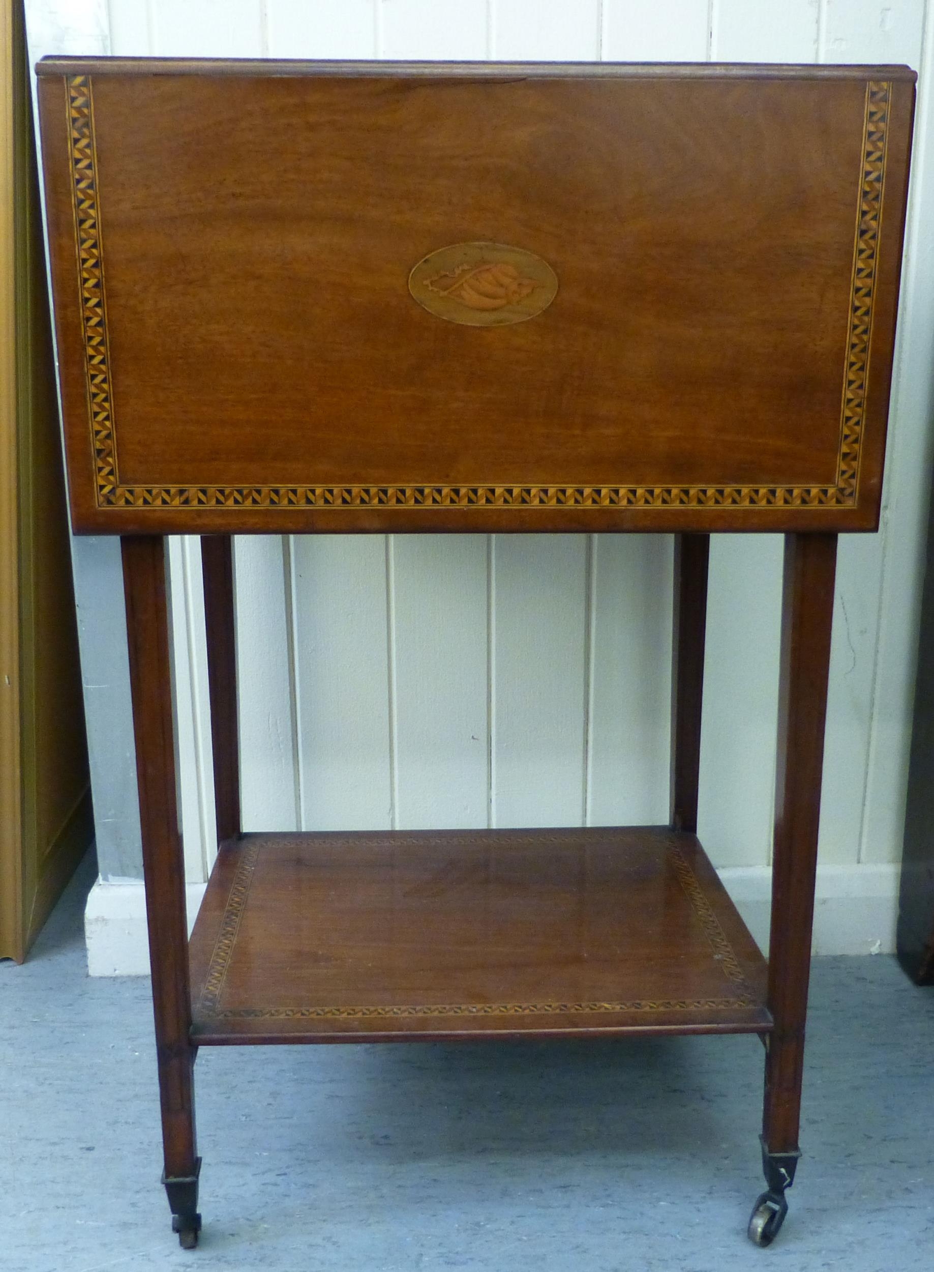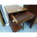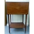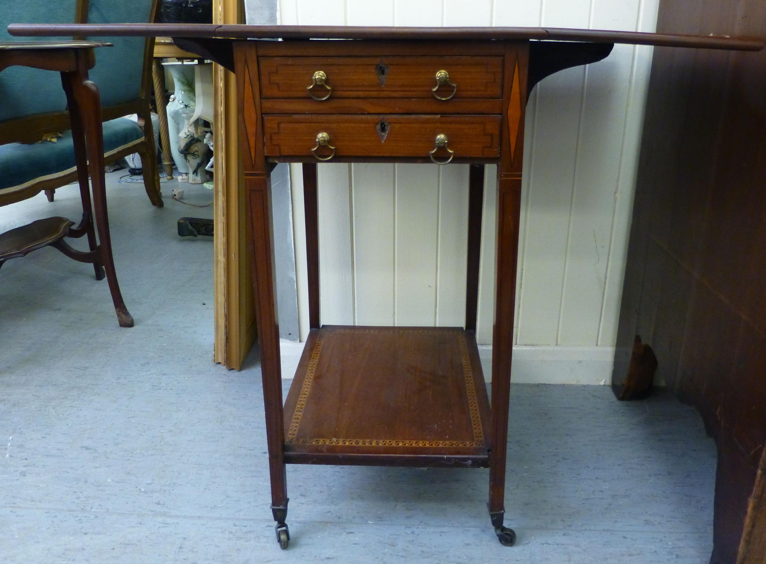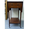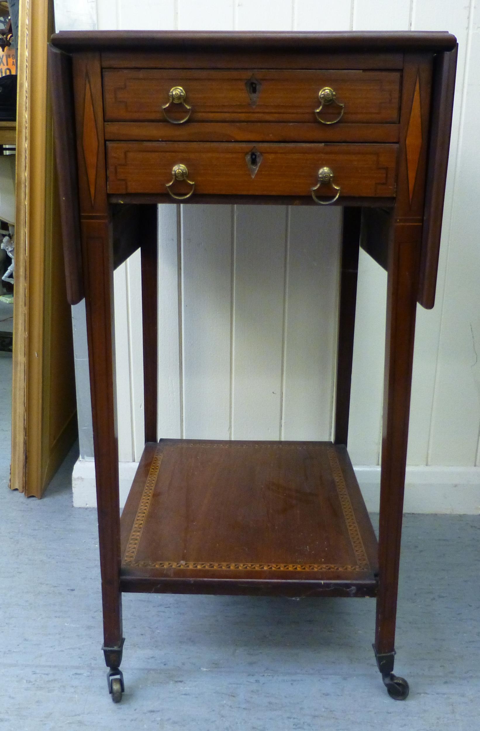 An Edwardian satinwood inlaid mahogany work table with fall flaps and two drawers, raised on square, tapered legs 29"h 14"w