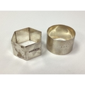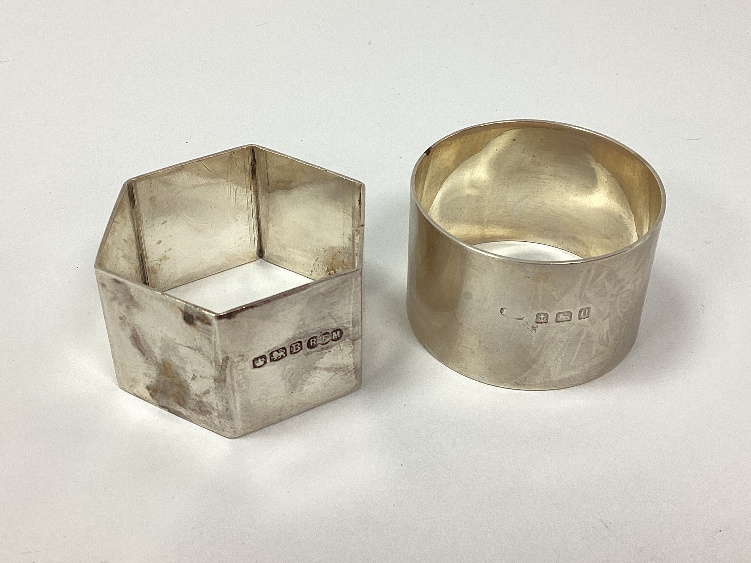 A Hallmarked Silver Hexagonal Napkin Ring, of plain design, R F Mosley & Co, Sheffield 1944; Together with A Circular Example, Birmingham 1919. (2) (Total weight 65grams)