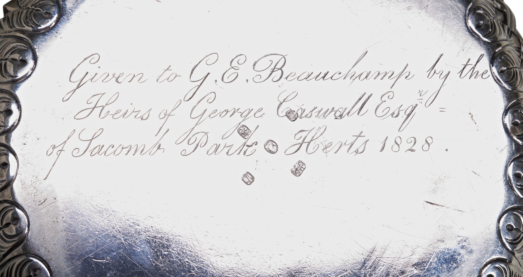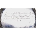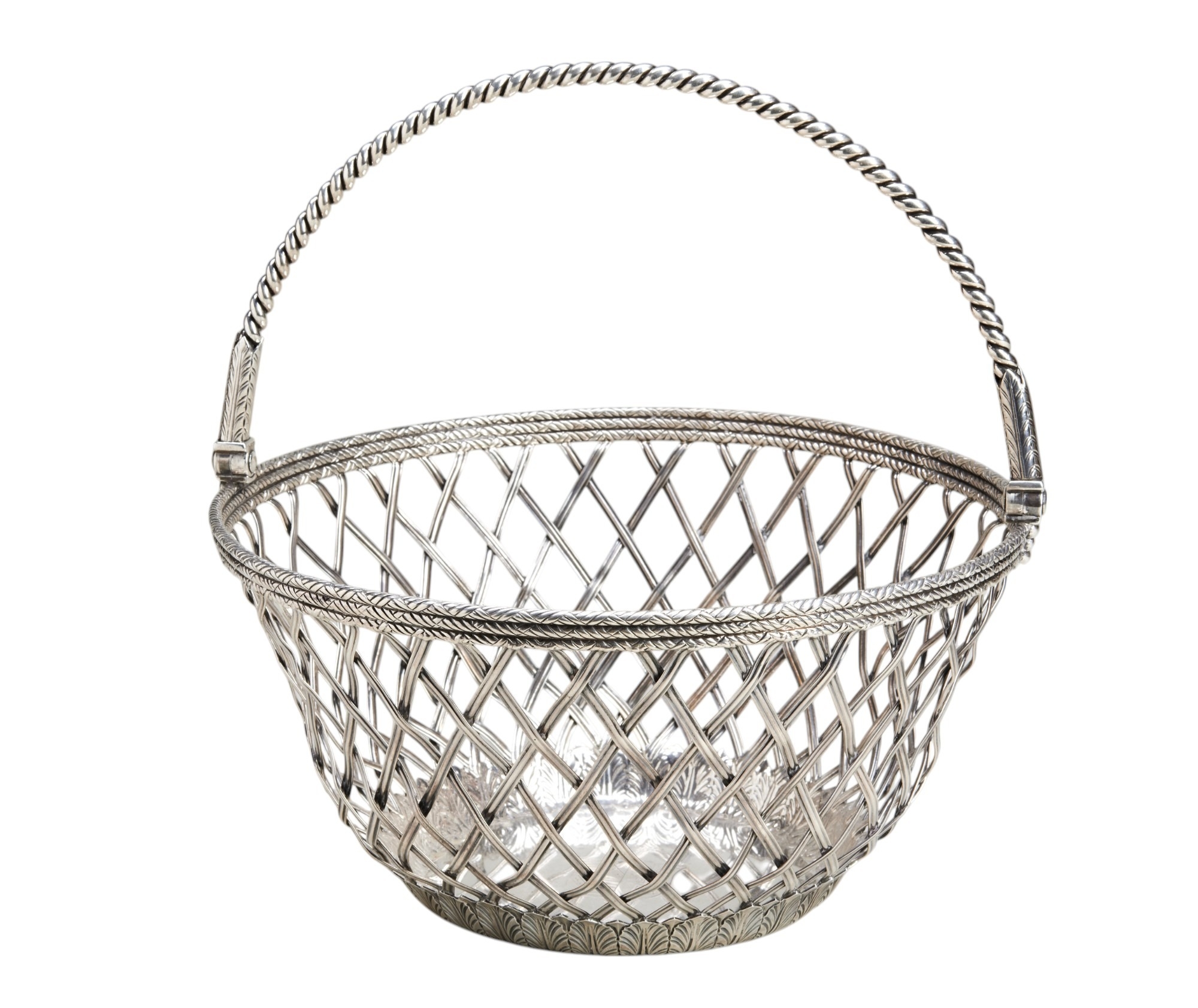 An unusual wire work cake basket made in 1792 by Wakelin & Taylor. Engraved to the inner base with a full coat of arms and crest (Caswell) and inscribed to the underneath with a later dedication inscription also suggesting that the basket originally belonged to George Caswell