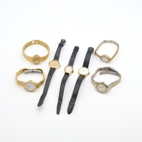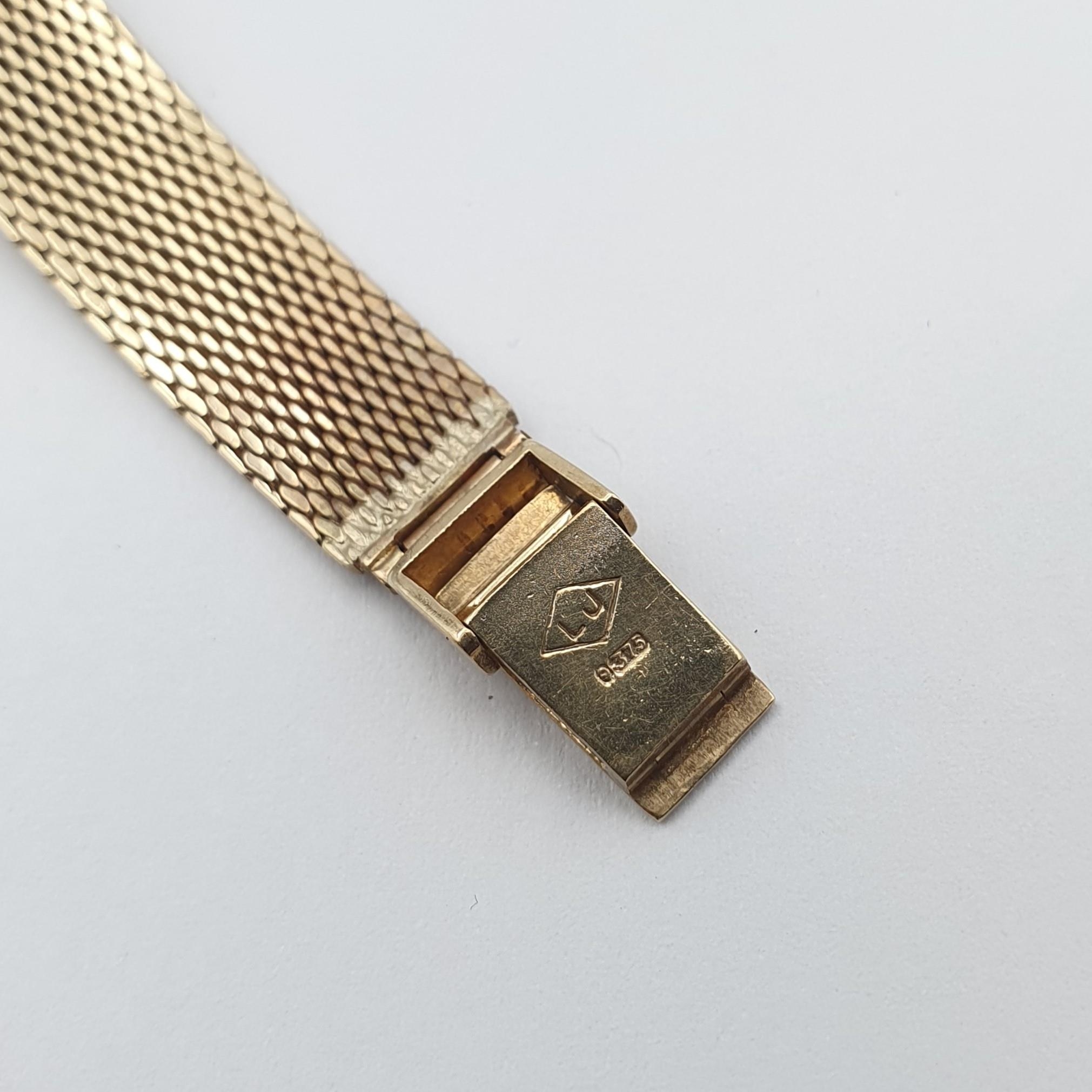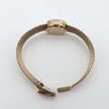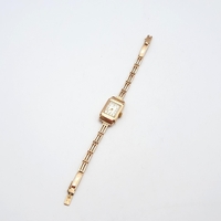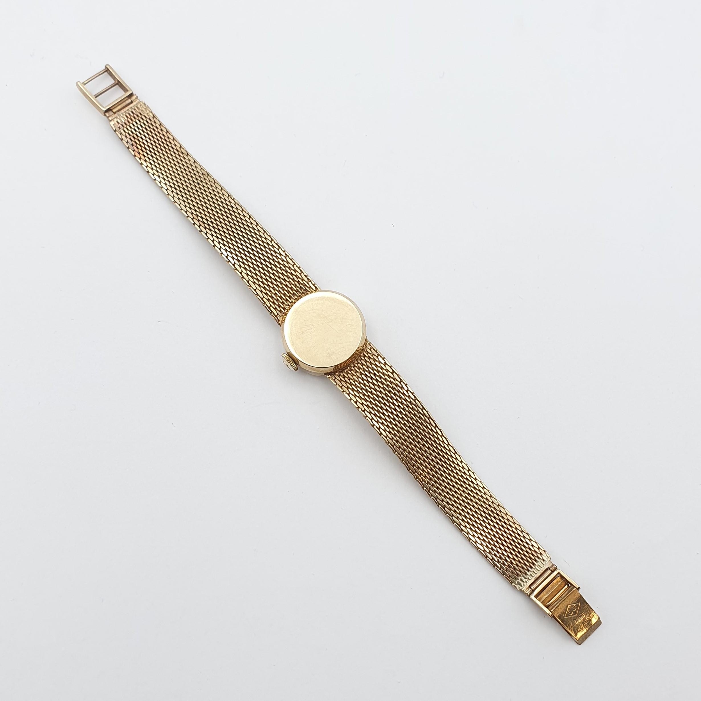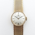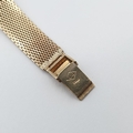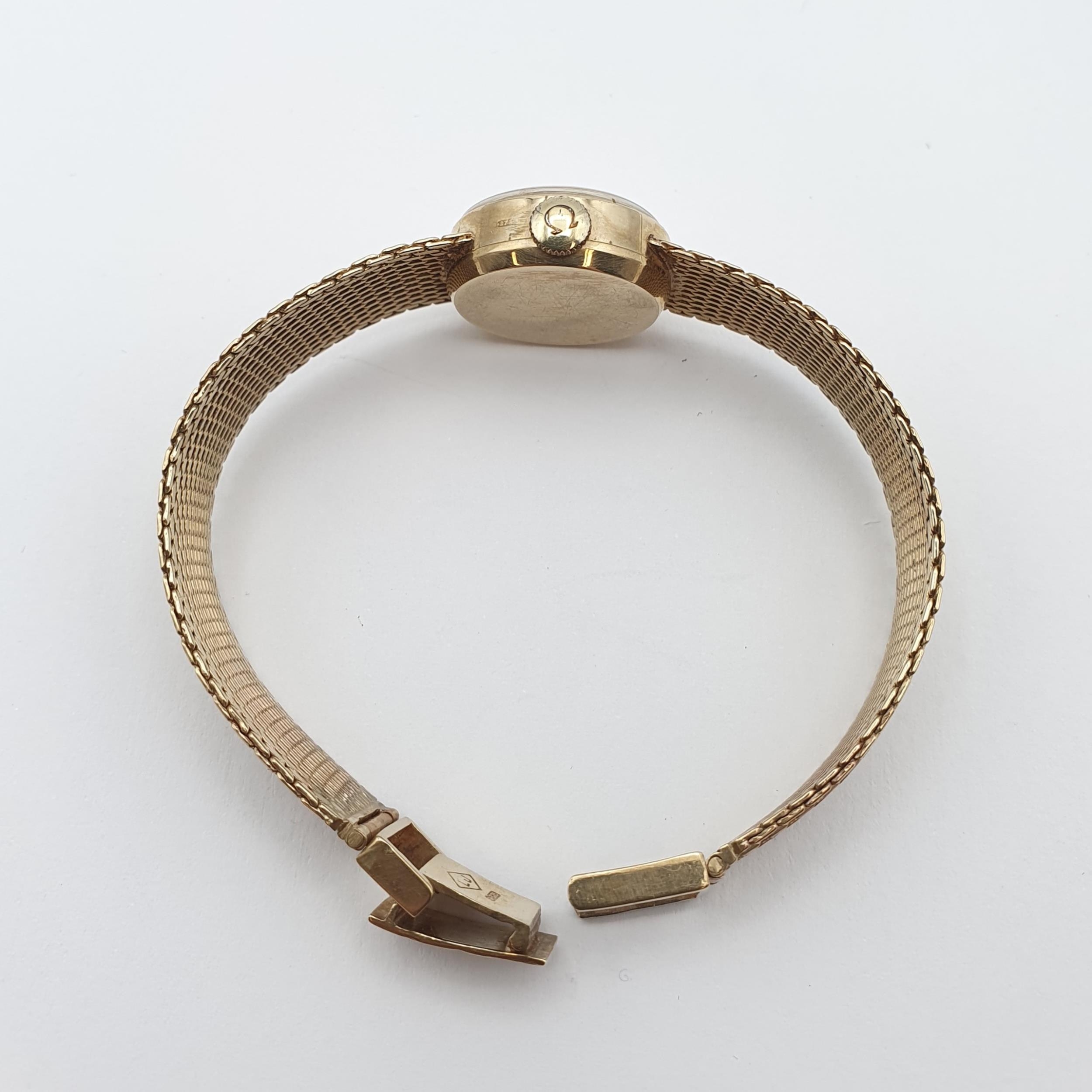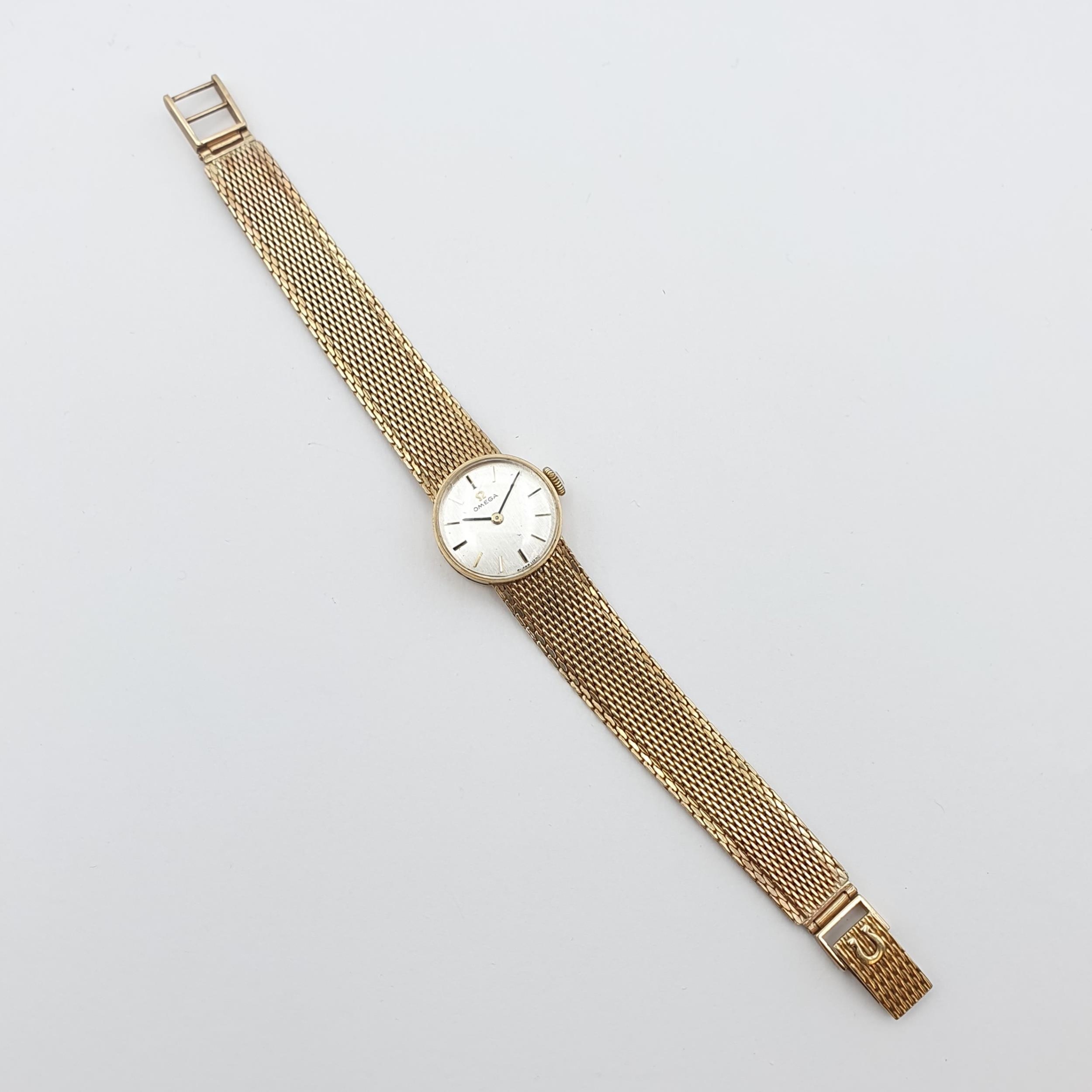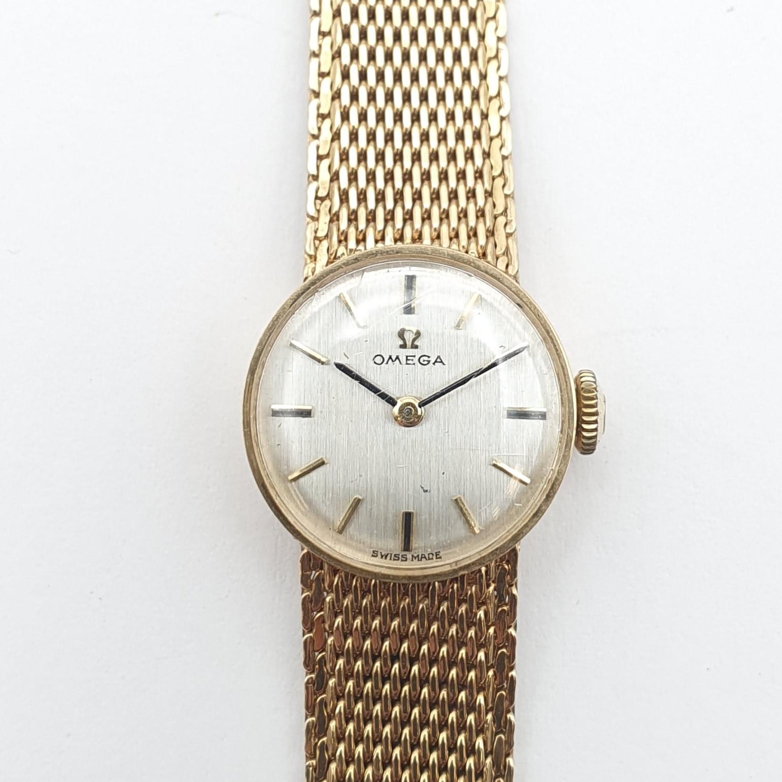 OMEGA. A lady's Omega manual wind Wristwatch the brushed silvered dial with hourly baton markers in 9ct gold case, case width approx 17mm on integral flexible woven 9ct gold bracelet, approx 20gms