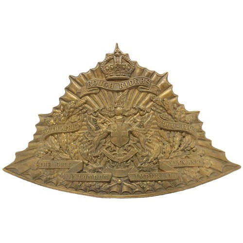 Cap badge collection mounted on foam in home made glass display draw, including Malta Regt, KSLI, DLI, RHG, Royal Marines incl RM Labour Corps, RWF, KRRC, IOW Rifles, cavalry etc in mixed condition, some copies noted. Plus city of London Imperial Yeomanry lance cap plate, KC, Rough Riders in scroll below crown, battle honours South Africa and 1900-1902 in scrolls either side of central badge, The City of London Imperial Yeomanry in scroll below, 2 screw posts, no nuts, minor verdi gris to reverse, otherwise extremely fine. Draw will not be posted but badges easily removed for posting. Qty 65 (2B)