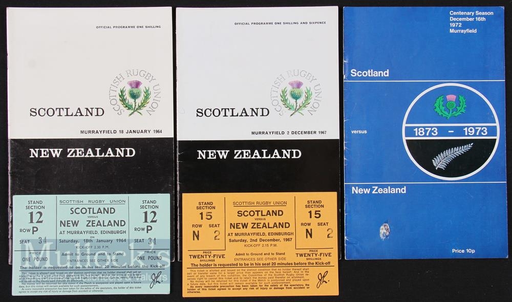 Scotland v New Zealand Rugby Programmes & Tickets (5): Magazine style issues for the Murrayfield games of 1964, 1967 (Meads dismissal, both with ticket) &1972 (Centenary). VG
