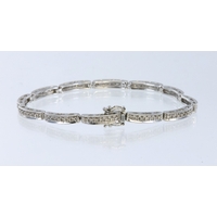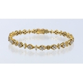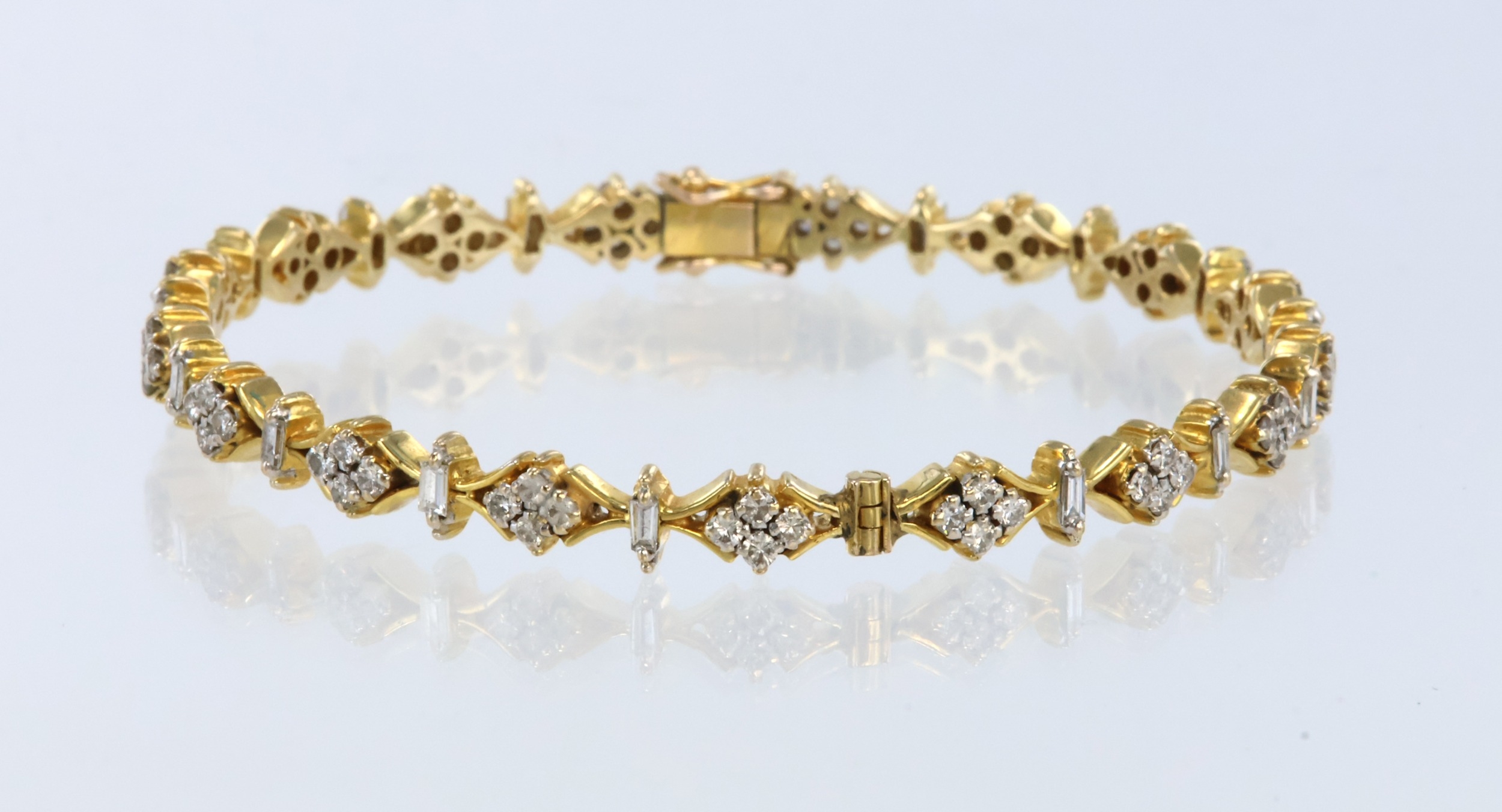 Yellow metal (tests 18ct) solid hinged bangle with box clasp and double safety catch, set with clusters of four round brilliant cut diamonds spaced by single baguette cuts, sixty eight round brilliant cuts, fifteen baguette cuts, total diamond weight approx. 0.50ct, matched stones approx. colour H/I approx. clarity SI1/2, weight 20.9g