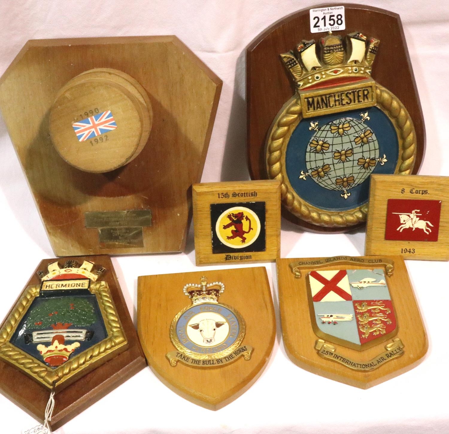 Large Manchester Regiment wall plaque, H: 28 cm, with five further wall plaques (6). P&P Group 2 (£18+VAT for the first lot and £3+VAT for subsequent lots)