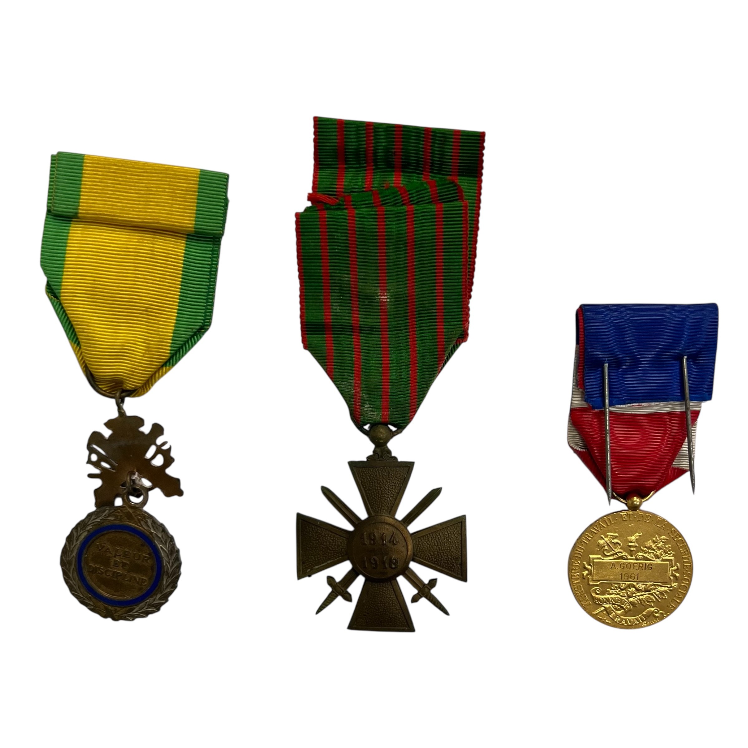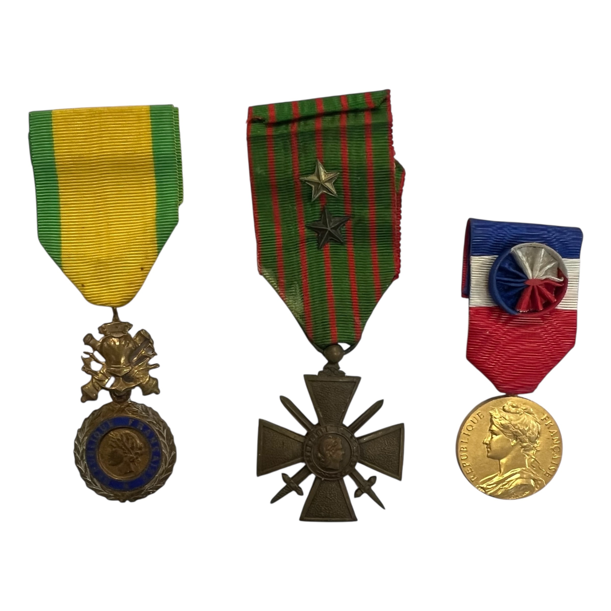 France, three French medals, includes; French Médaille Militaire (Military Medal), Croix de Guerre 1914-1918 with two stars to ribbon and Médaille d’Honneur du Travail (Medal of Honor for Work). (3)