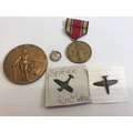 An American World War II medal. A Union National medallion and Spitfire fund badges.