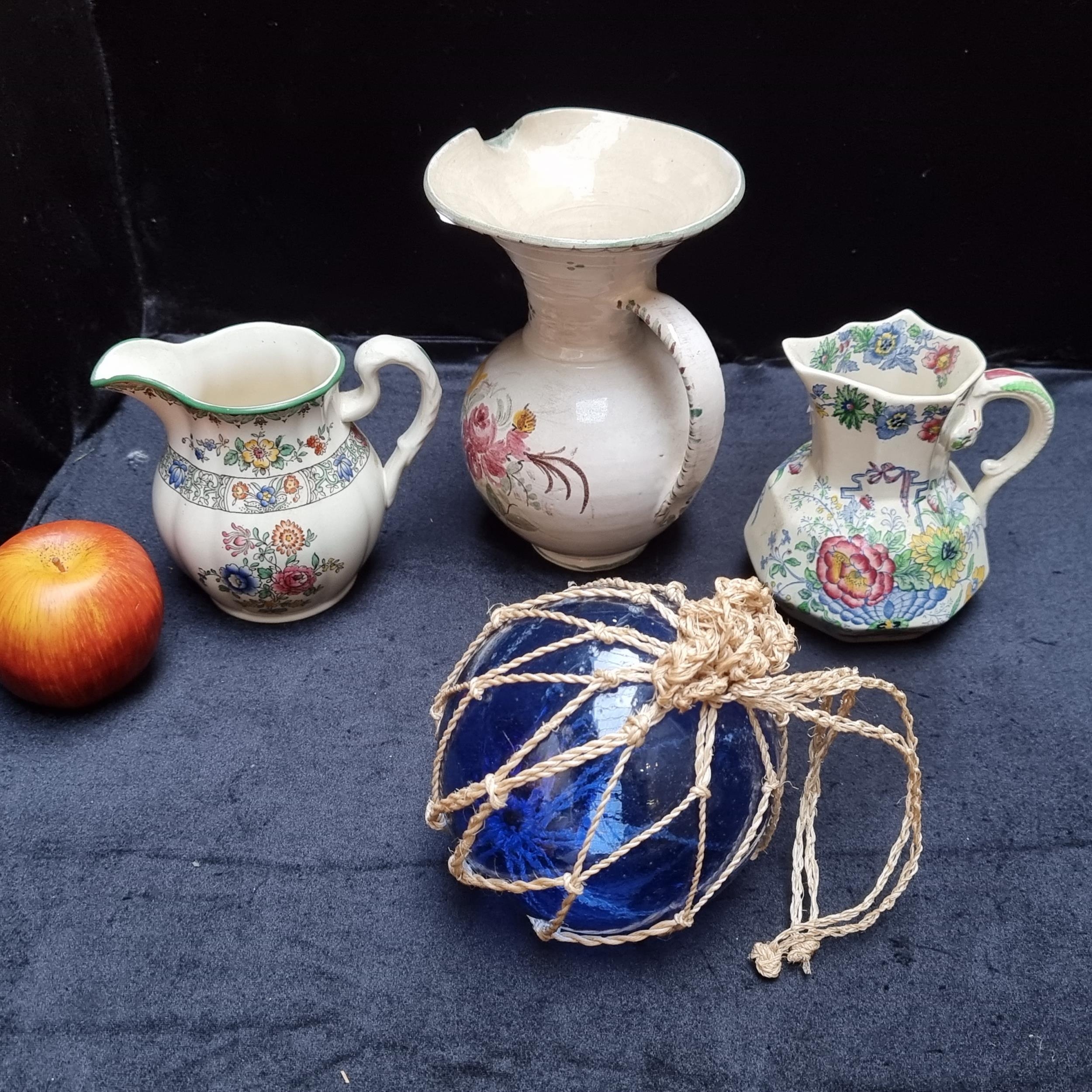 Four items including a Mason's Patent Ironstone China "Strathmore" floral pitcher and an unusually wide-brimmed Ulmer Keramik German floral pitcher and a blue handblown fishing float.