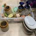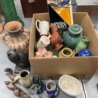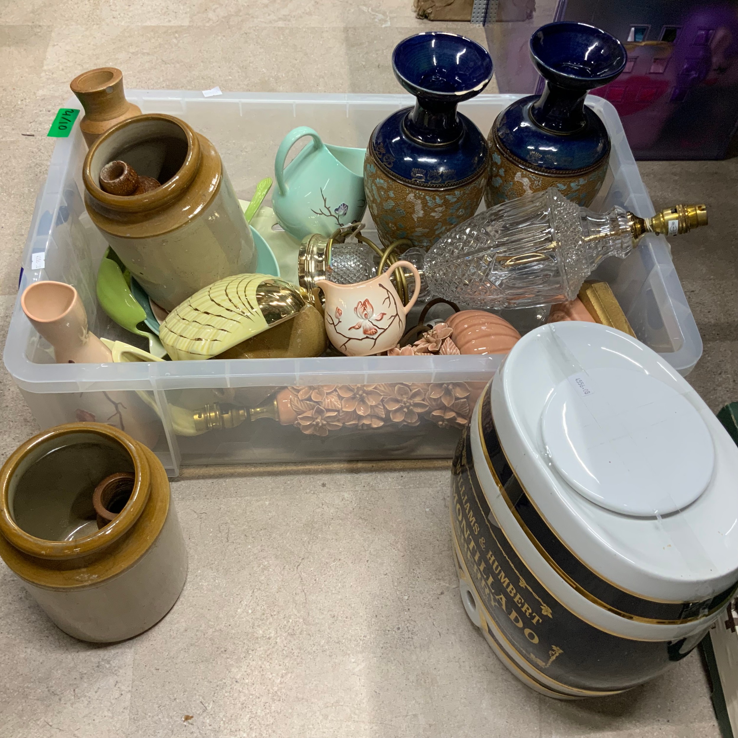 Collection of ceramics to include Carlton Ware, Doulton Lambeth vases, two lamps and Sherry dispenser and flagons.