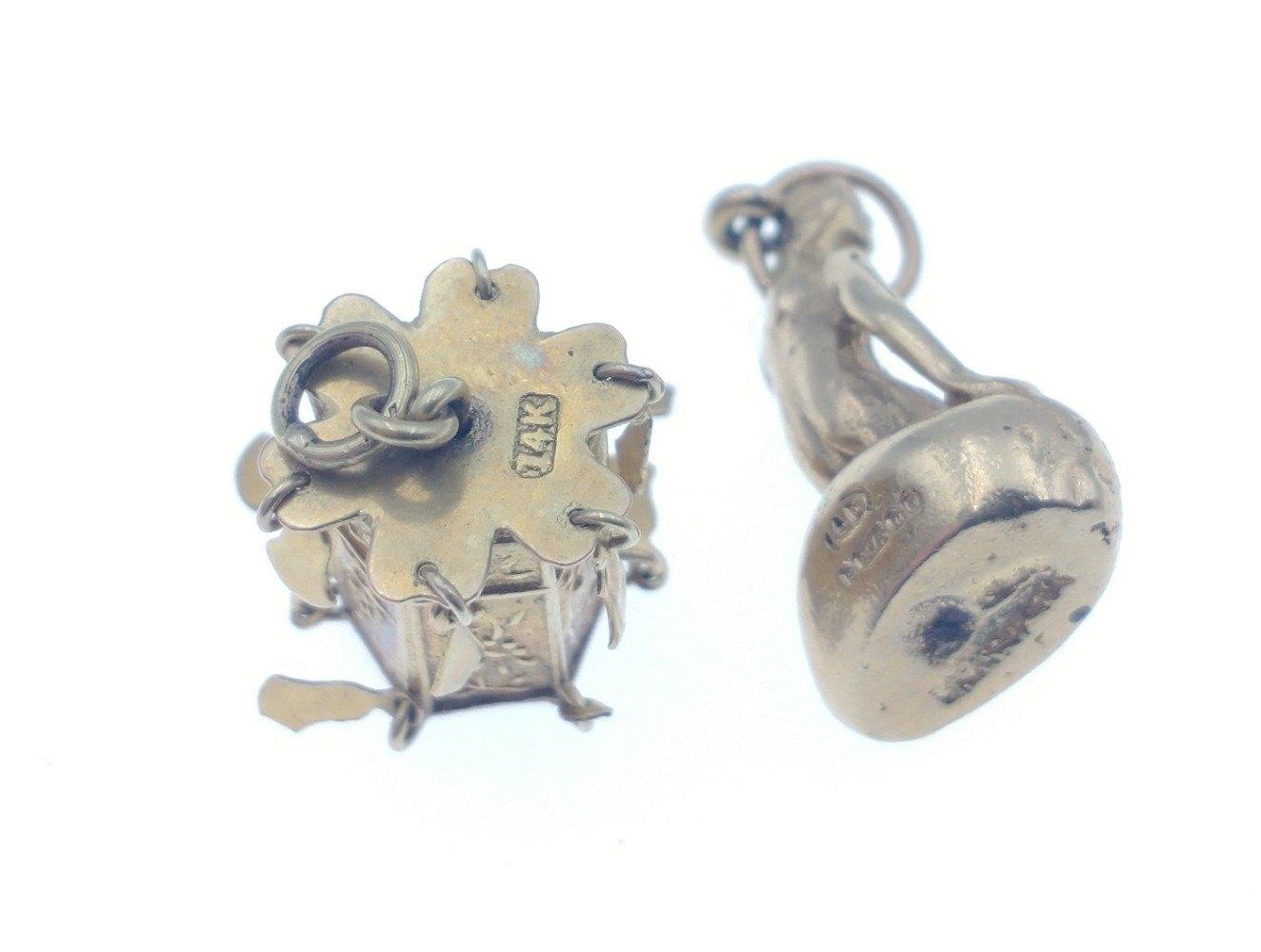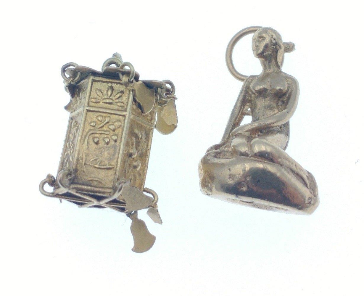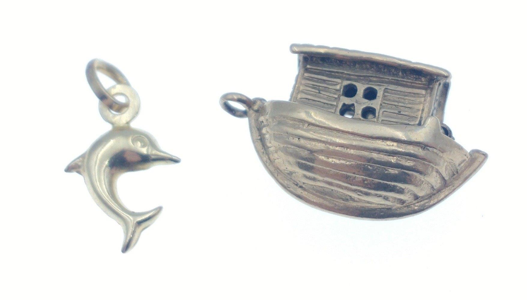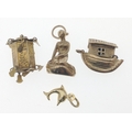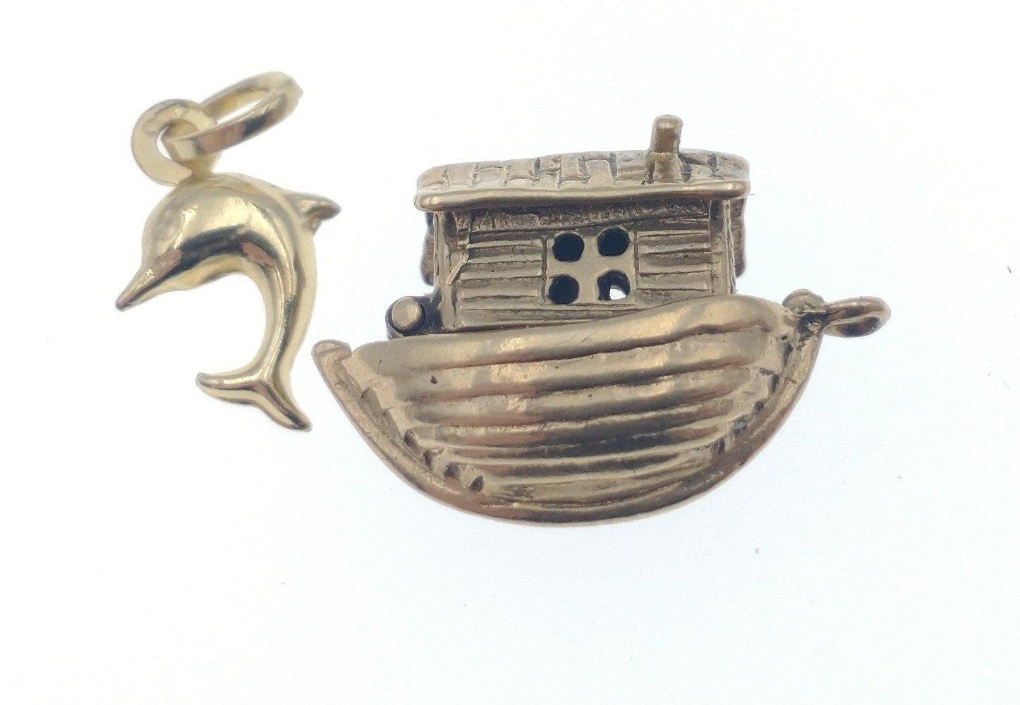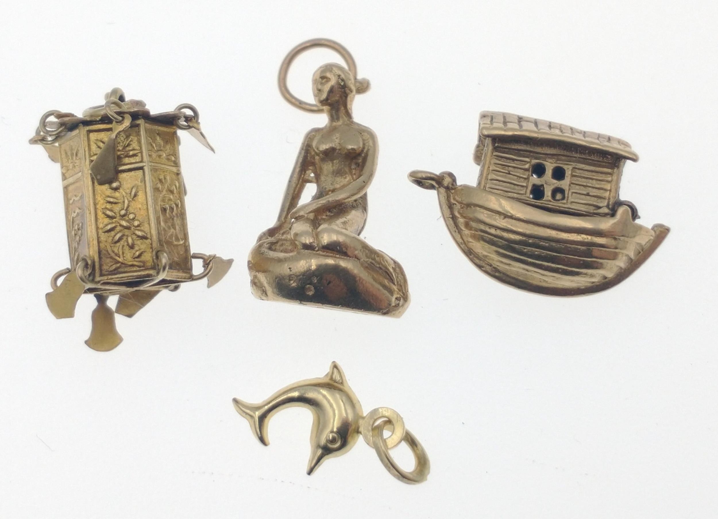 Small collection of four Hallmarked YELLOW GOLD charms to include a Dolphin, The Ark, Mermaid and a Pagoda, total weight 9.30g approx