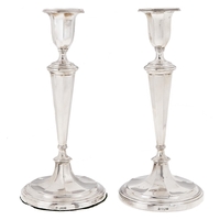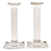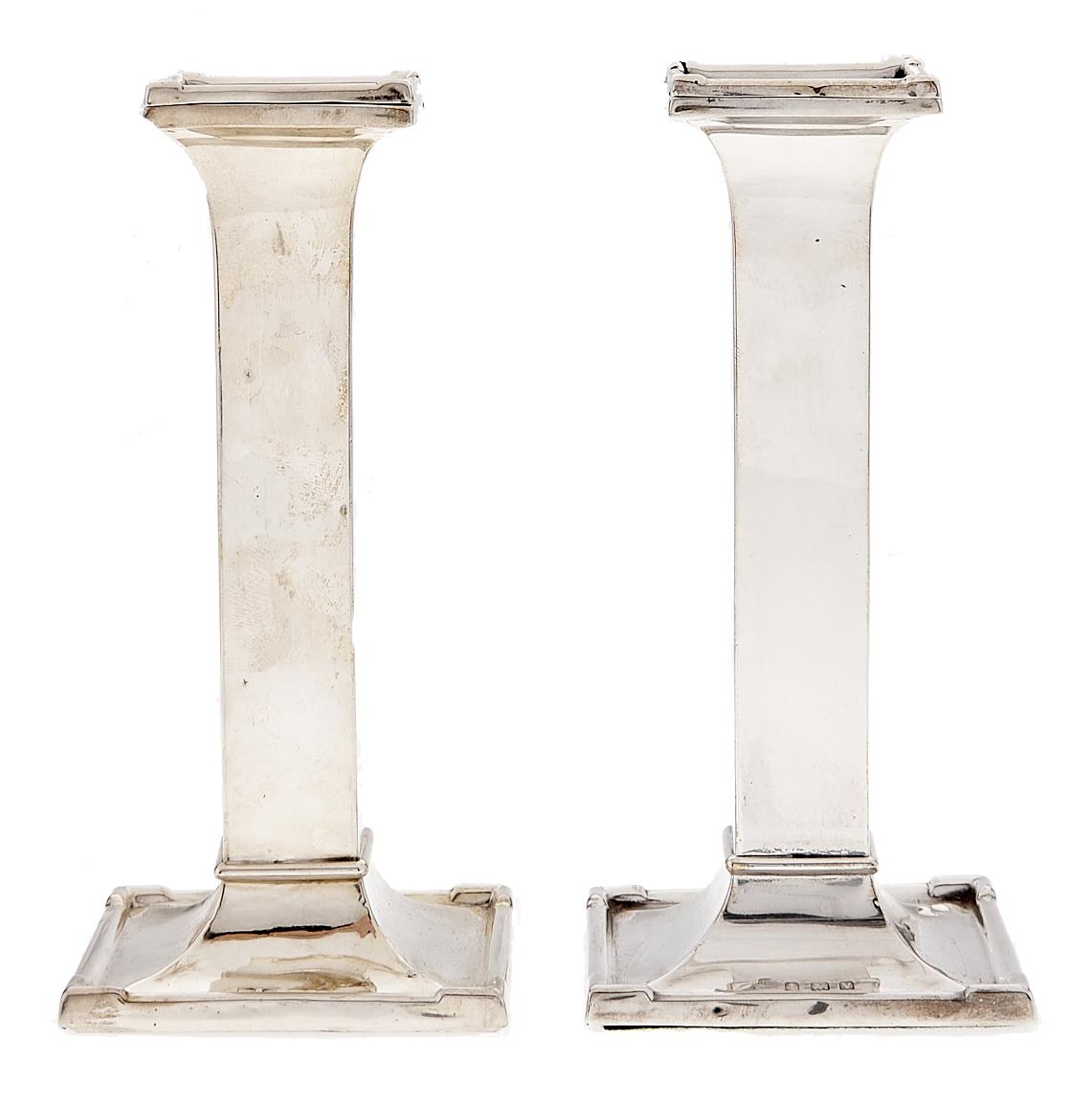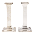 A pair of George V silver candlesticks, of plain square design on flared foot, nozzles, 15.5cm h, marks rubbed, Birmingham 1920, loaded