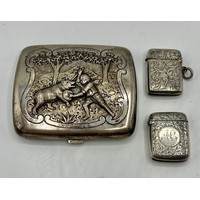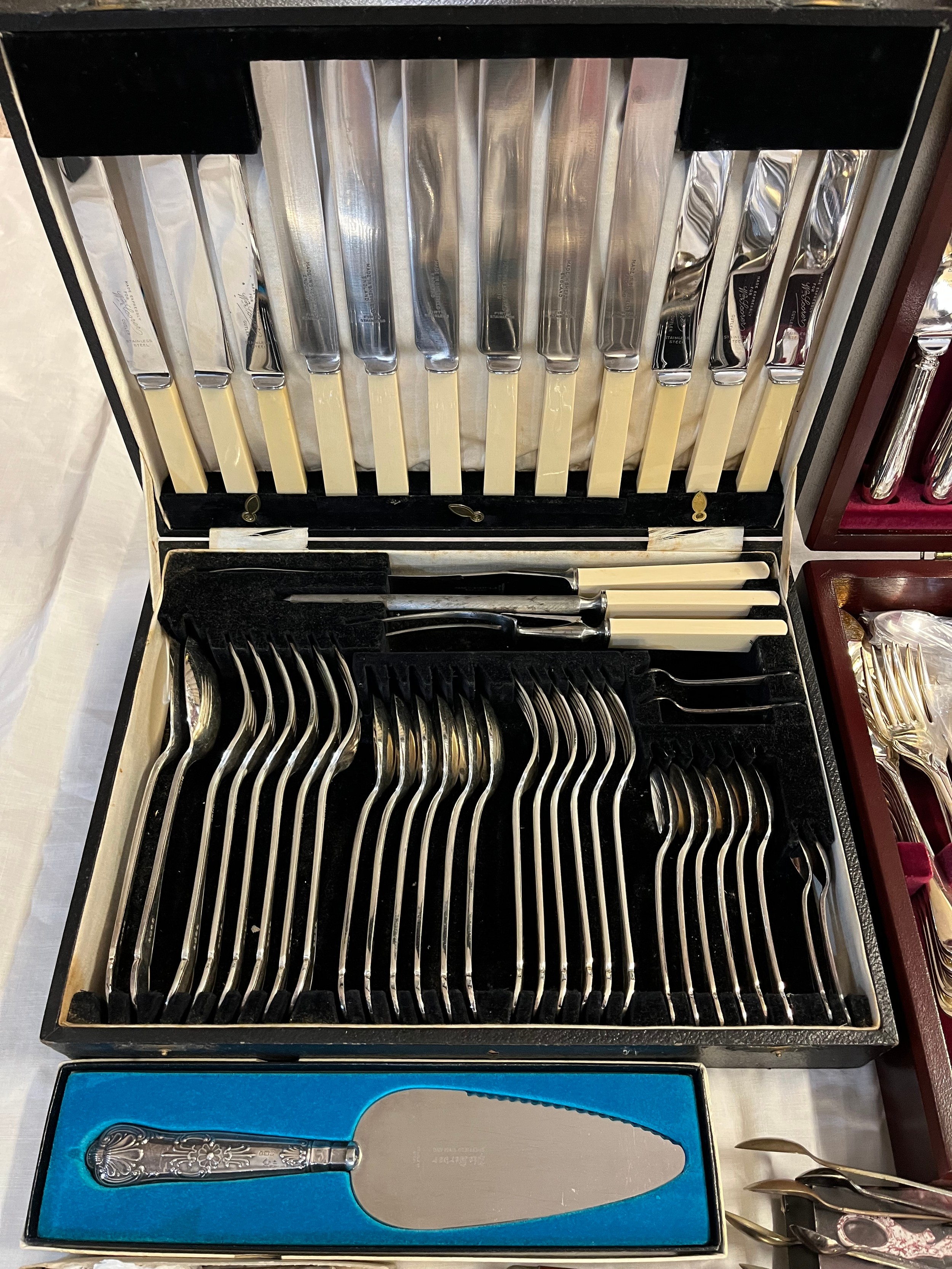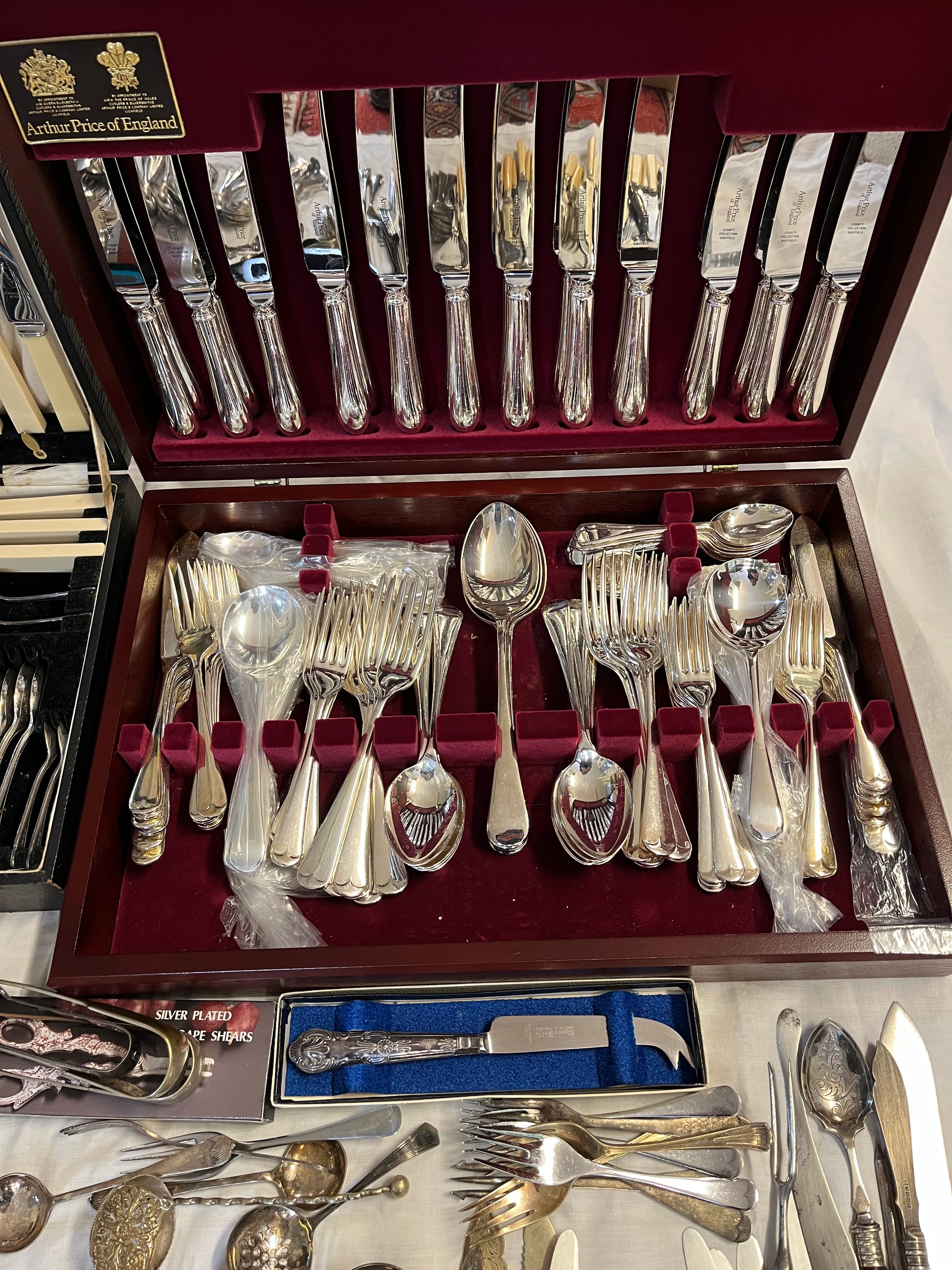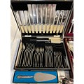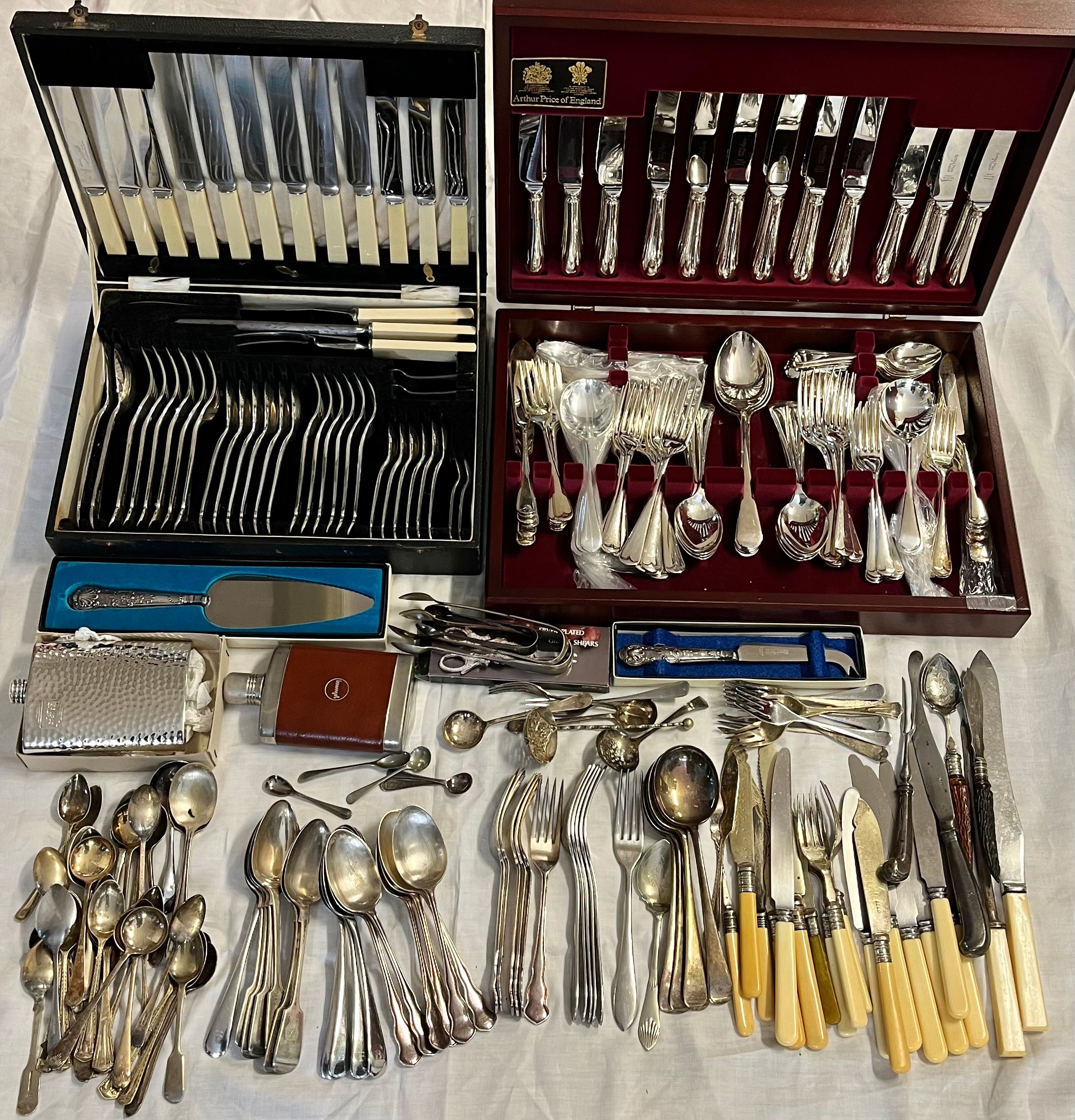 Two boxed canteens of silver plated cutlery together with other white metal items.