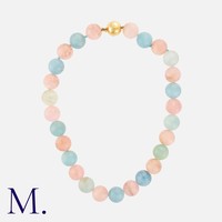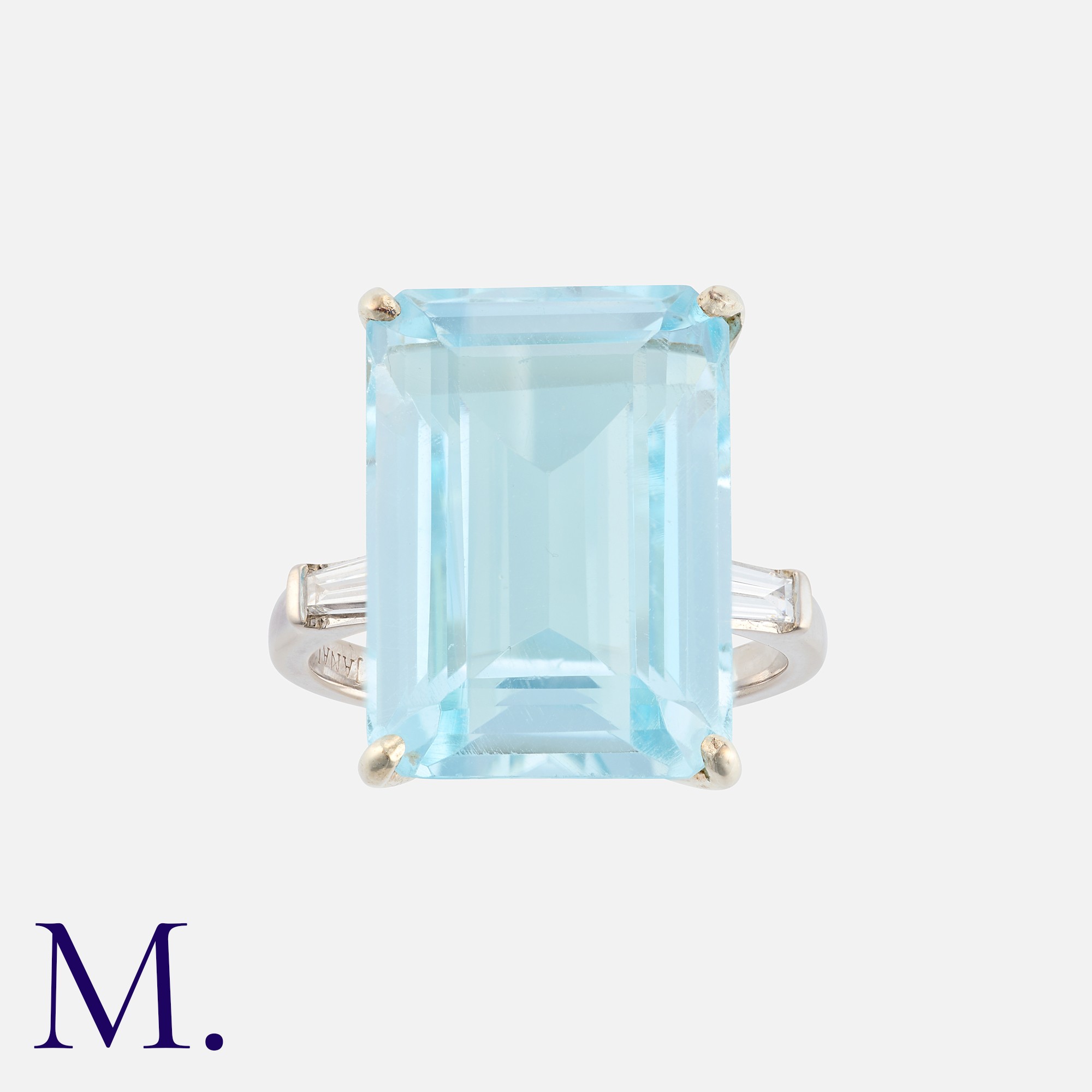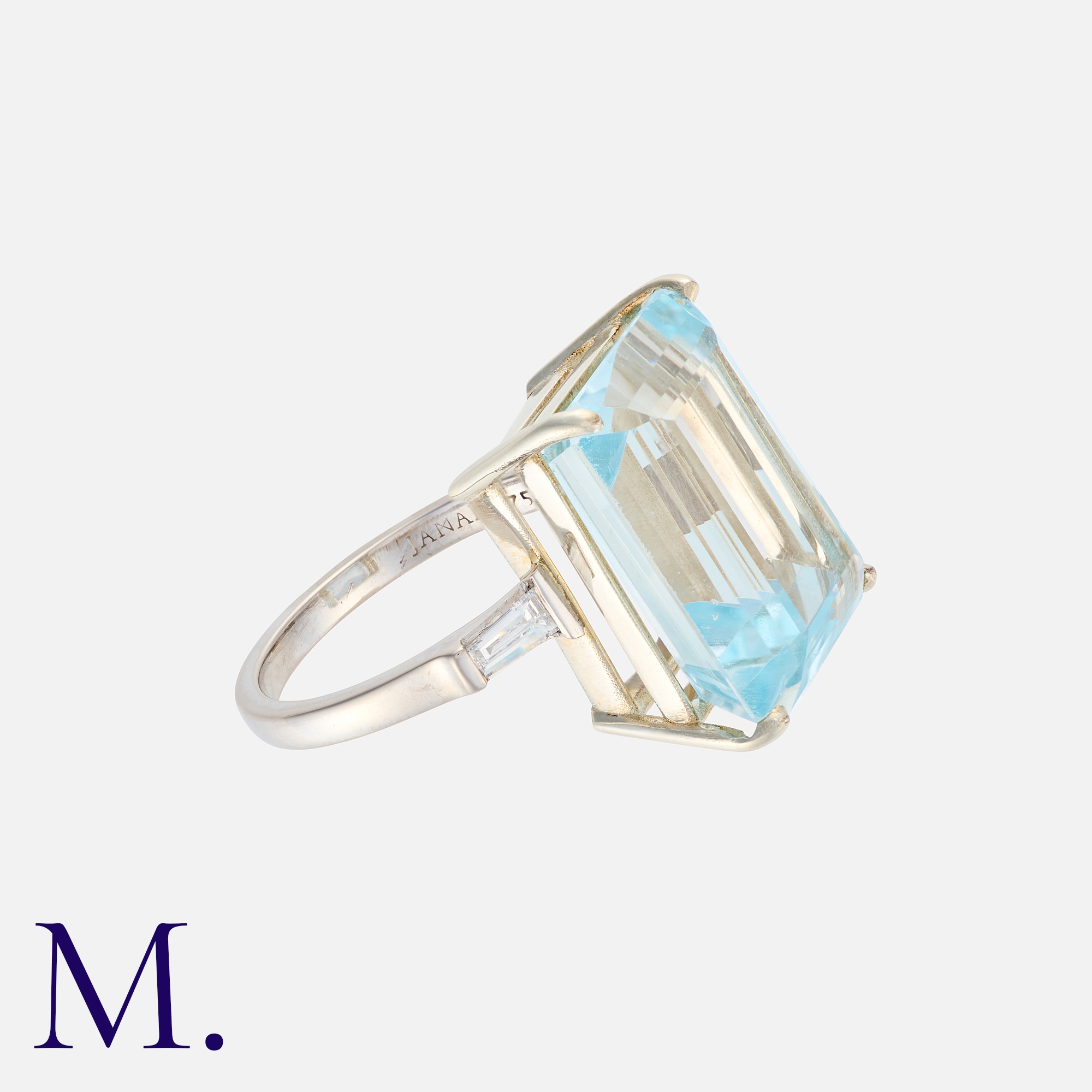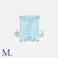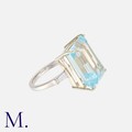 A Topaz And Diamond Ring in 18k white gold, set principally with an octagonal cut blue topaz of approximately 17.00cts, flanked either side by a tapered baguette cut sapphire. Stamped 750 for 18 carat gold, Signed JANAI.