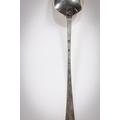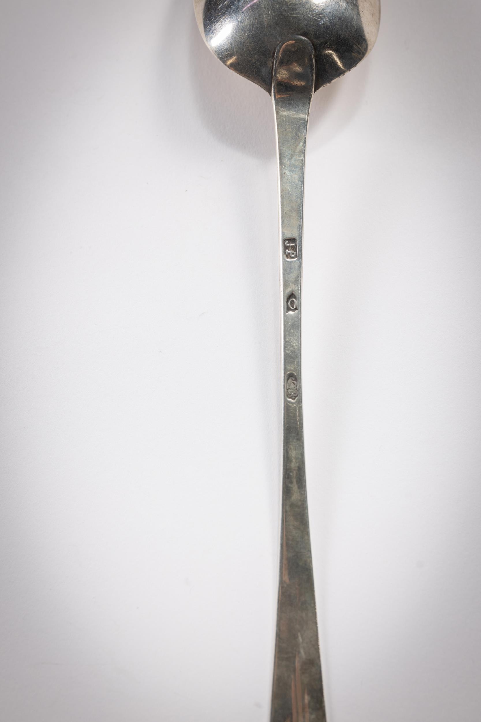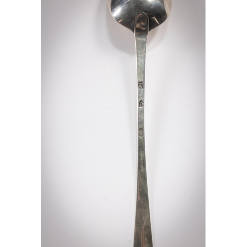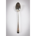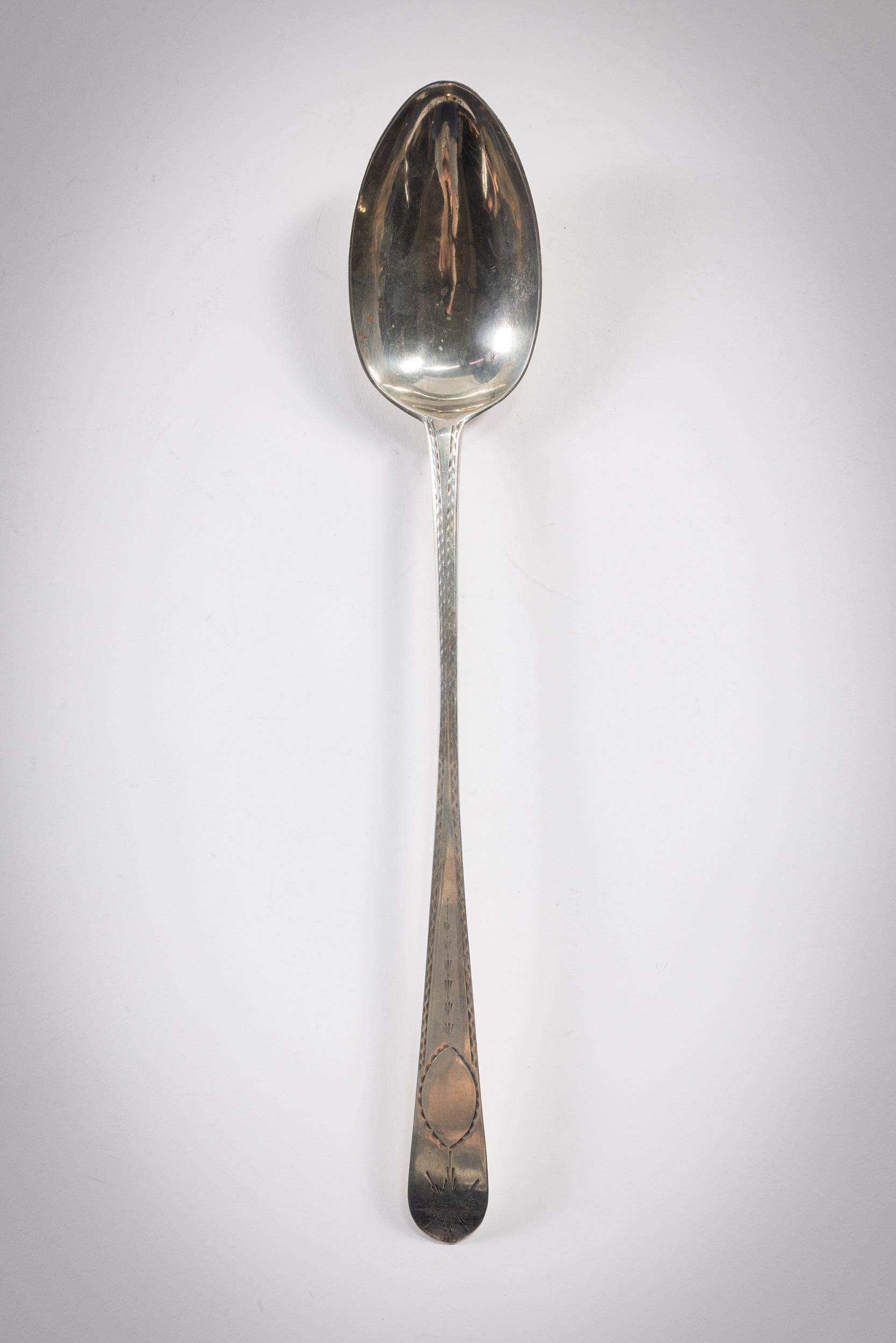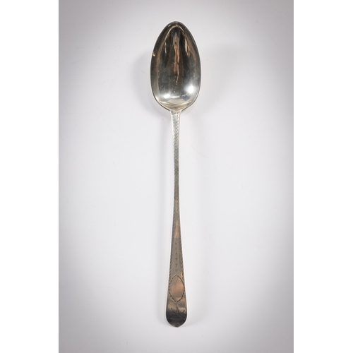 AN IRISH SILVER SERVING SPOON, bright cut by John Pittar, Dublin, 1786, 34cm (l). 3.21 ozt.