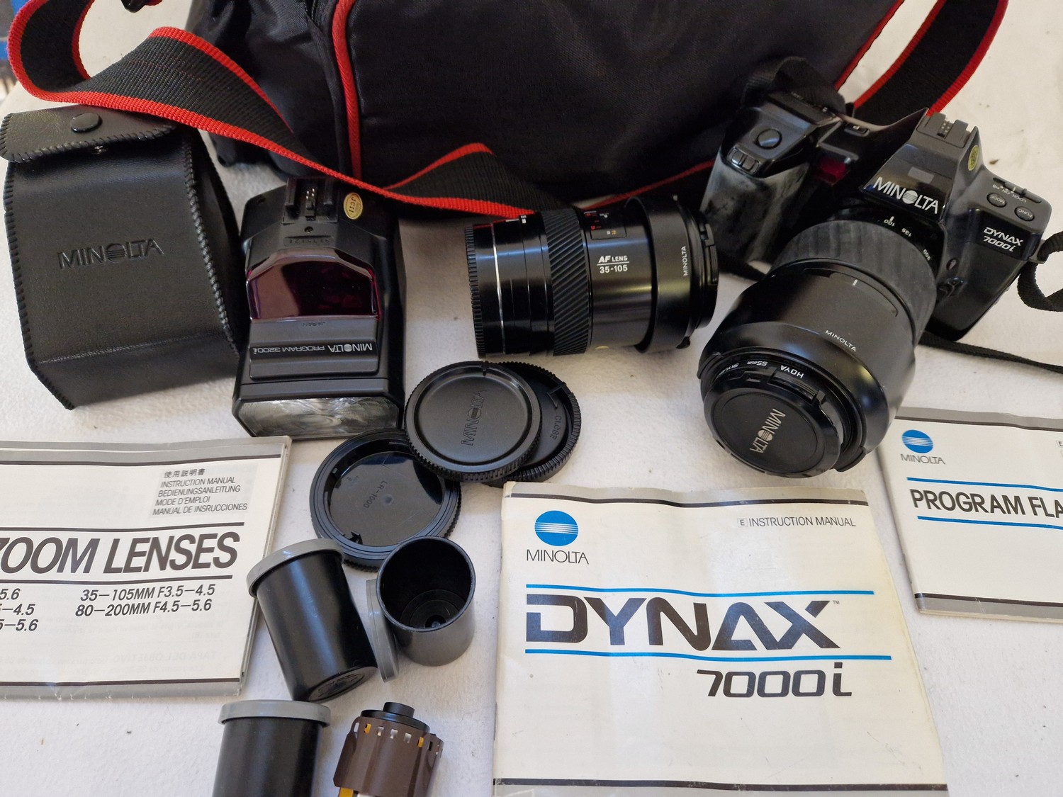 Minolta Cased Minolta Dynax 7000i 35mm camera with lenses, flash, film