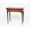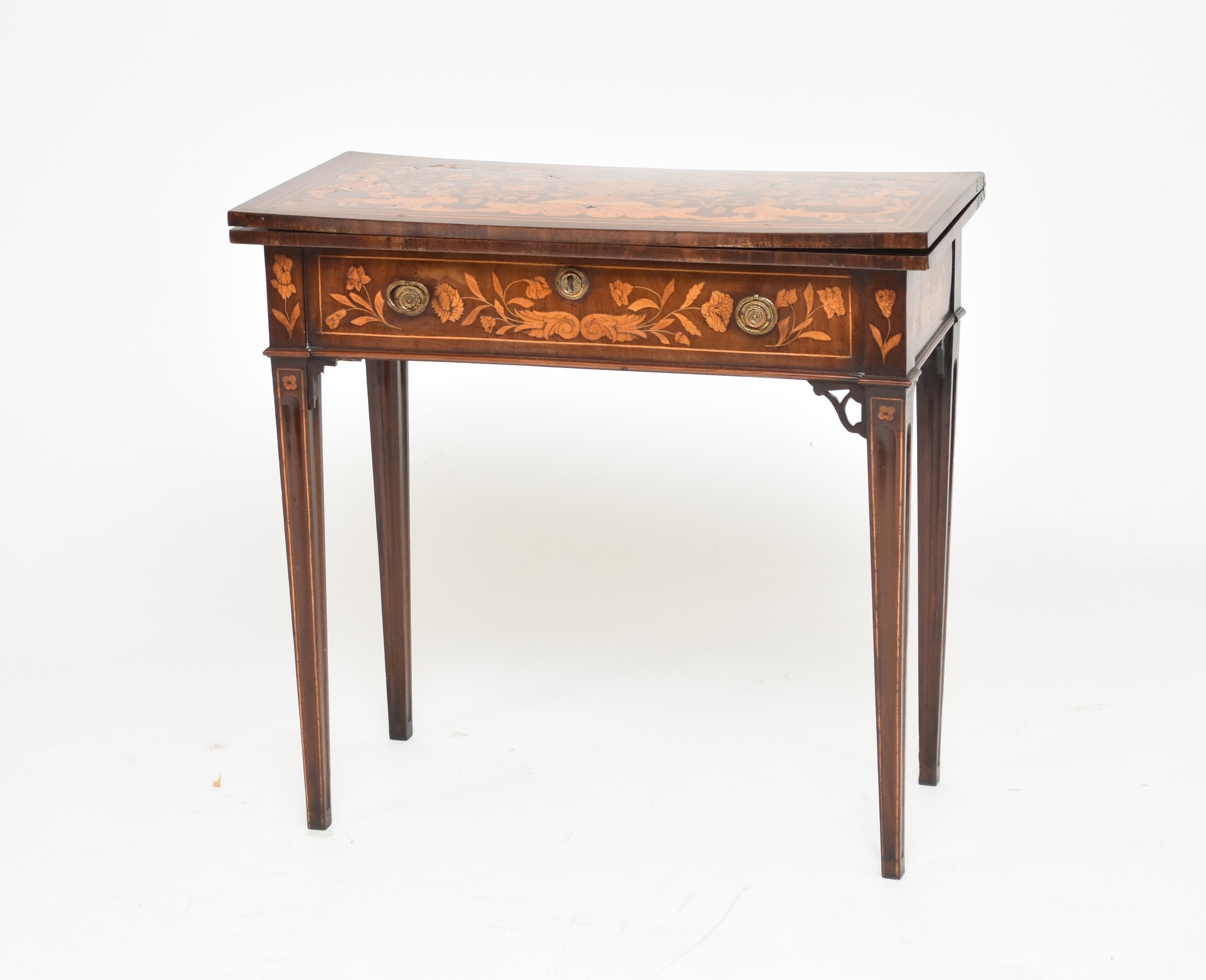 A late 18th century Dutch marquetry card table The fold-over top inlaid with a flower filled urn and scrolling foliage supporting a squirrels, the interior with square playing surface surrounded by inlaid parquetry banding, over a faux frieze drawer inlaid with further flowers and foliage, raised on tapering moulded square-section supports with openwork spandrels. 75cm wide x 38cm deep (76cm open) x 71cm high Condition:Top slightly warped. A small area of missing inlay to a flower bud in the top. Front left spandrel re-glued. Back left spandrel missing. Minor cosmetic marks consistent with age and use. Baize skiver faded and discoloured.
