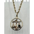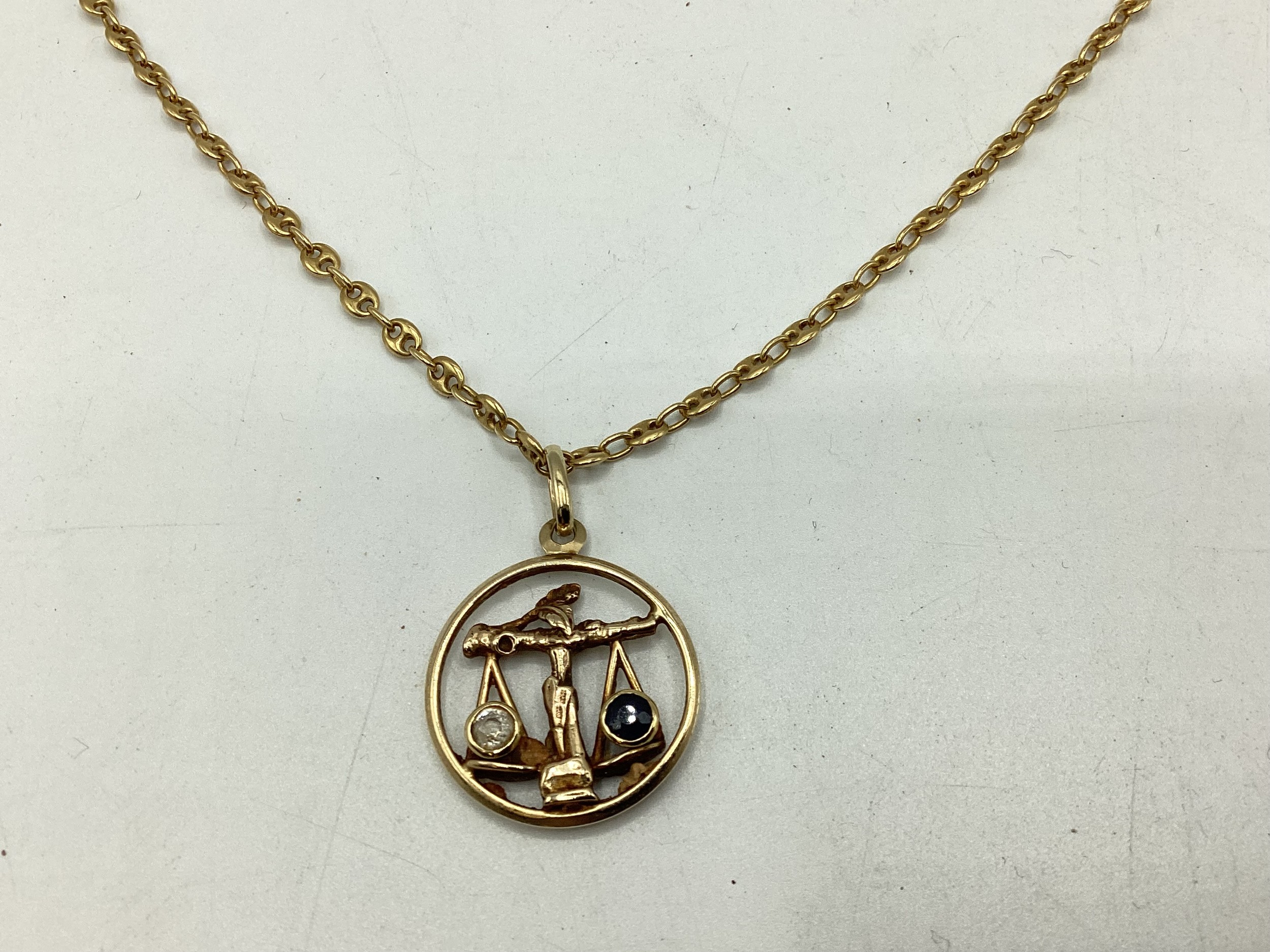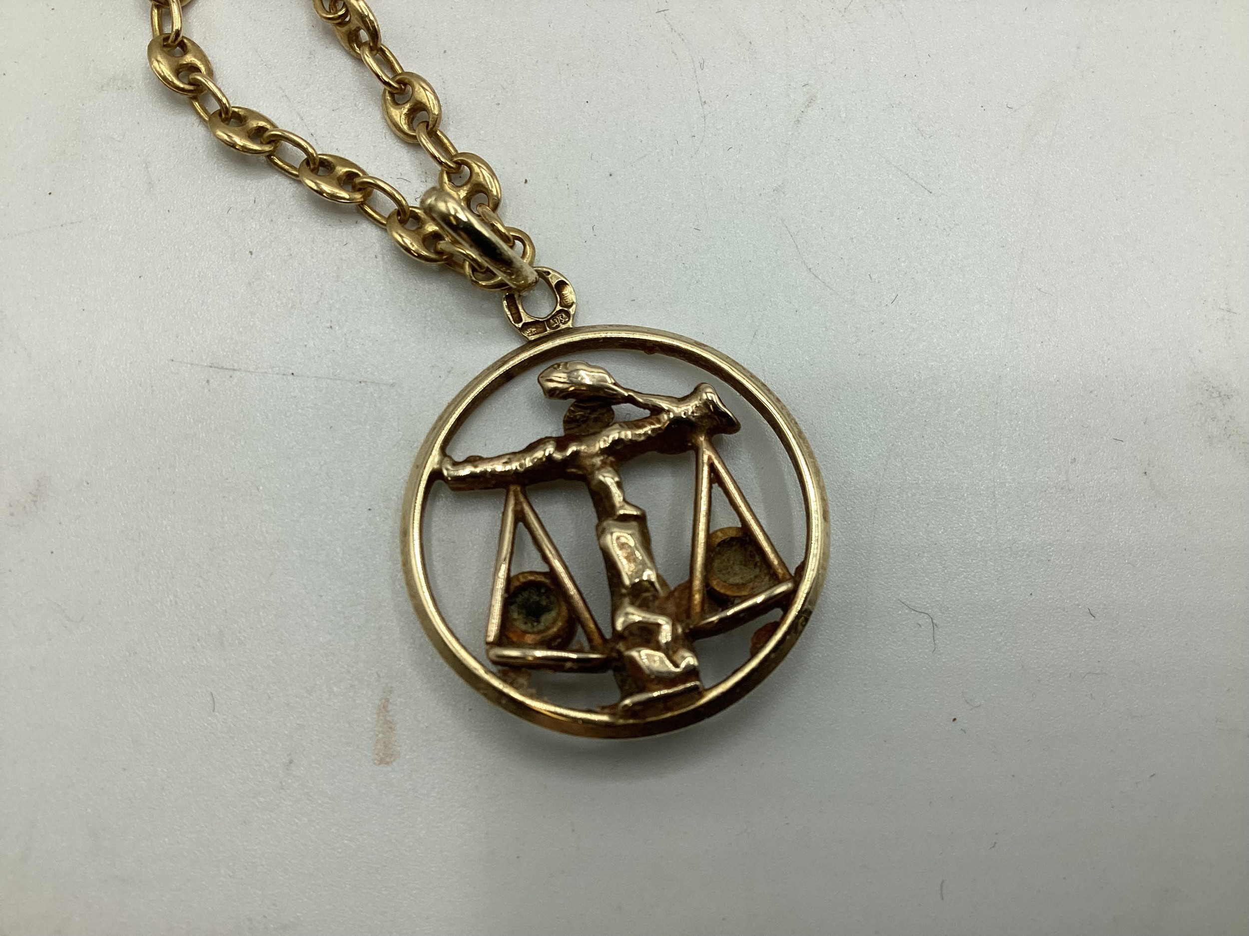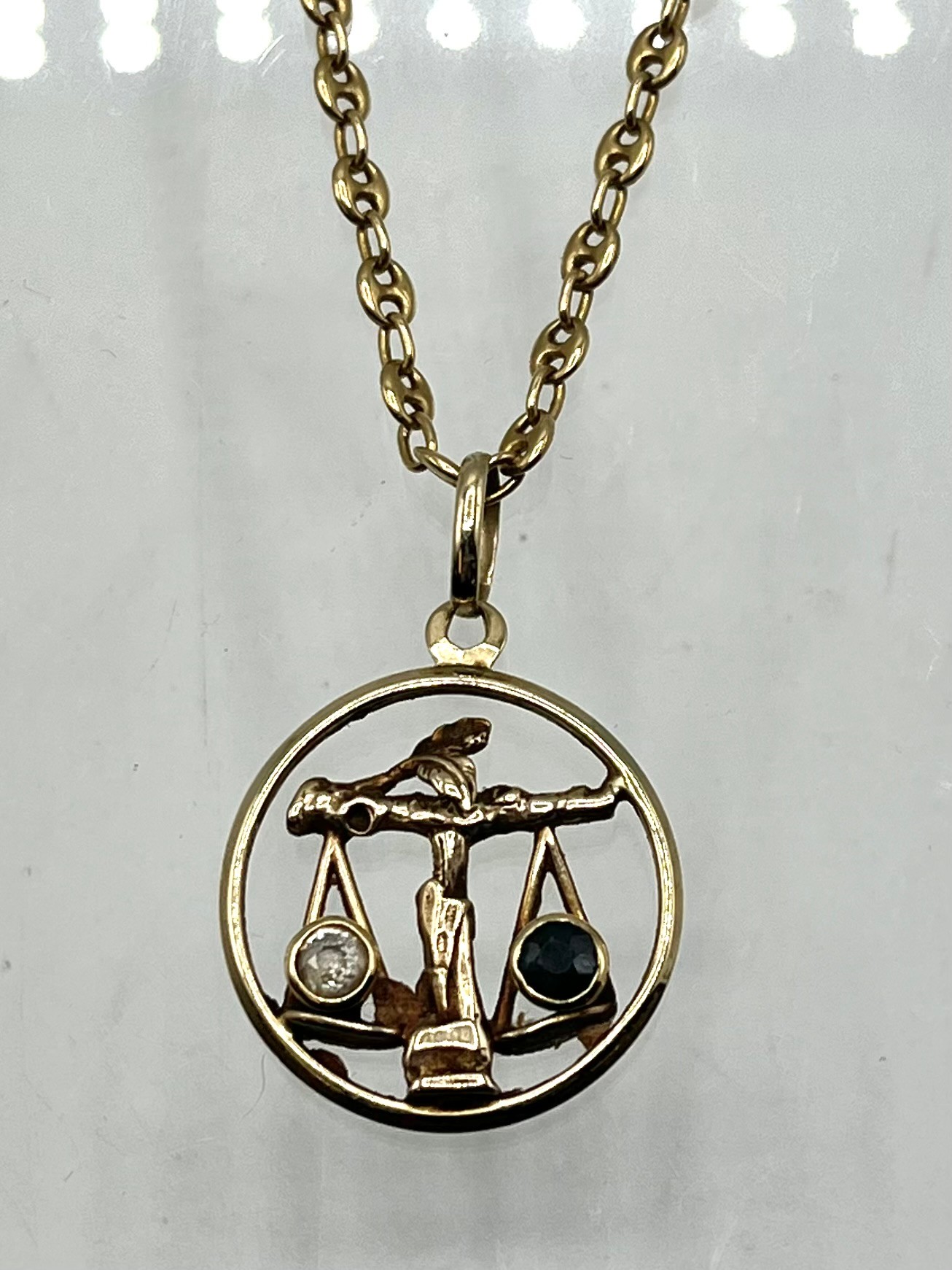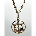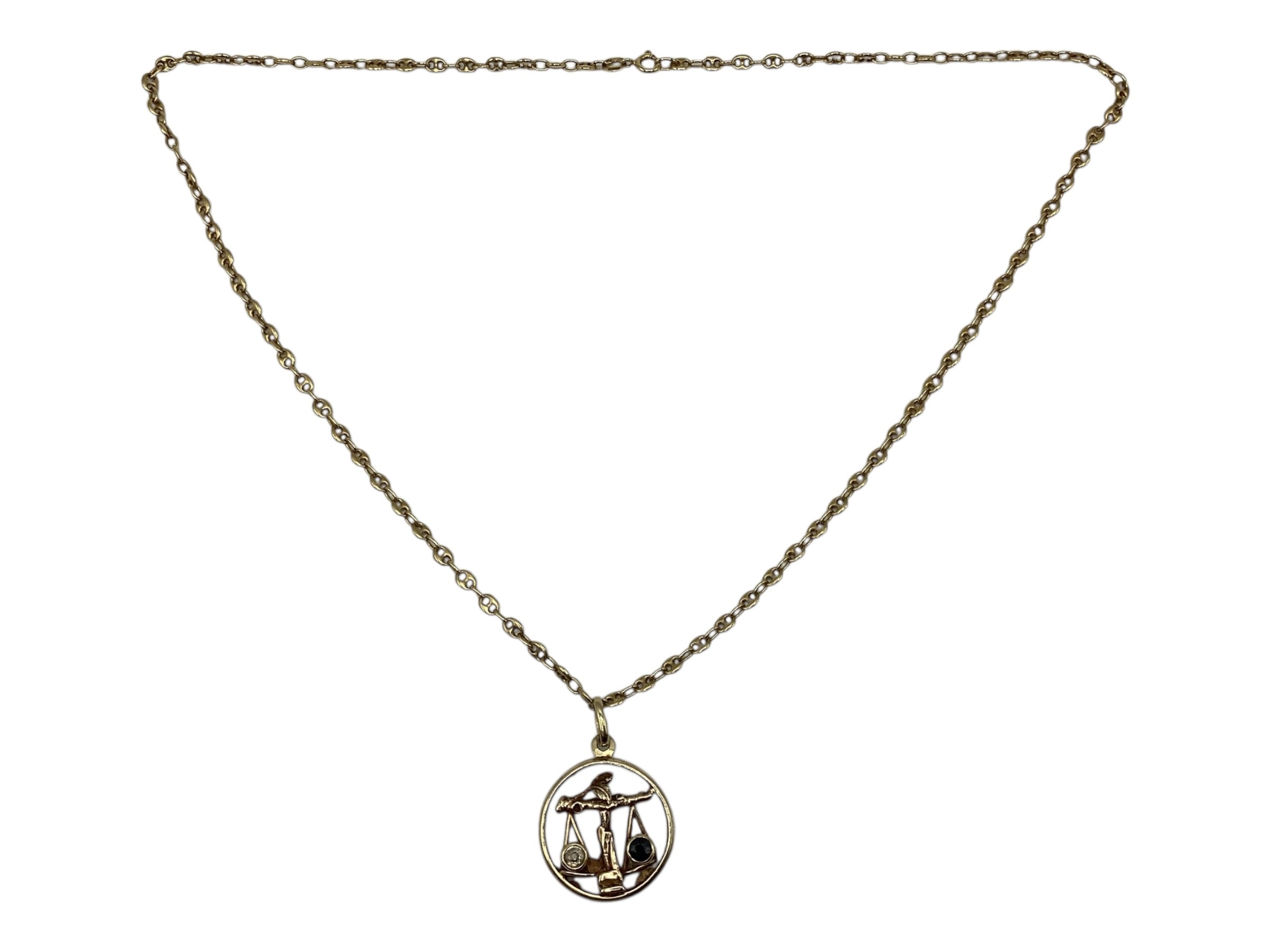 A 9ct gold sapphire & diamond set circular 'Libra Scales' pendant on an 18ct gold 55 cm fancy link necklace. Pendant 5.5 g, necklace 14.2 g.
