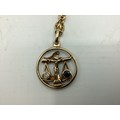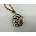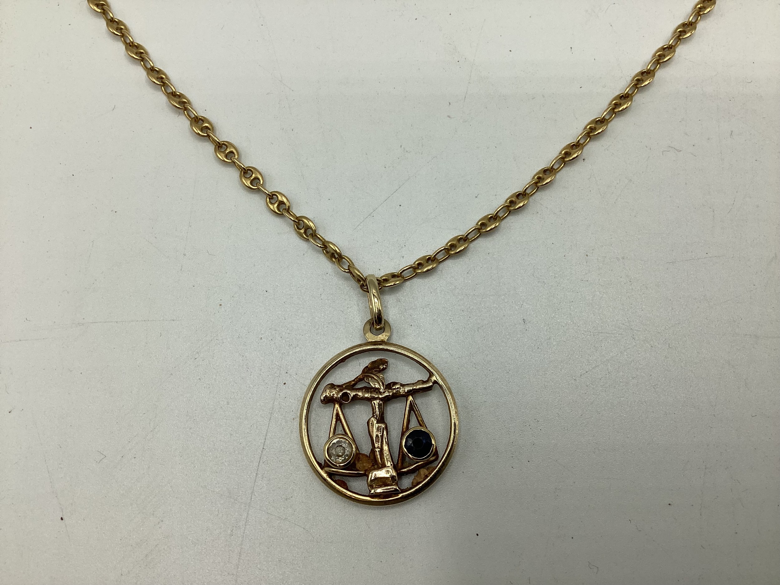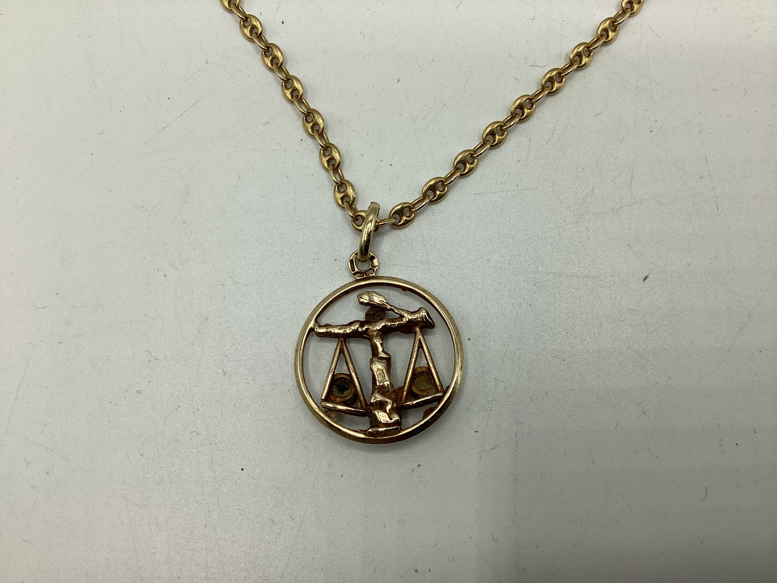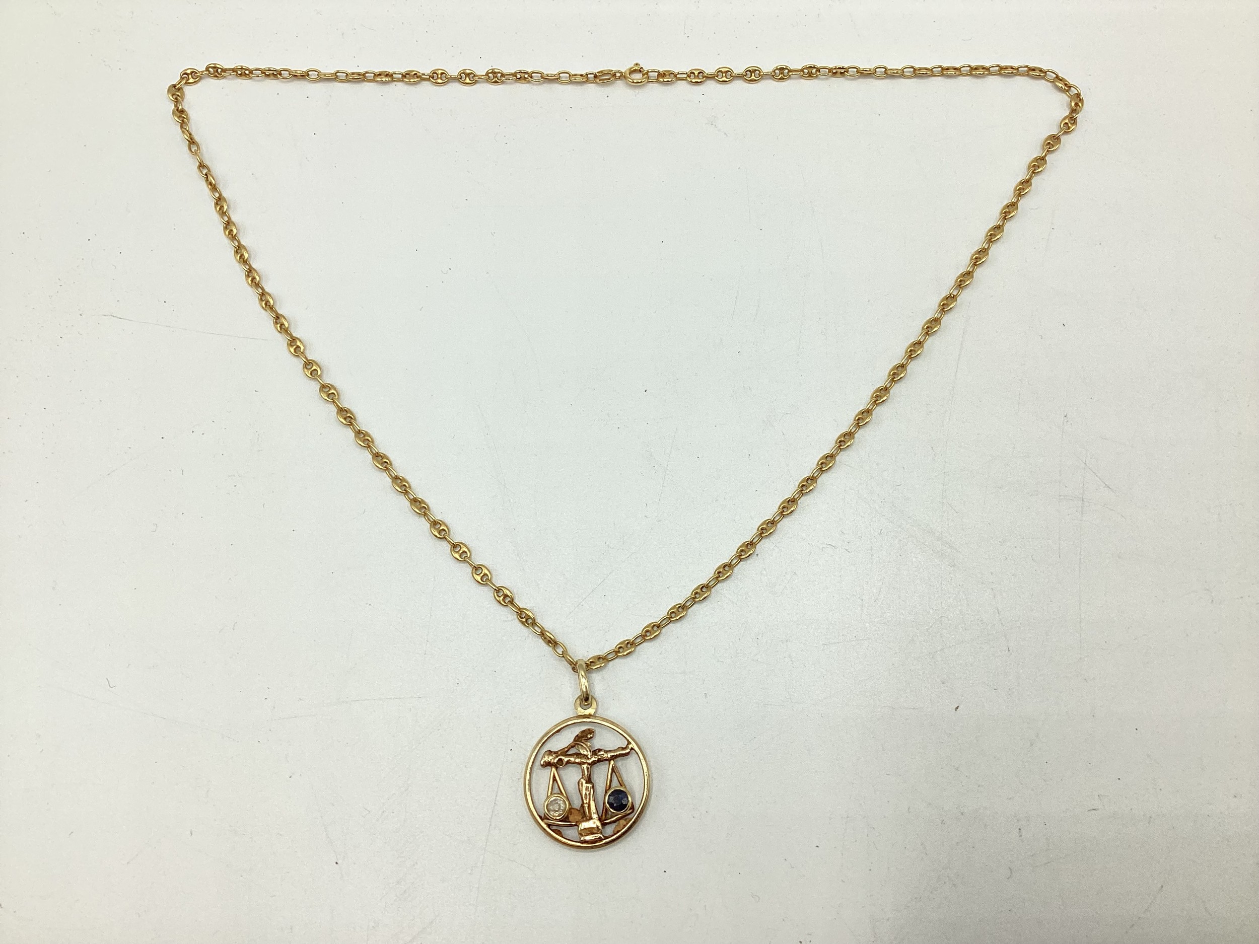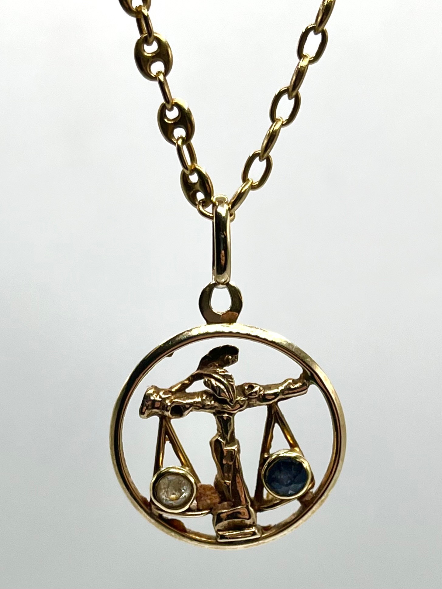 A 9ct gold sapphire & diamond set circular 'Libra Scales' pendant on an 18ct gold 55 cm fancy link necklace. Pendant 5.5 g, necklace 14.2 g.