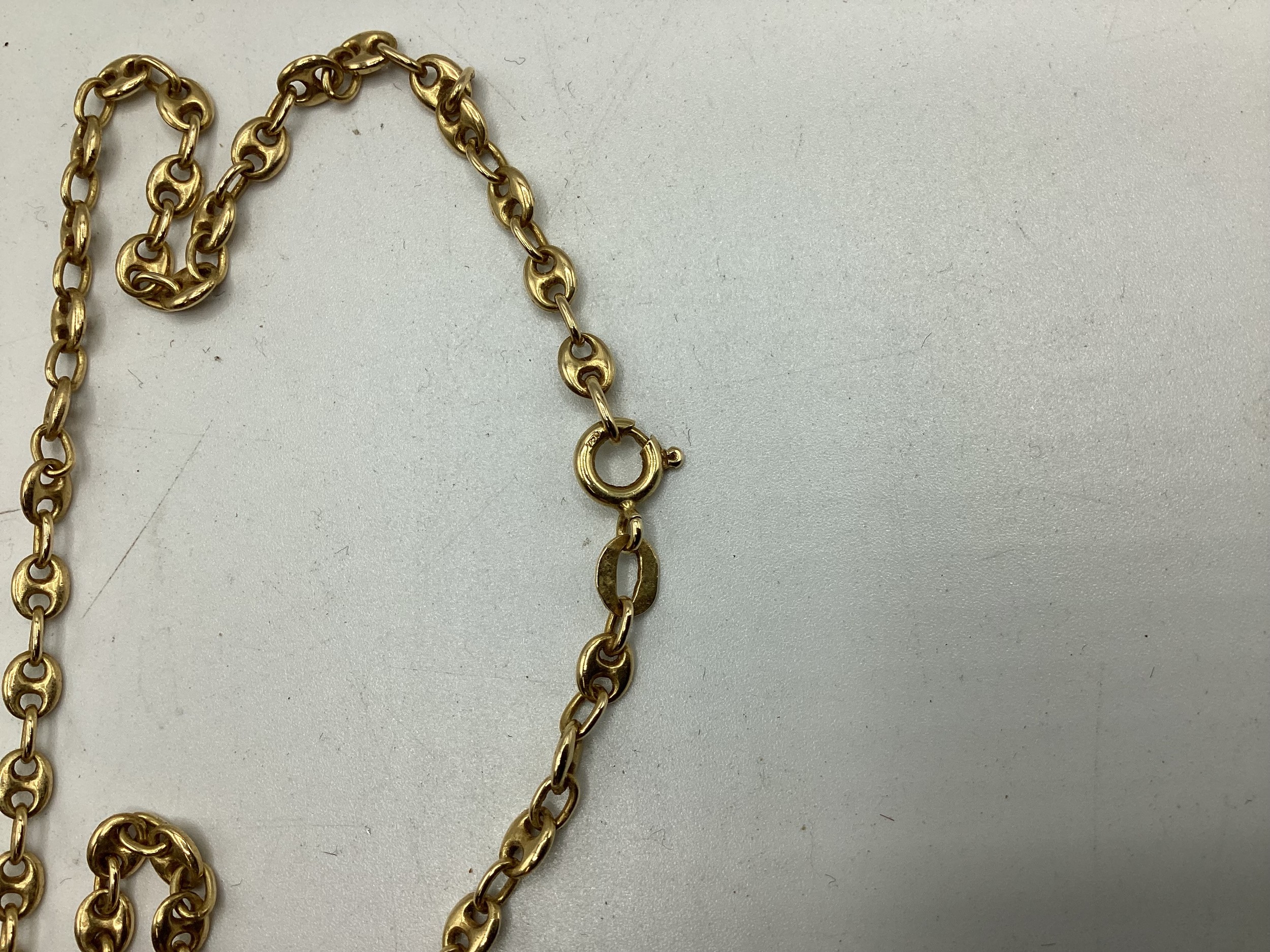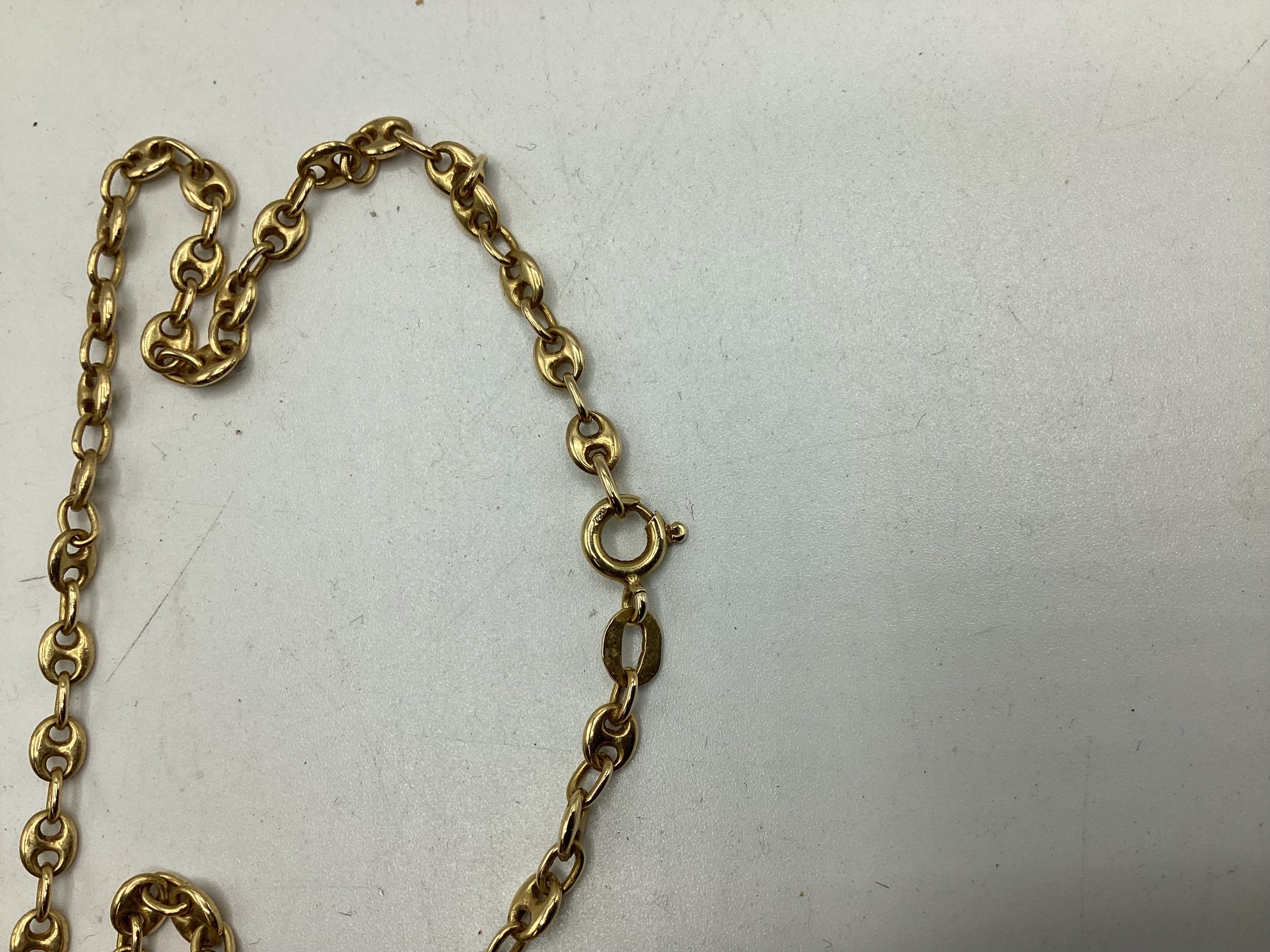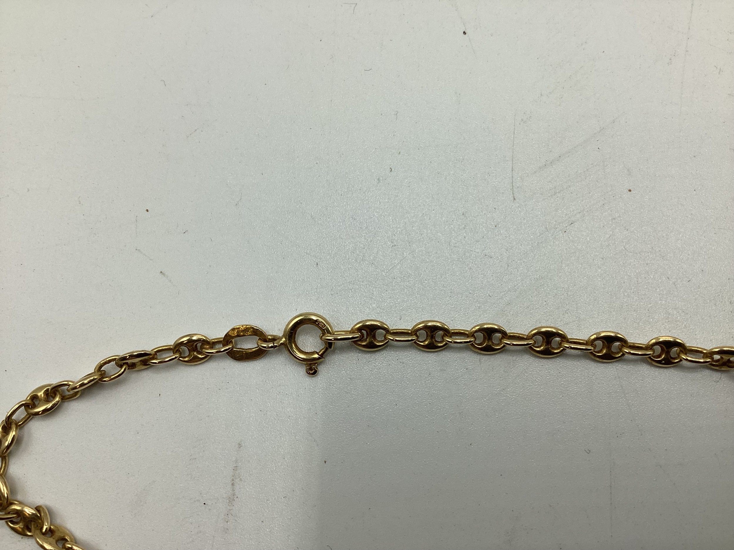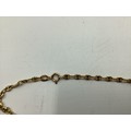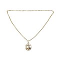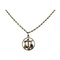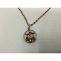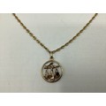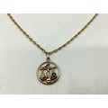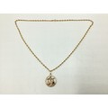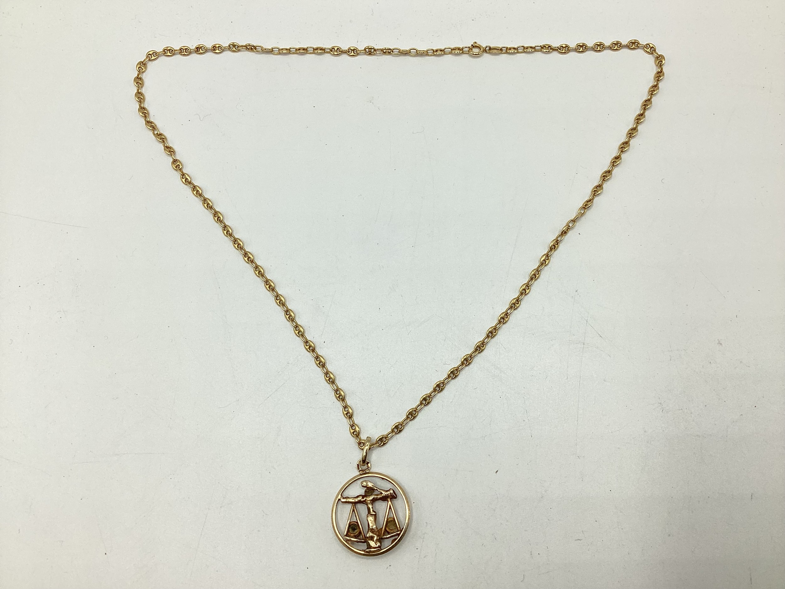 A 9ct gold sapphire & diamond set circular 'Libra Scales' pendant on an 18ct gold 55 cm fancy link necklace. Pendant 5.5 g, necklace 14.2 g.