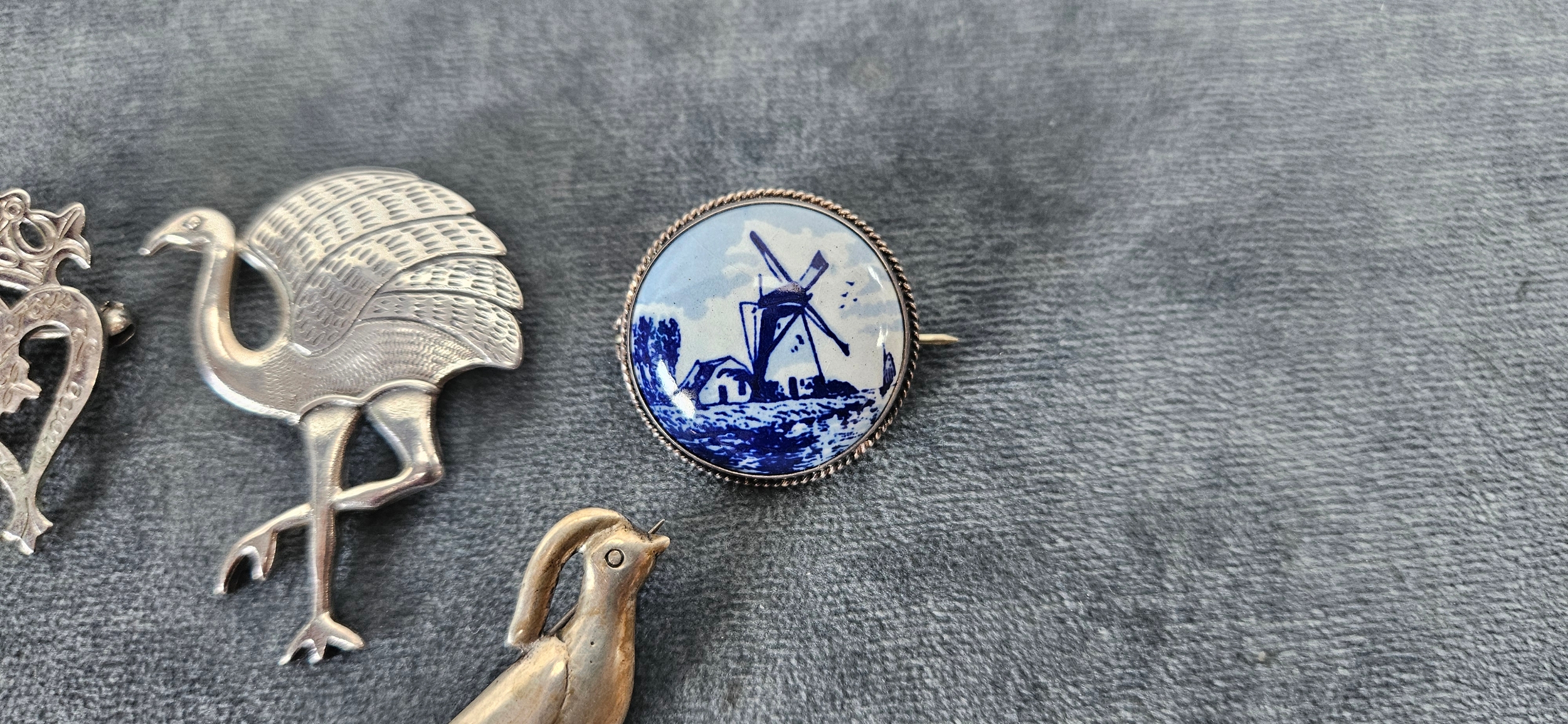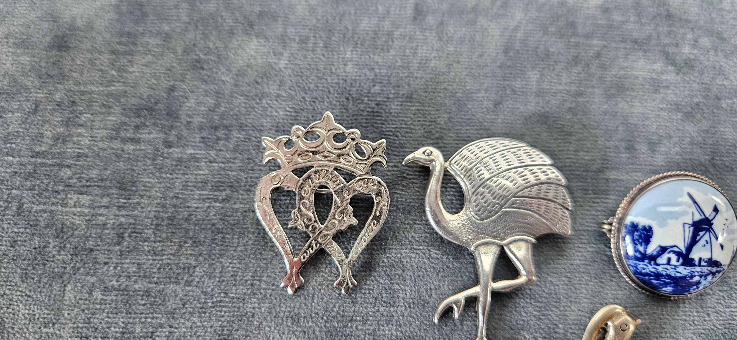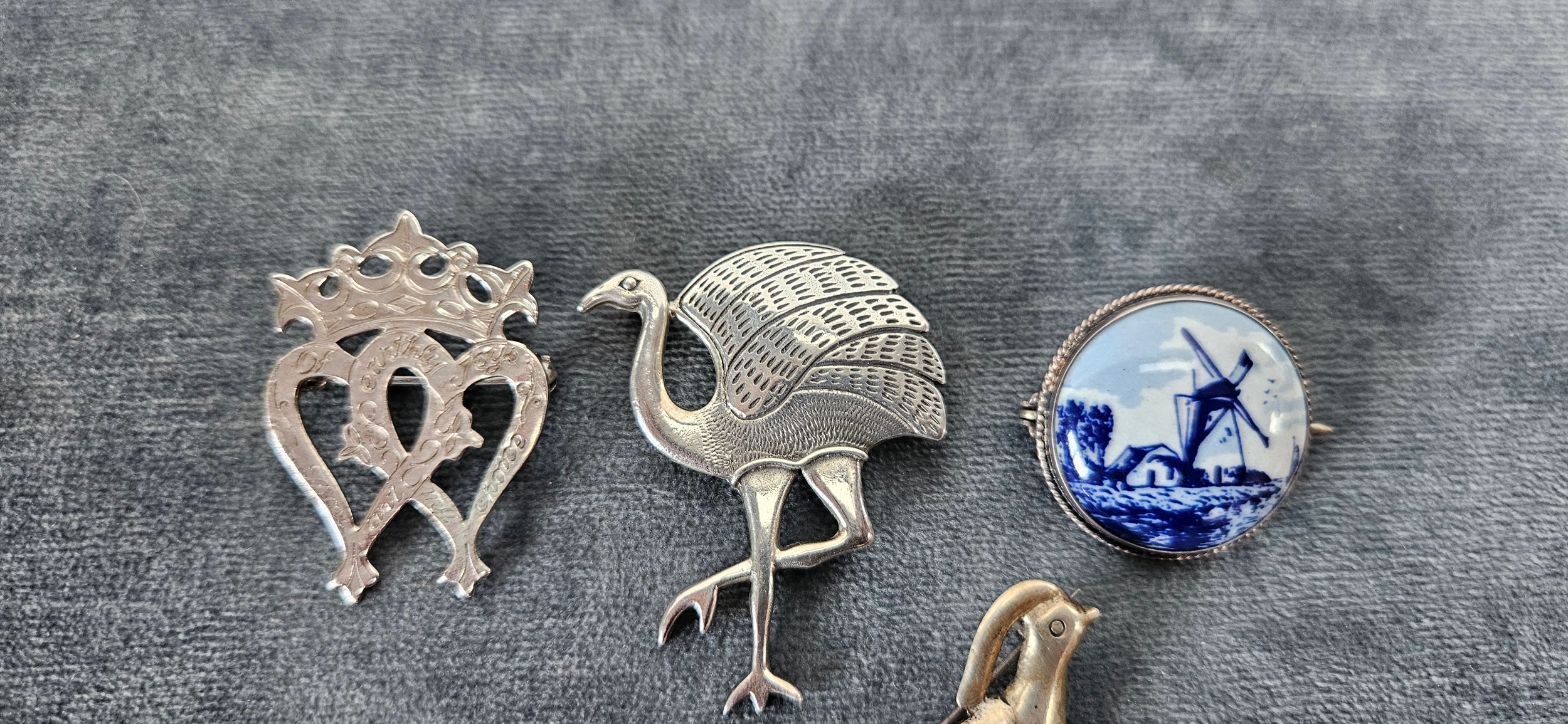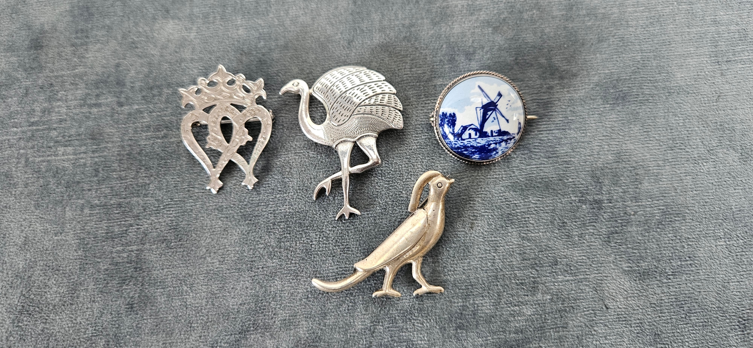 4 x Silver brooches including delft and birds