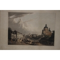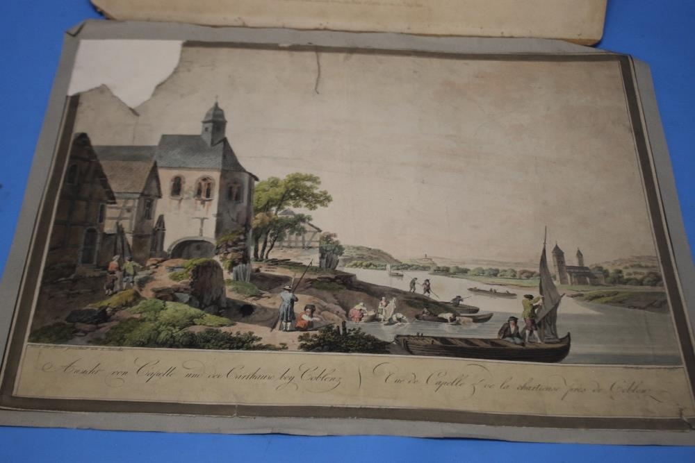 A HAND COLOURED LITHOGRAPH TITLED "WATERLOO CONVEYING THE FRENCH CANNON FROM THE FIELD OF BATTLE ON 24TH JULY 1815" PUBLISHED BY R.BOWYER, together with a coloured engraving depicting a river scene, Von J Ziegler