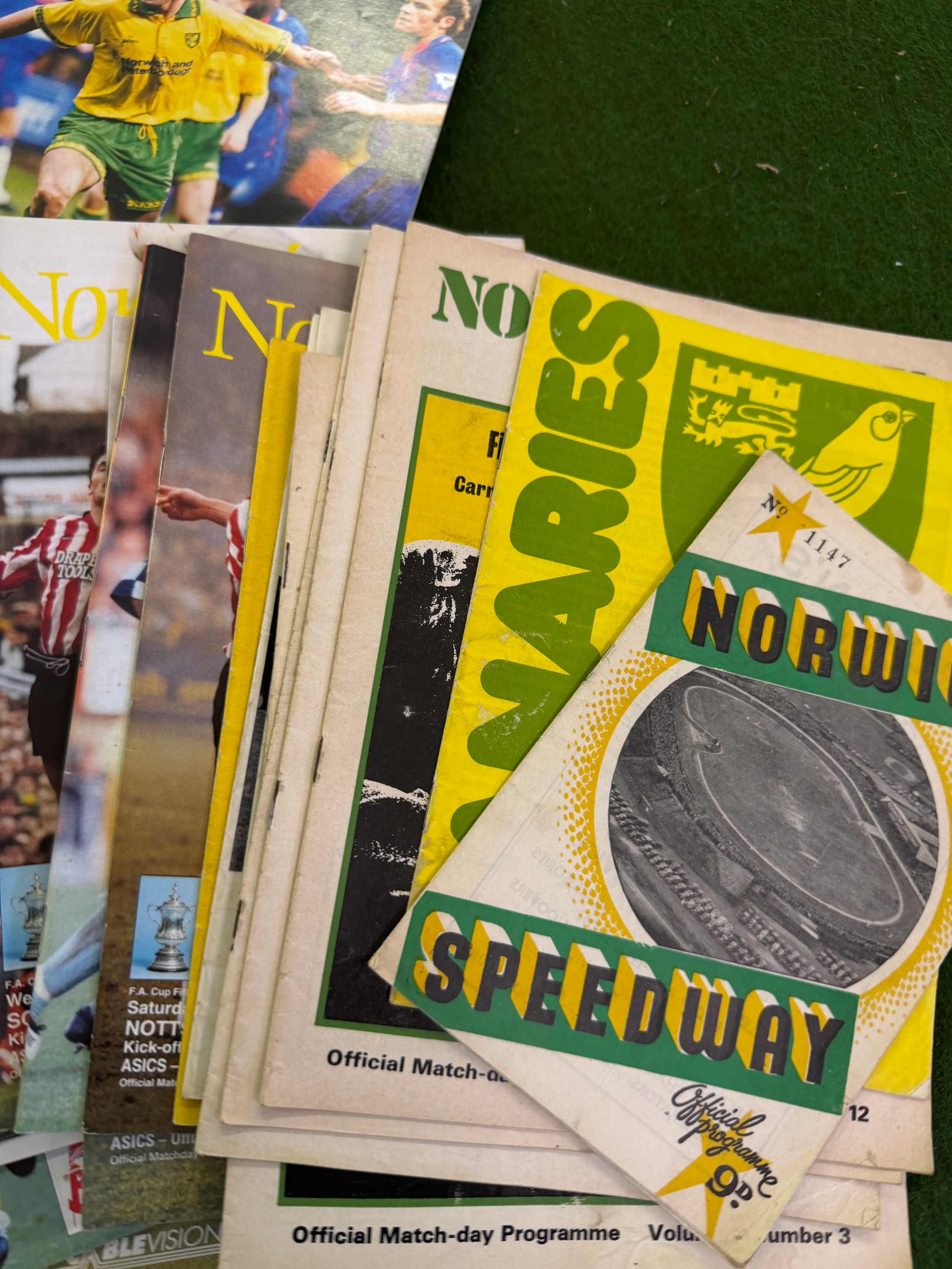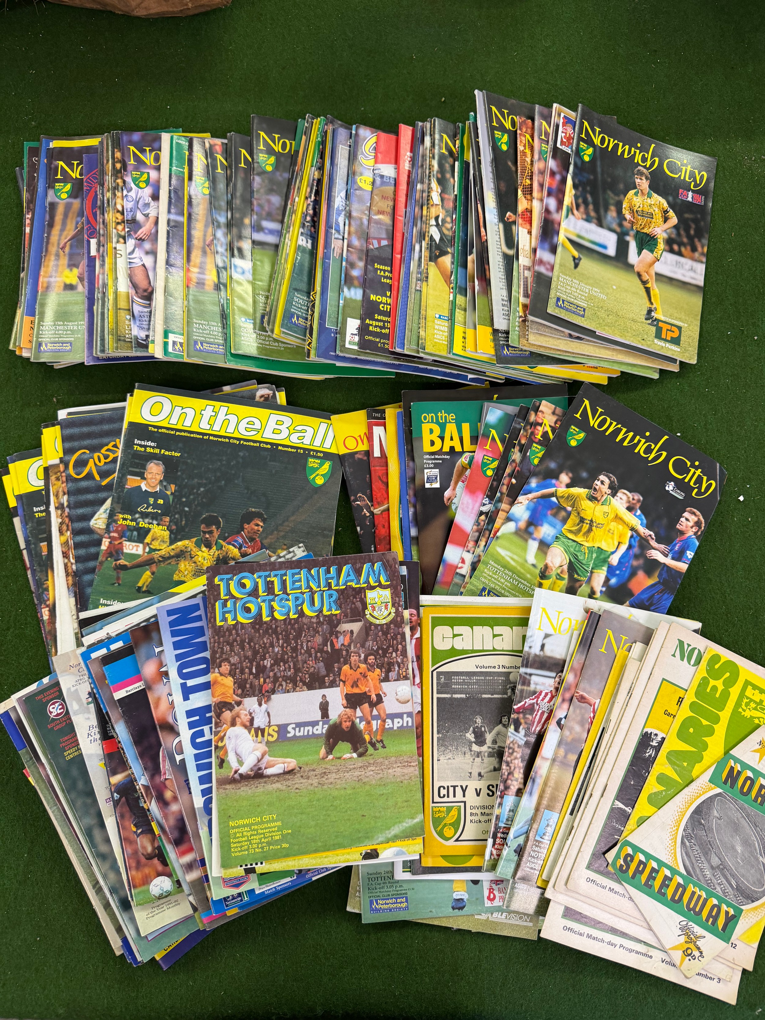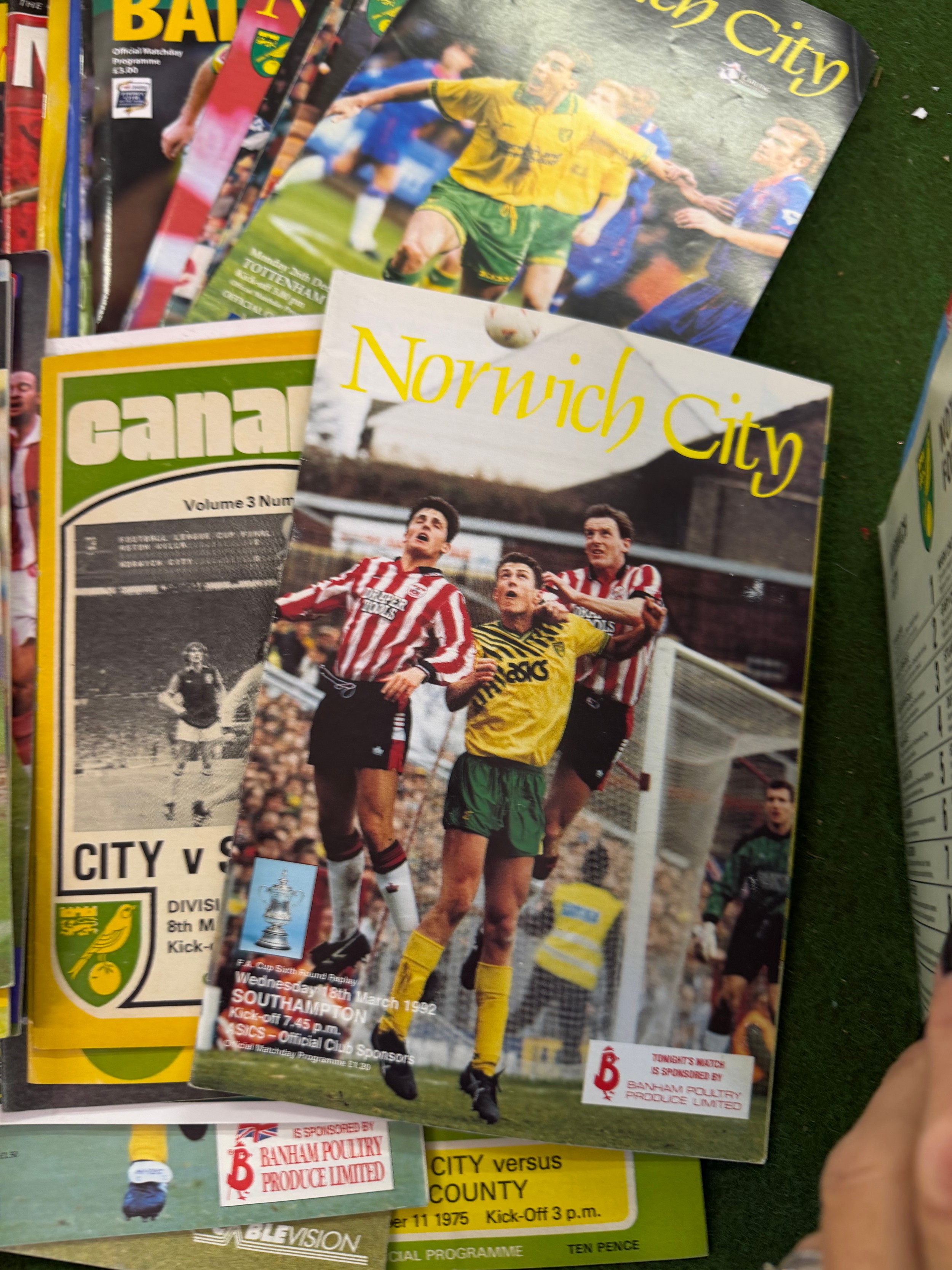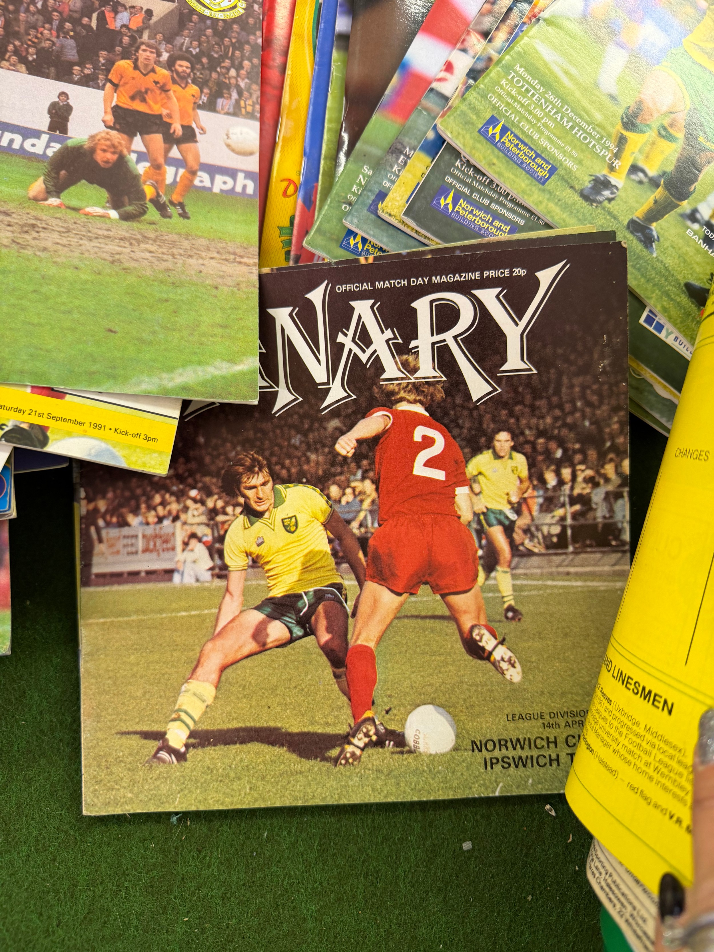 A large collection of football programmes for Norwich City, either playing at home games or away games.