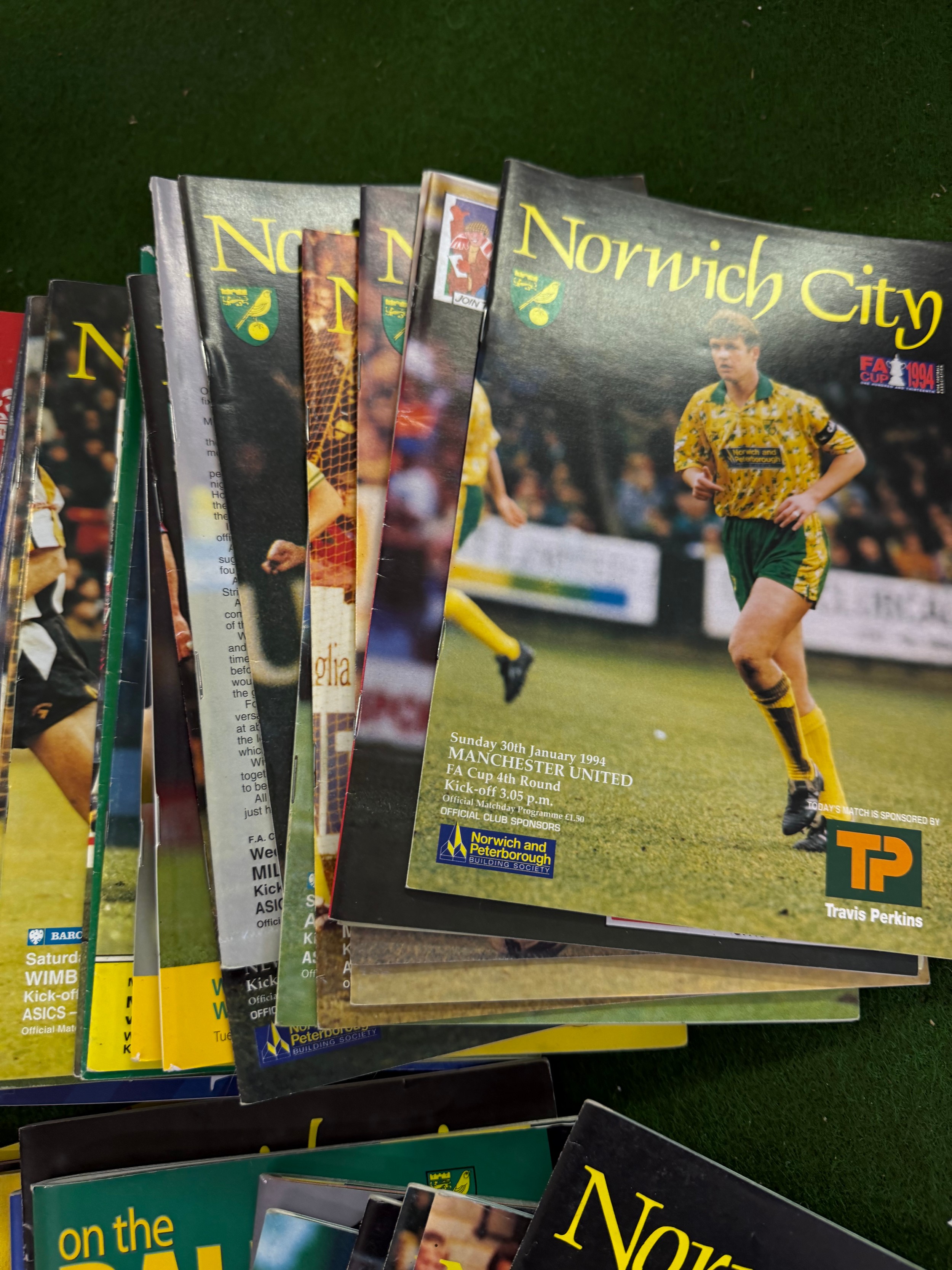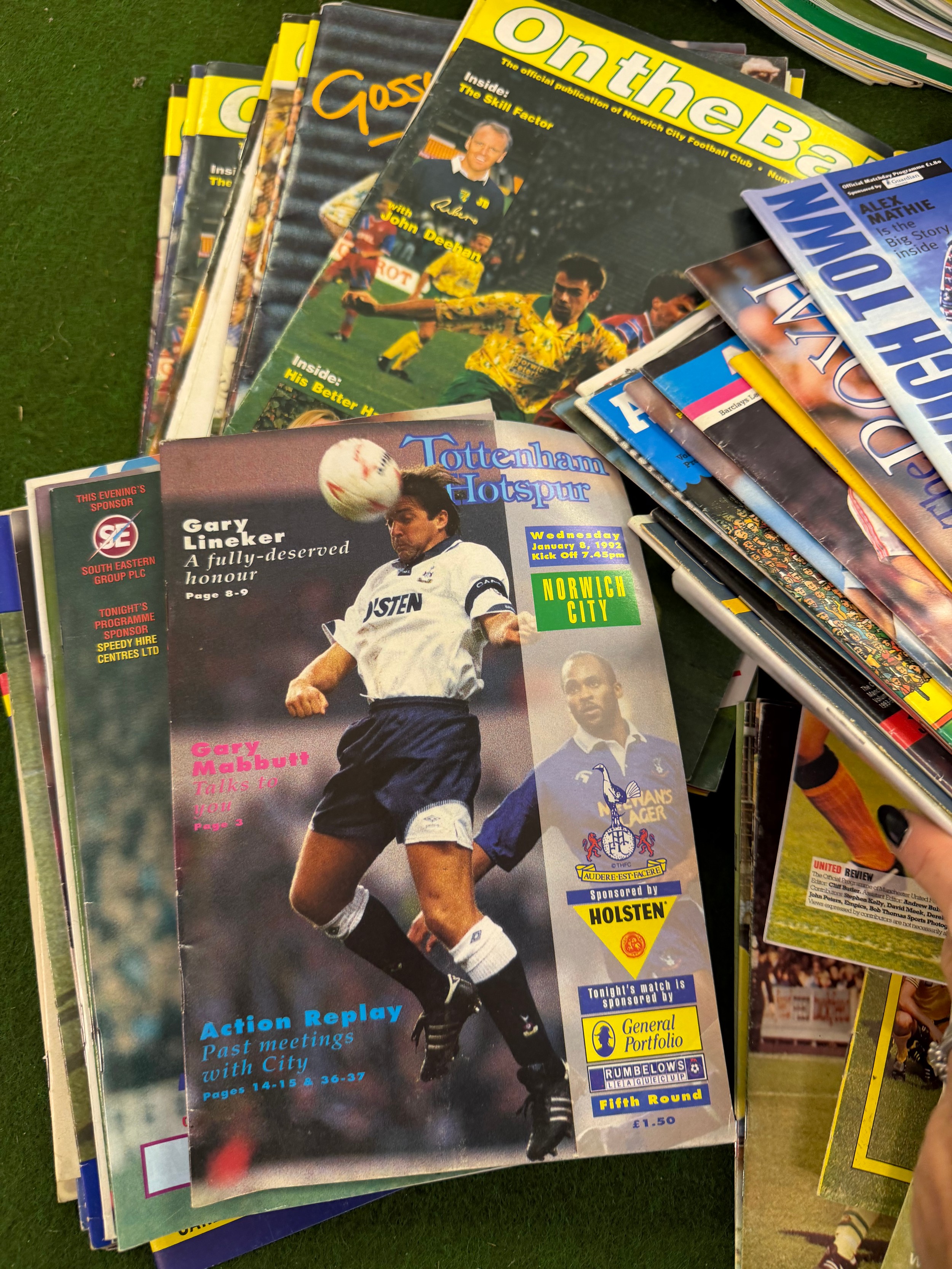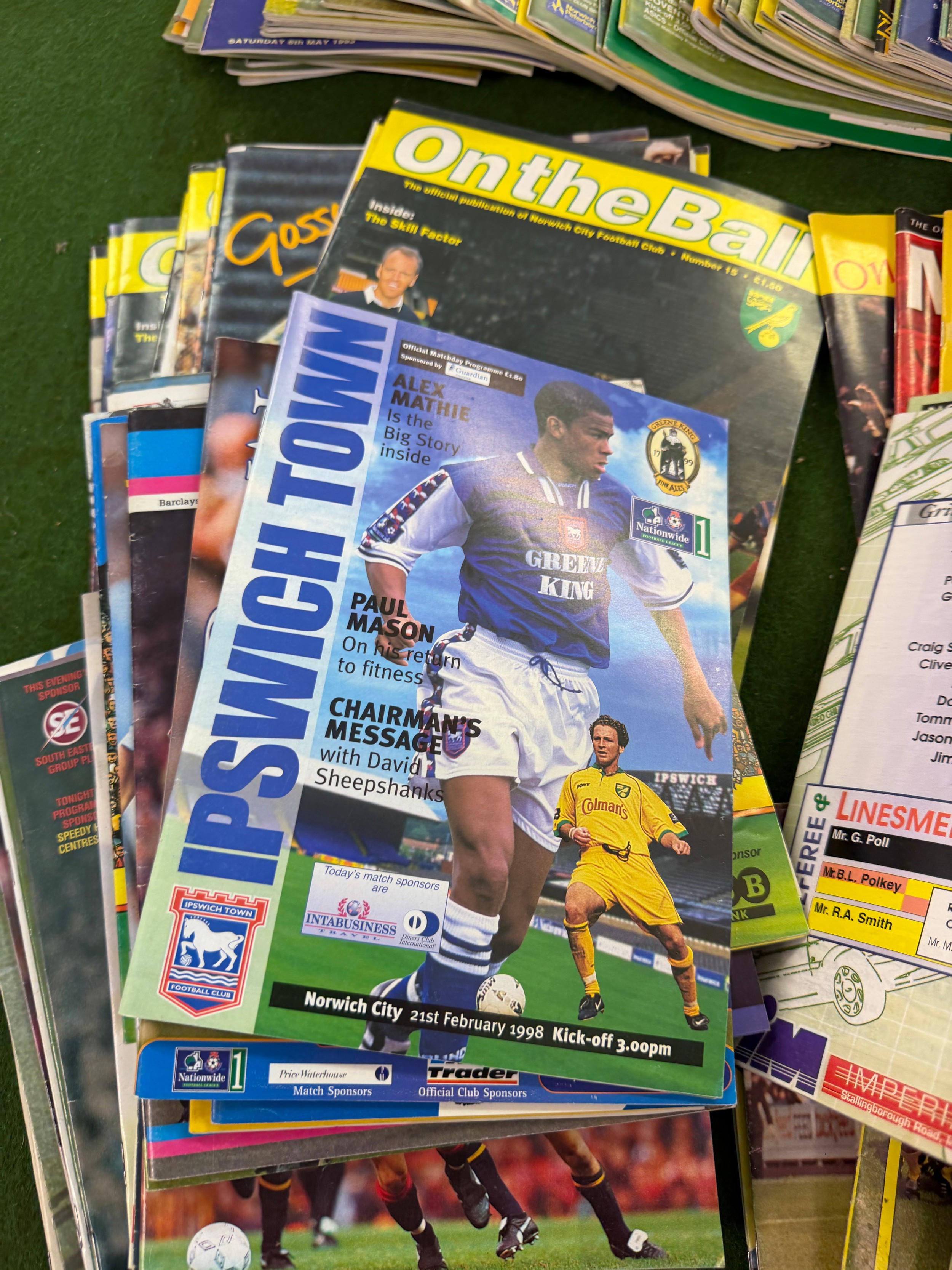 A large collection of football programmes for Norwich City, either playing at home games or away games.
