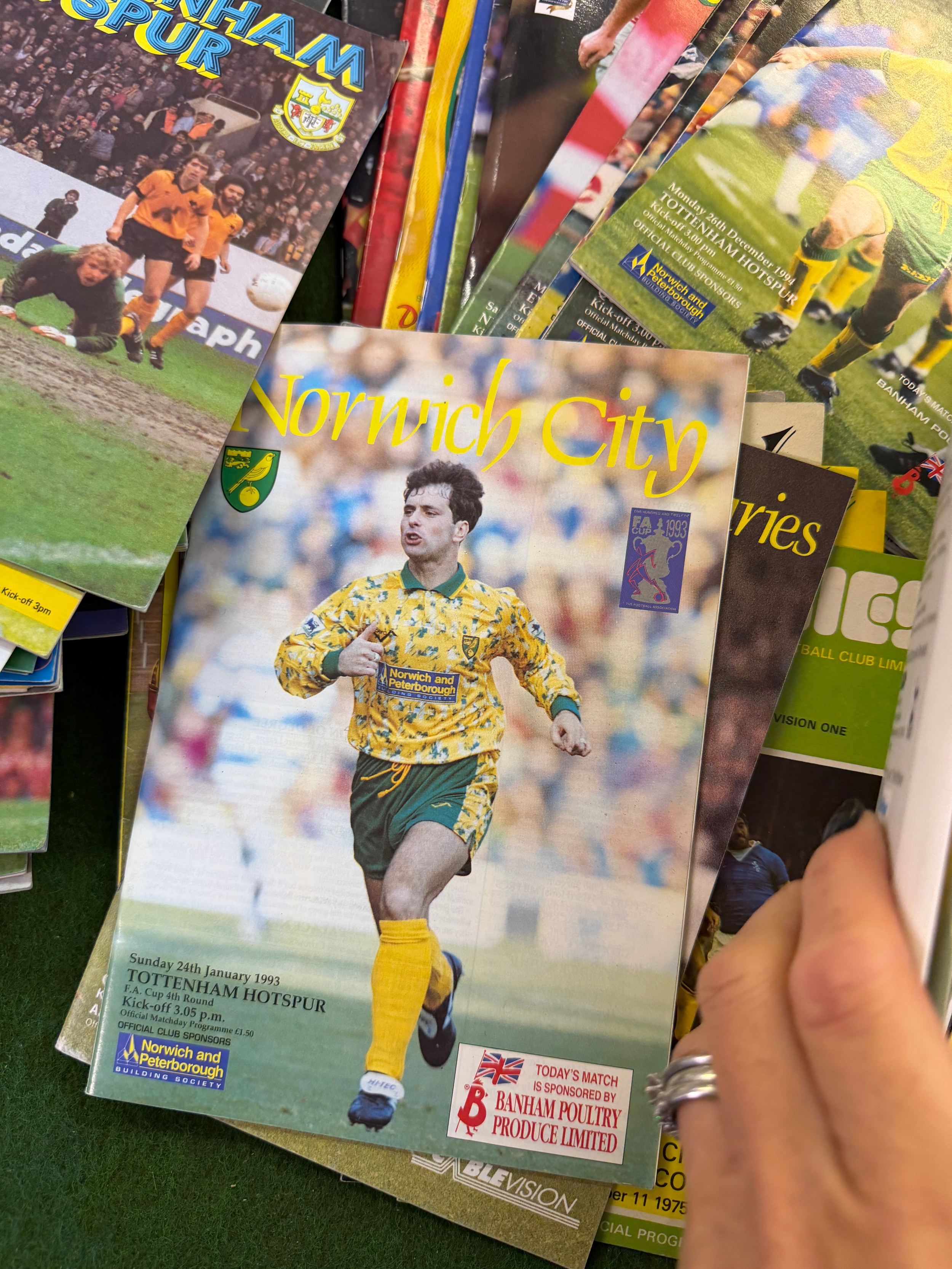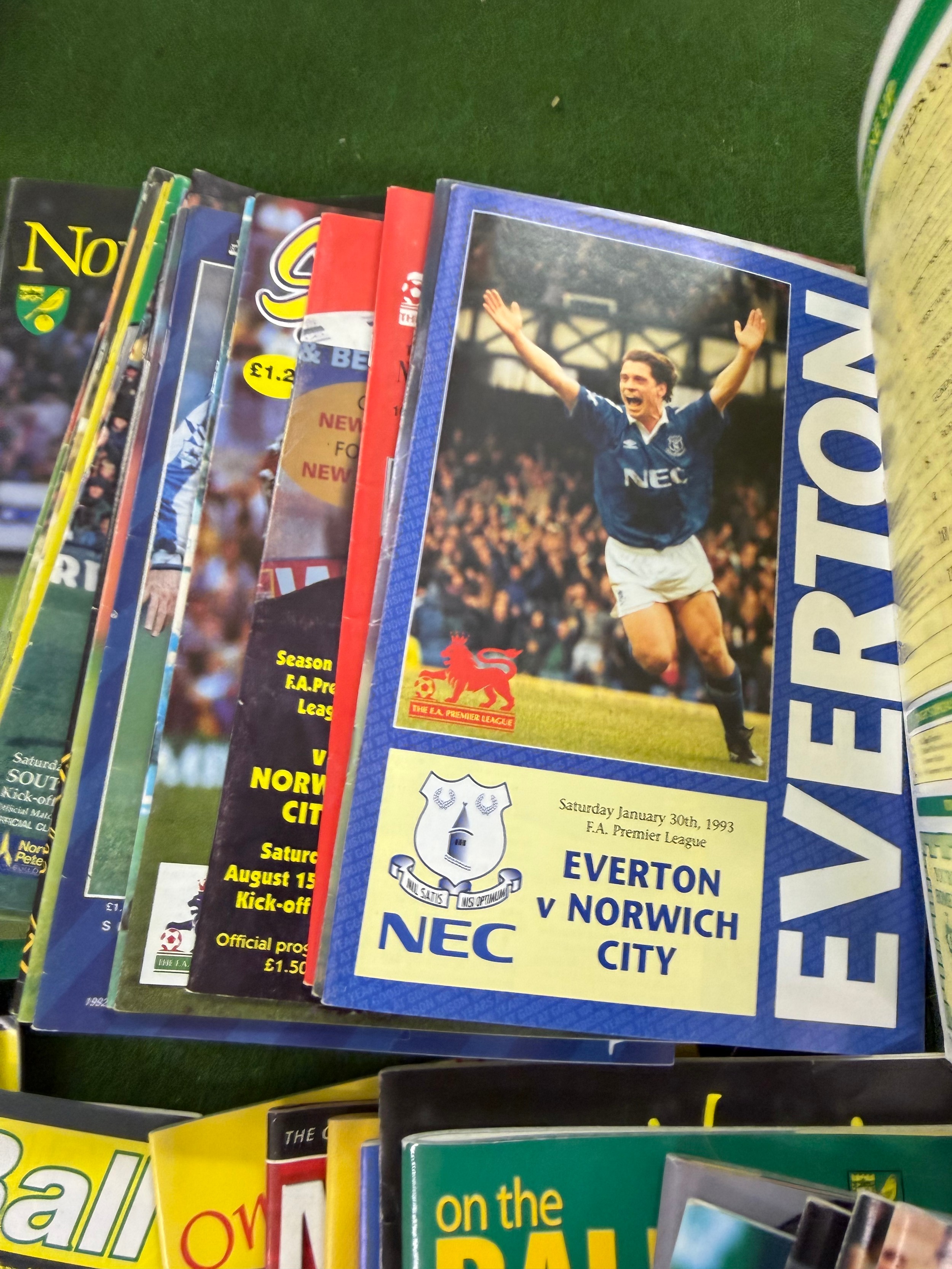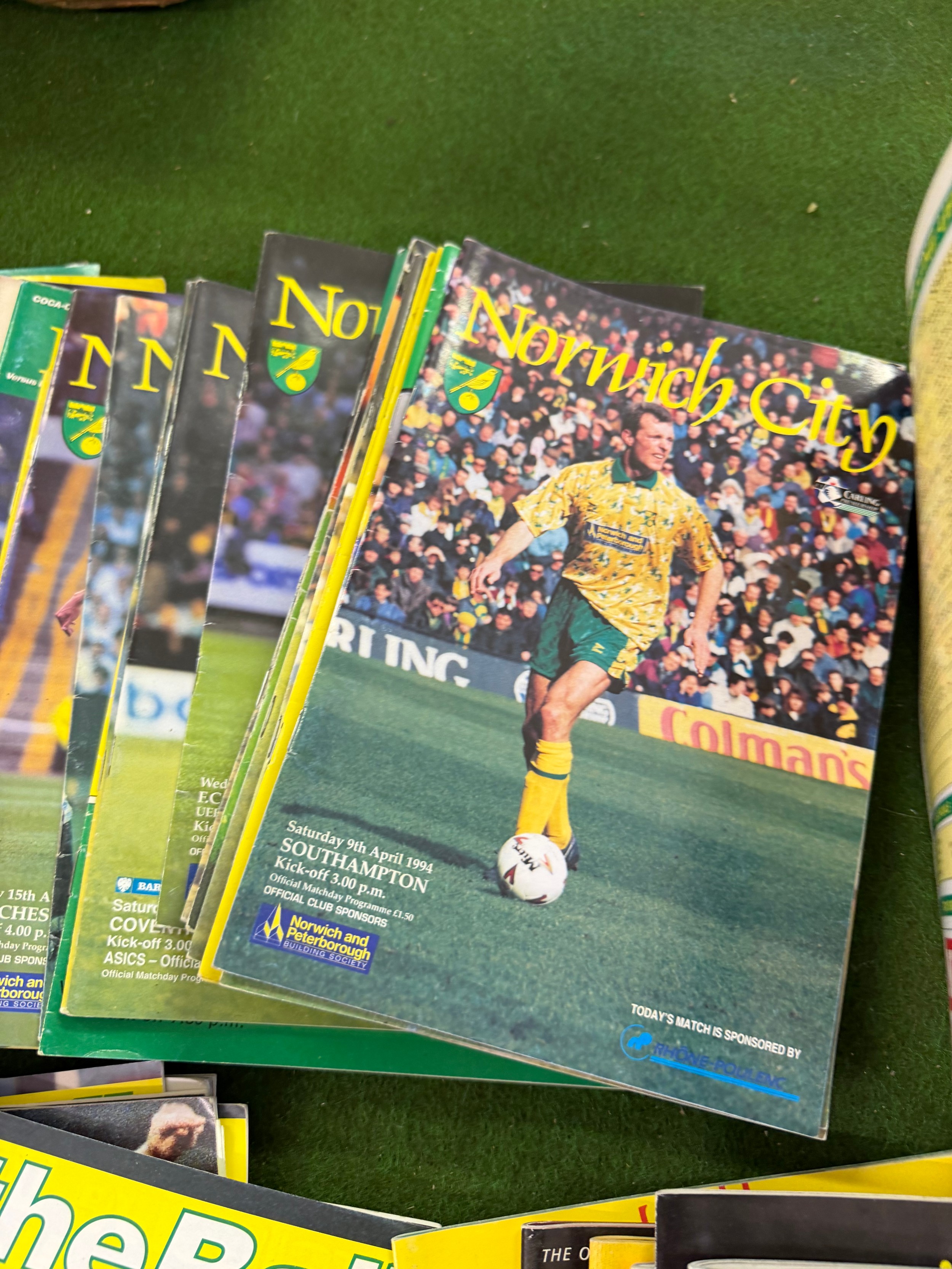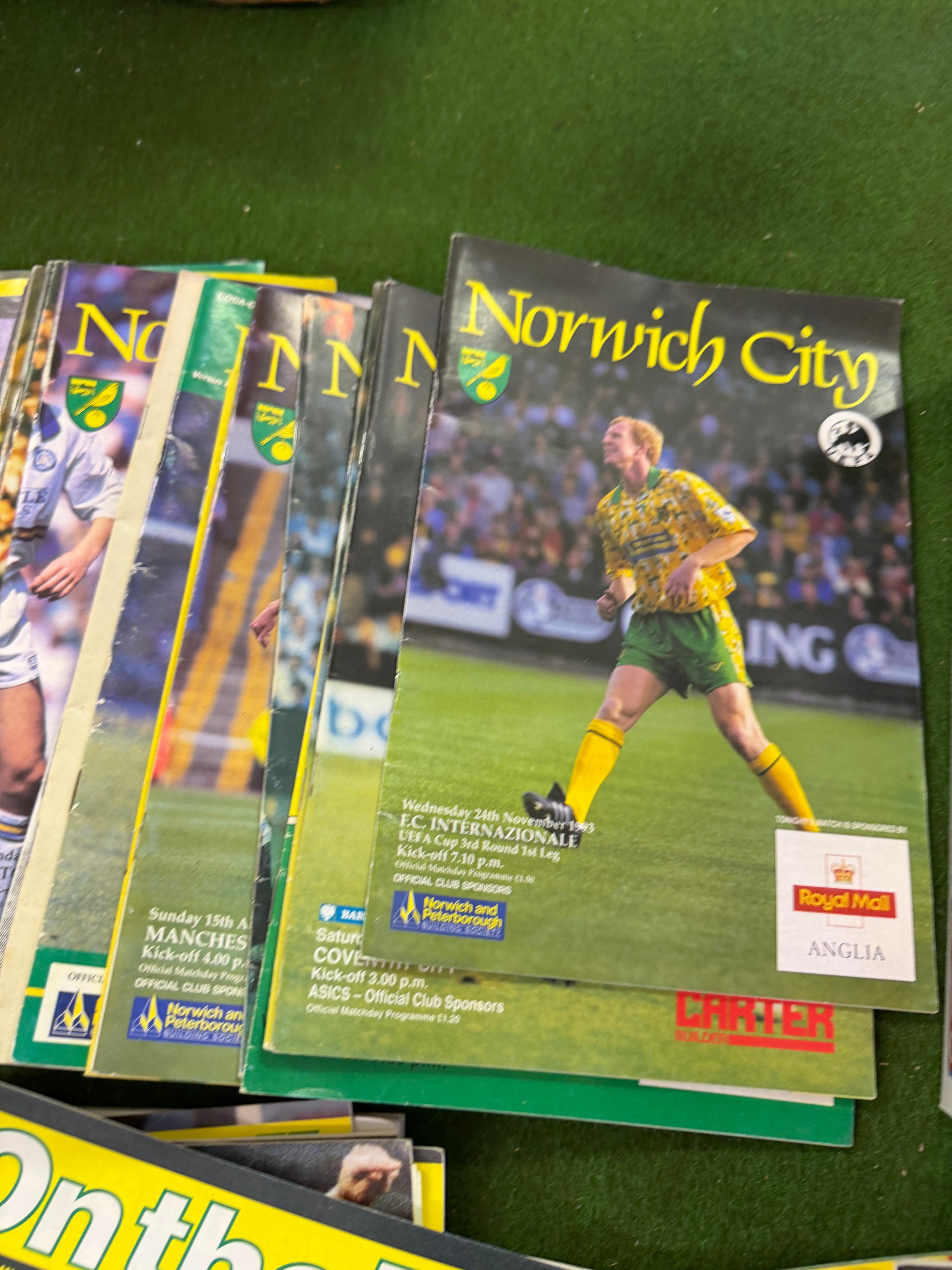 A large collection of football programmes for Norwich City, either playing at home games or away games.