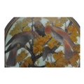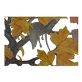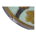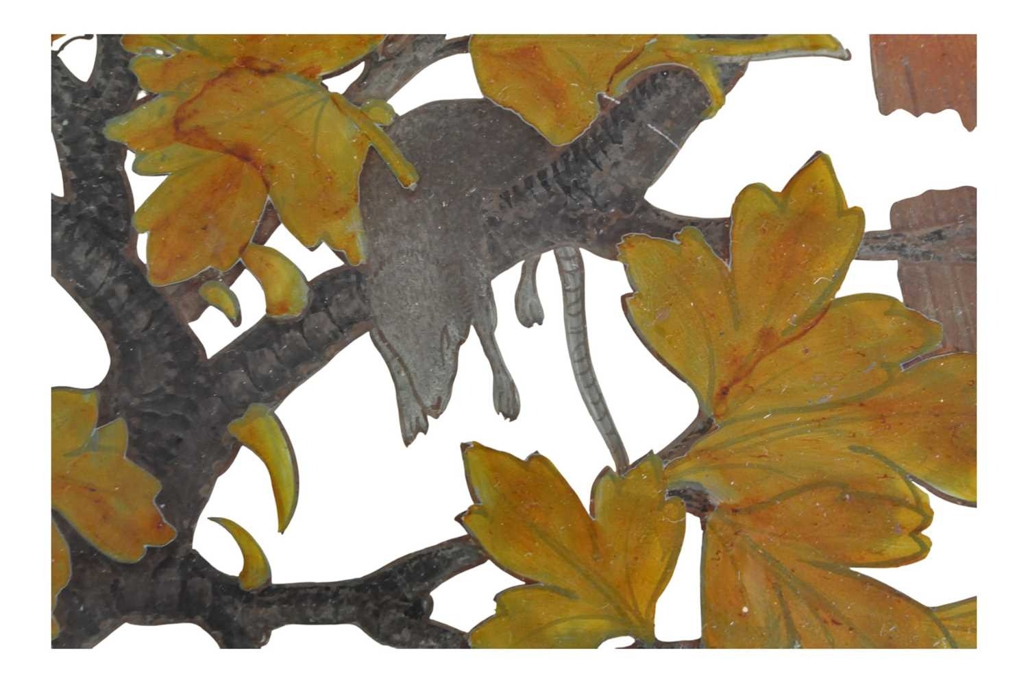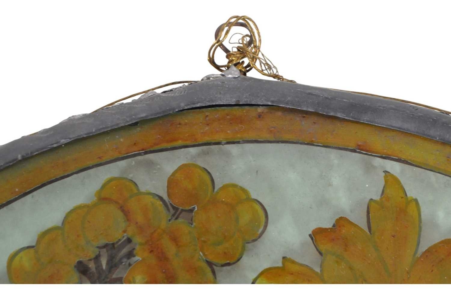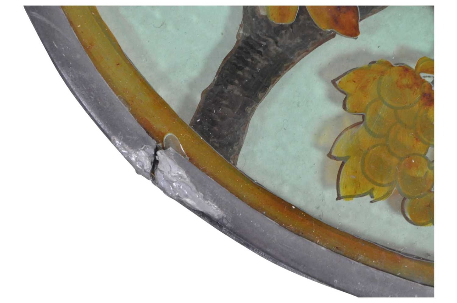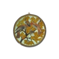 20th century vintage hand painted stained glass hanging panel. Of circular form with painted birds and foliage surrounding a deceased rat on a branch. Measuring approx. 33cm in diameter.