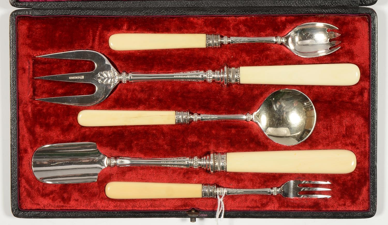 AN EDWARDIAN EPNS SERVING SET, C1900, BONE HAFTED, COMPRISING FORK, CHEESE SCOOP, EGG SPOON, BREAD FORK AND ONION SPOON, BY ATKIN BROS., PLUSH LINED CASE