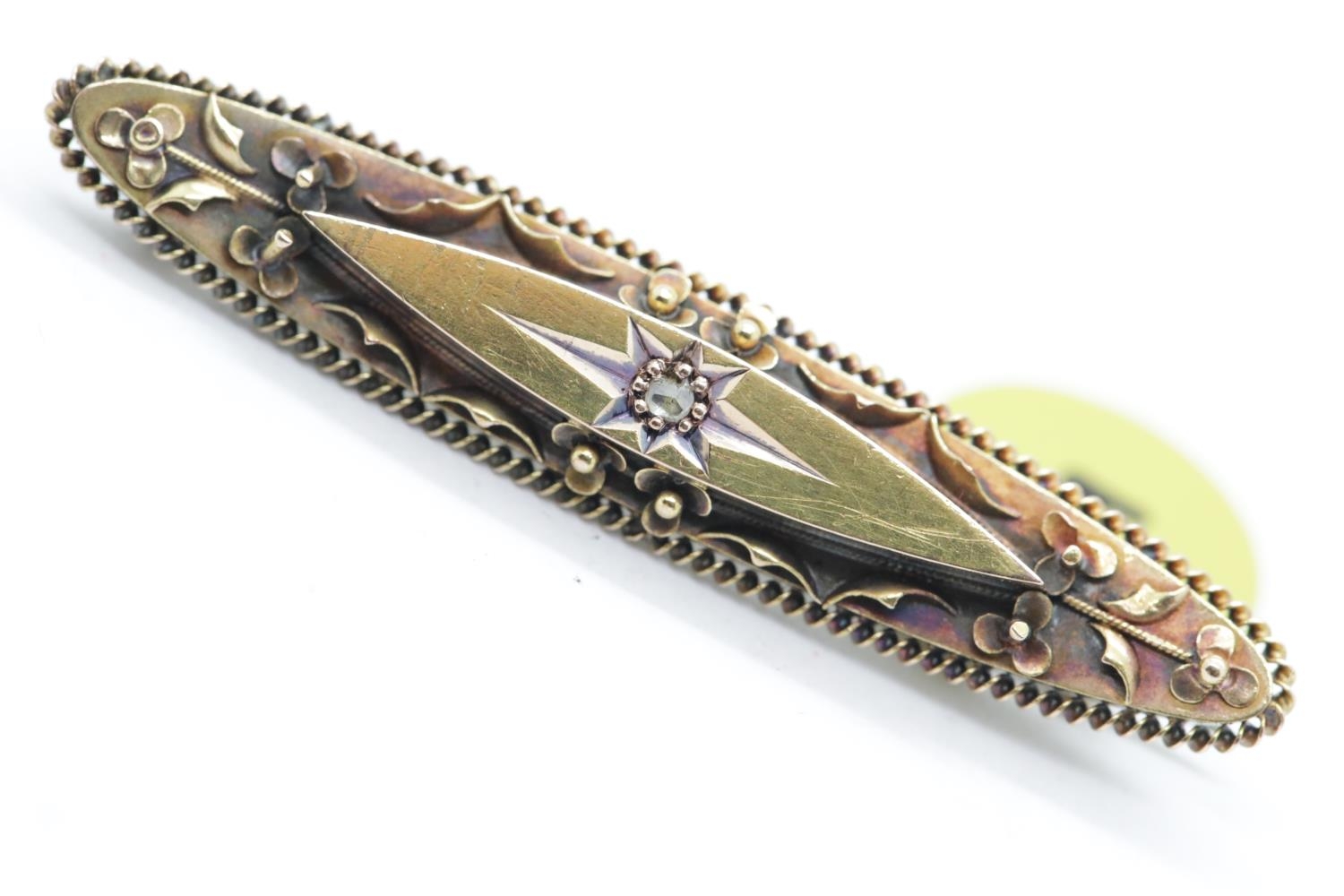 Antique ornate diamond set 15ct gold brooch, L: 40 mm, 2.9g. P&P Group 1 (£14+VAT for the first lot and £1+VAT for subsequent lots)