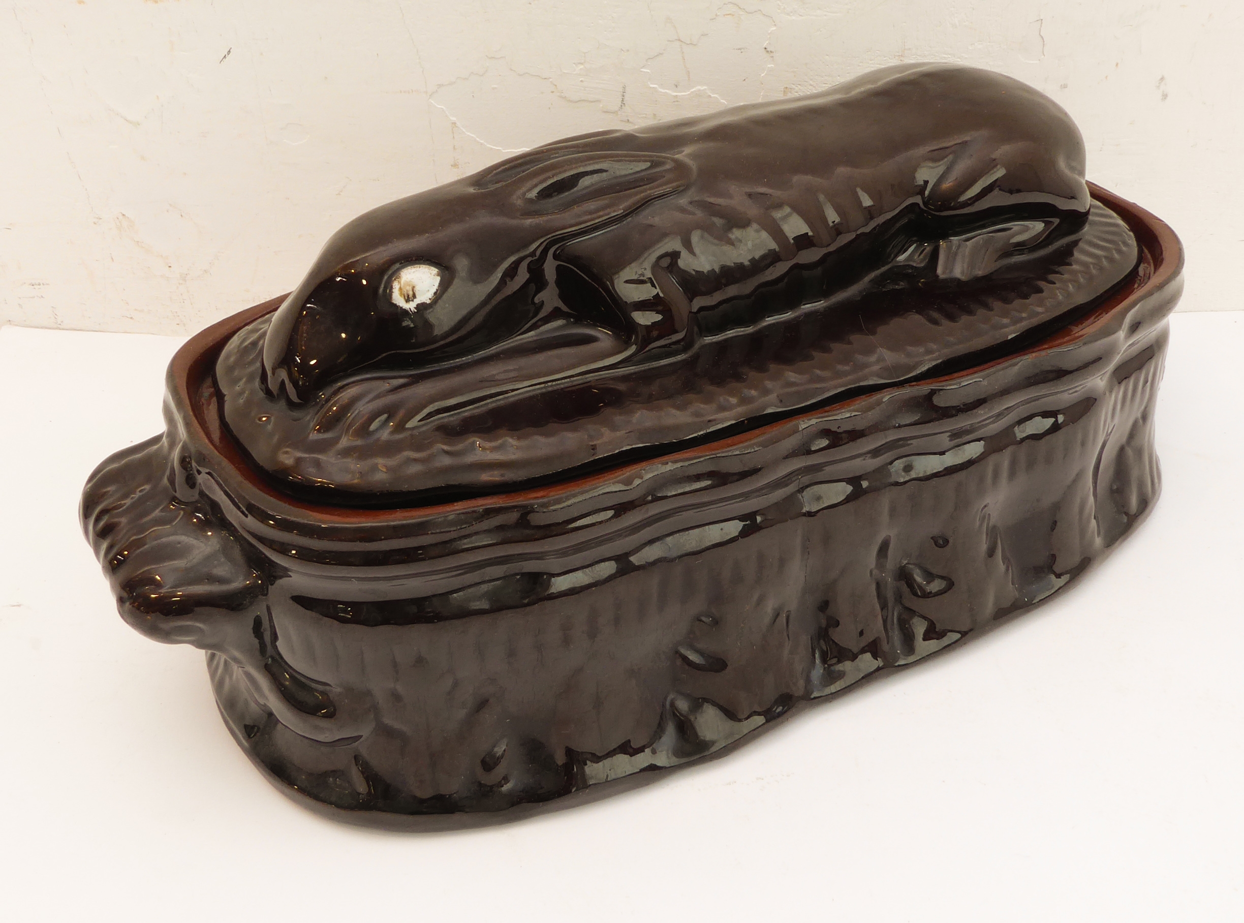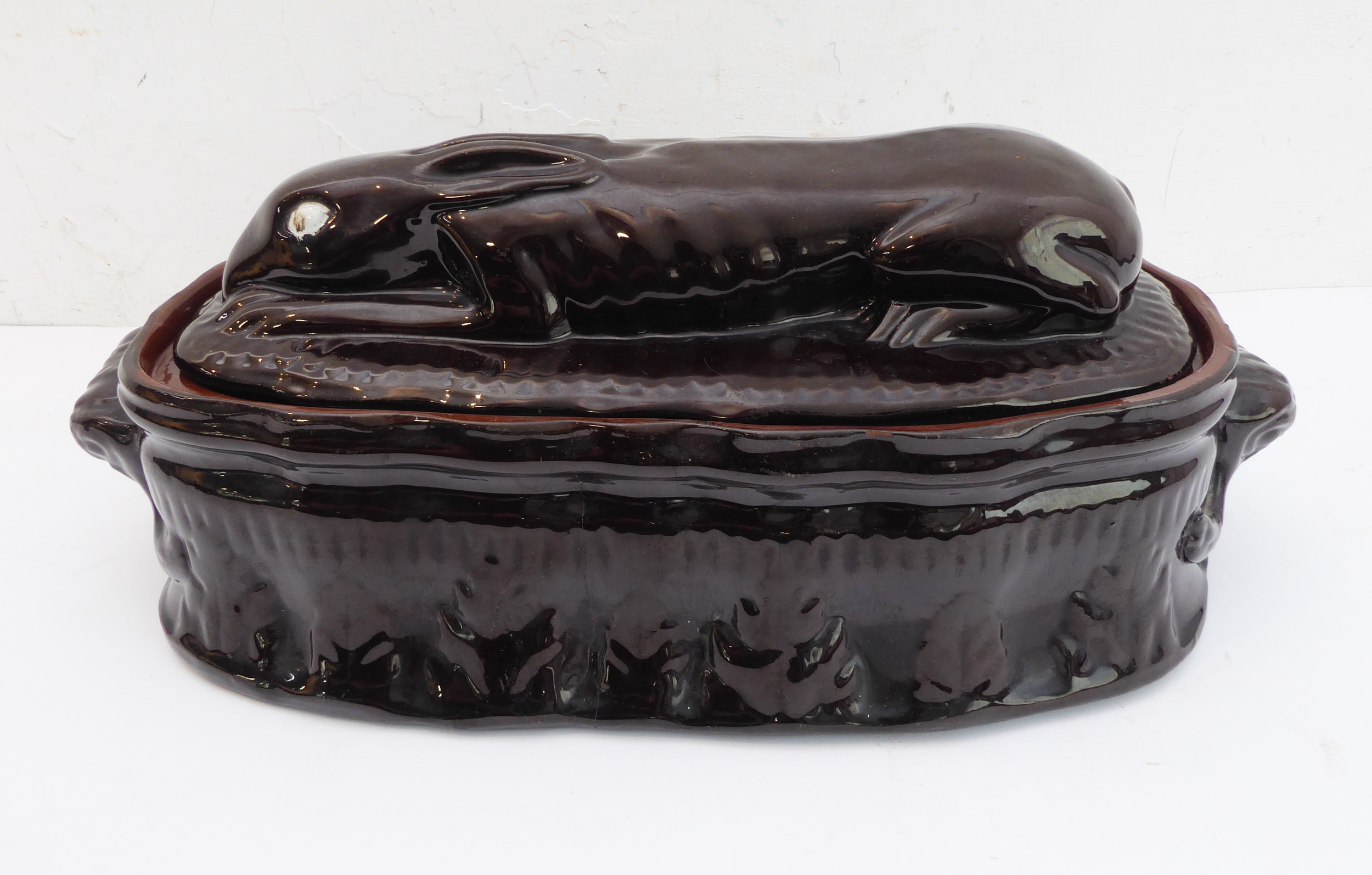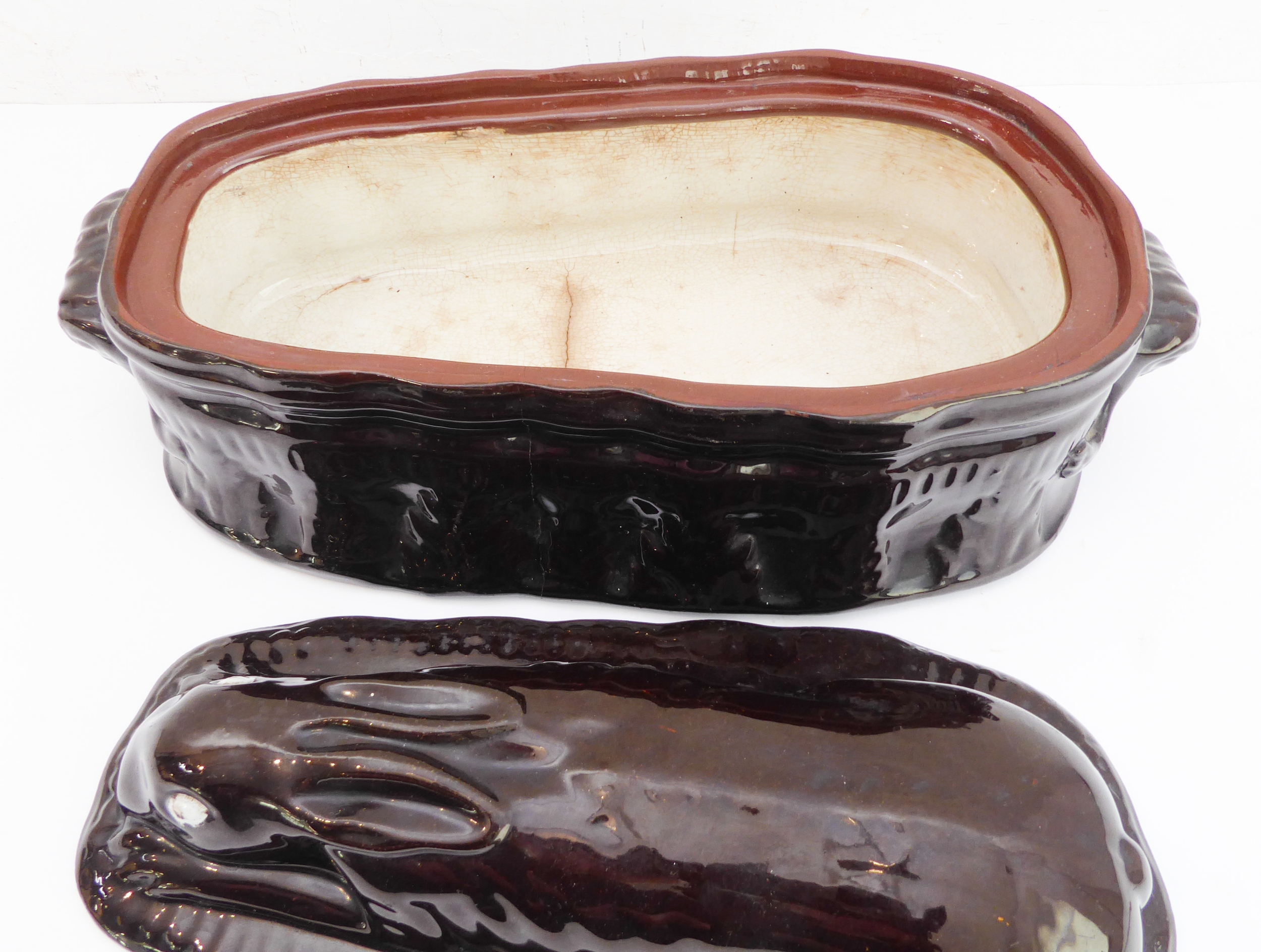 A 19th century brown glazed terracotta two-handled game-pie dish and cover: the cover modelled as a hare lying low (large horizontal crack to middle bottom and conforming hairline to side, crazing and discolouration) (41 cm long x 21 cm widest)