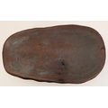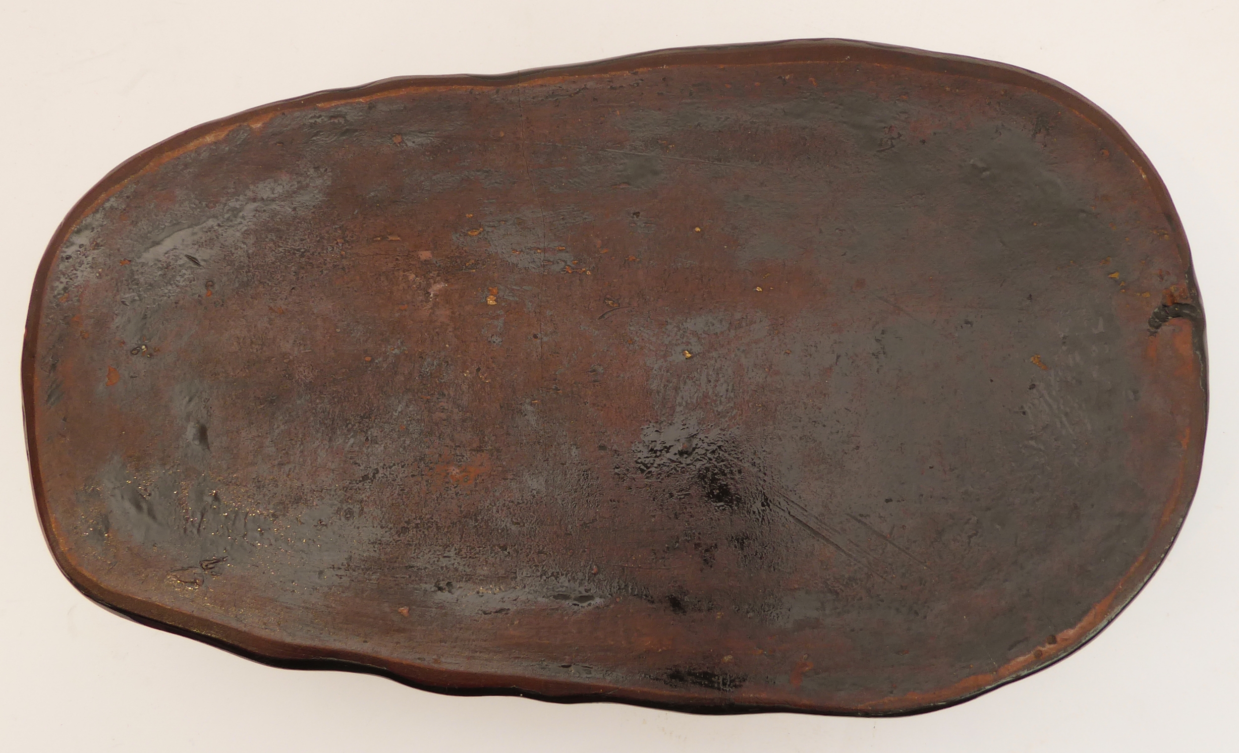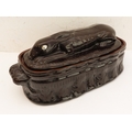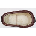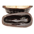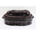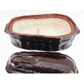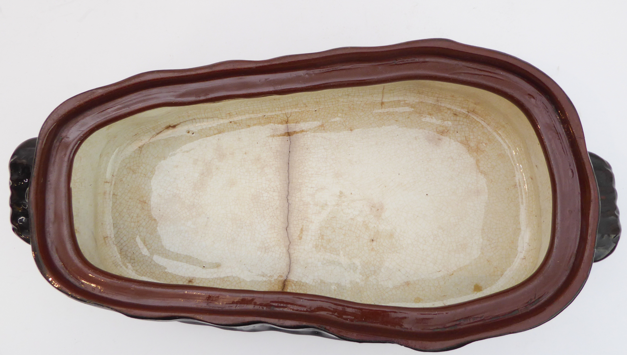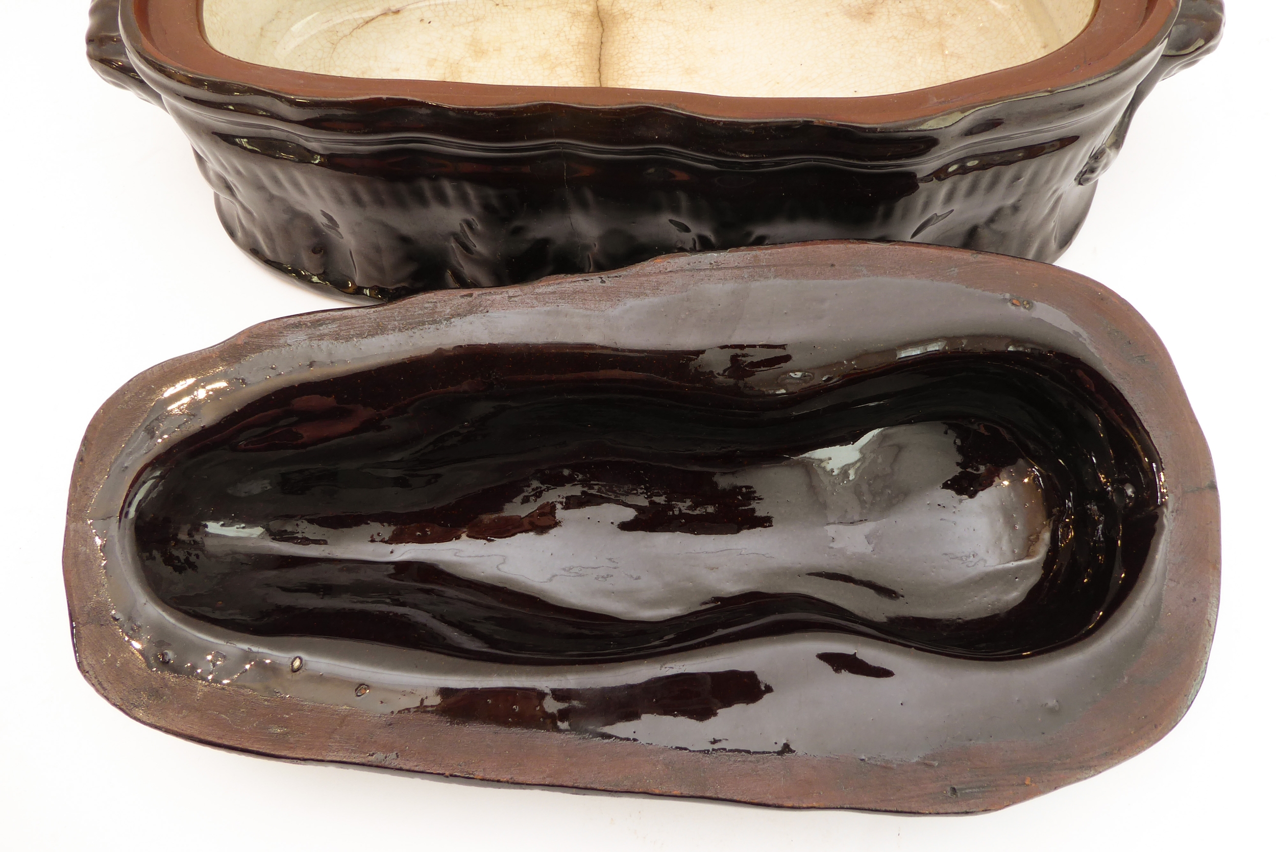 A 19th century brown glazed terracotta two-handled game-pie dish and cover: the cover modelled as a hare lying low (large horizontal crack to middle bottom and conforming hairline to side, crazing and discolouration) (41 cm long x 21 cm widest)