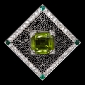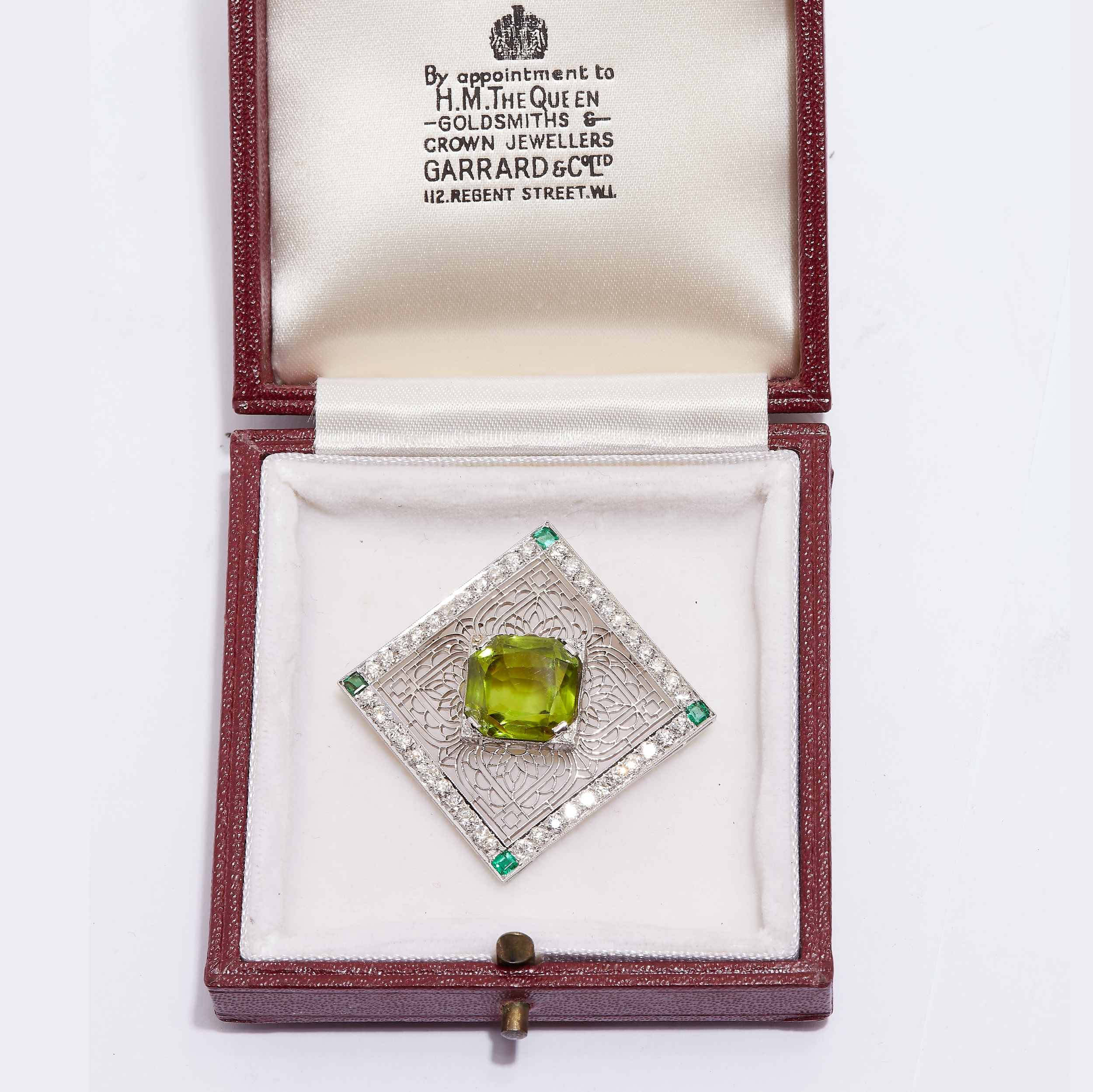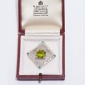 PERIDOT, DIAMOND AND EMERALD BROOCH, of opework square design. Set to the center with a peridot f approx. 10.64 ct. Surrounded with diamonds totalling approx. 2.64 ct. And accentuated with 4 emeralds on the corners. W. 3.1 cm. 11.6 grams. With box.