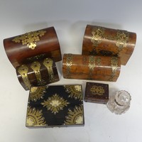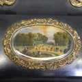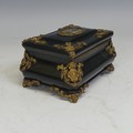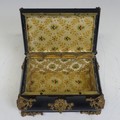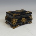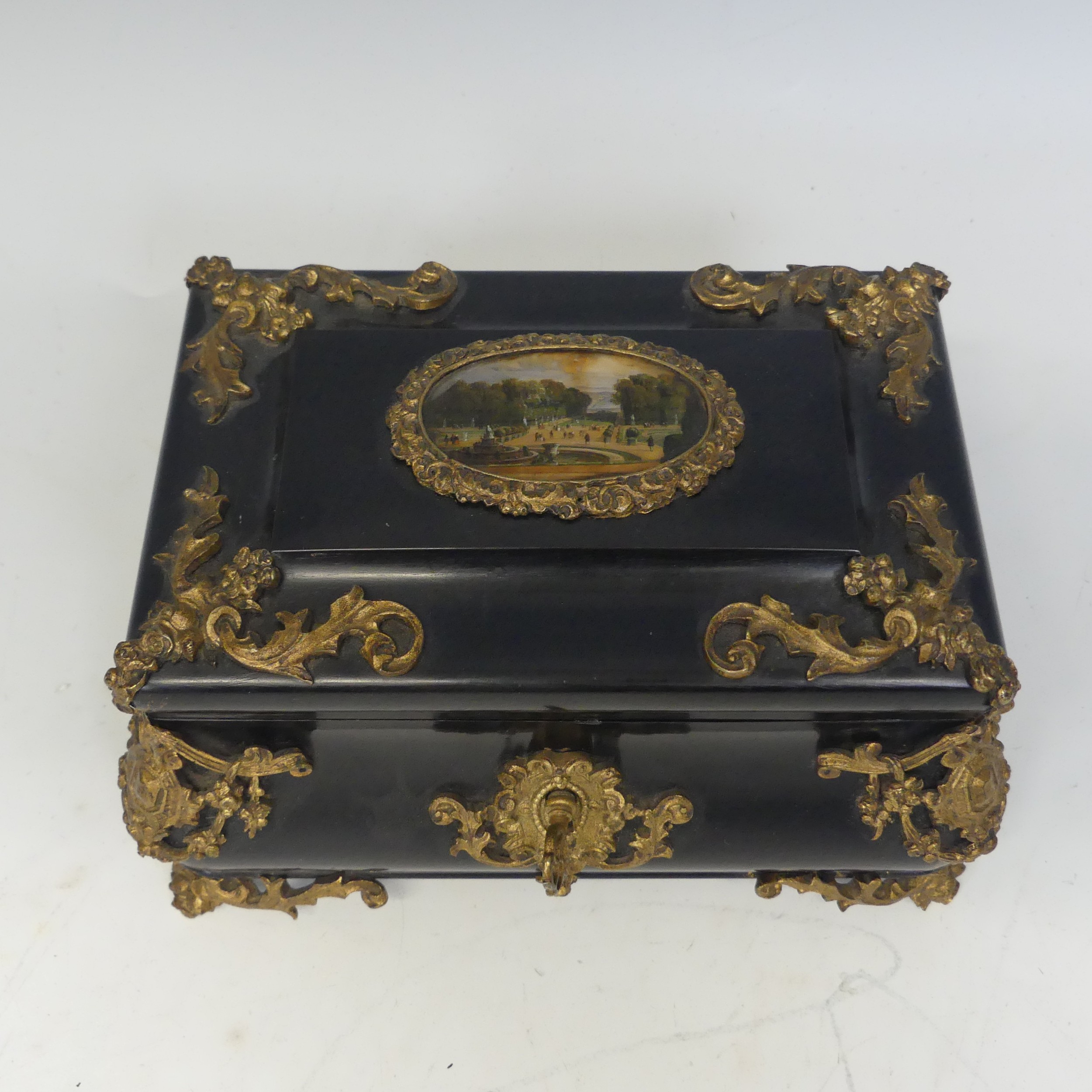 A 19th century Napoleon-type black lacquered jewellery Box, applied with gilt metal foliate swags and mounts, the top applied with central painted plaque, brass mounts and a landscape plaque, W 18 cm x H 11 cm x D 12 cm.