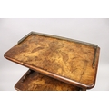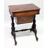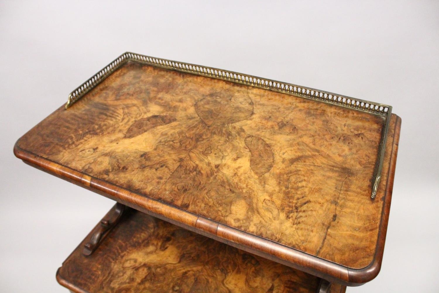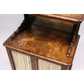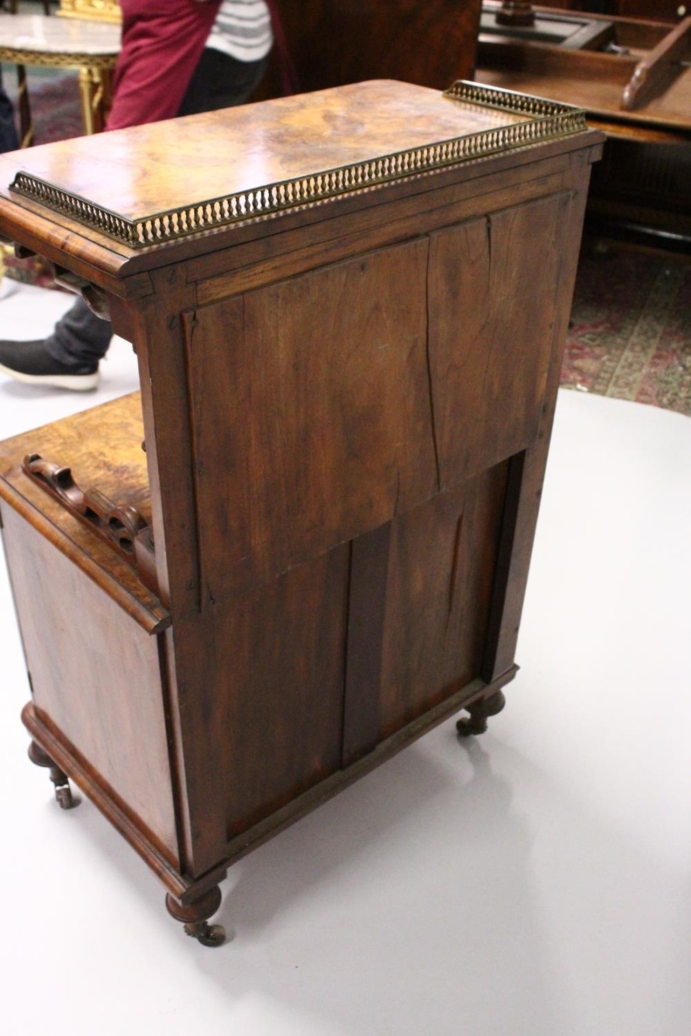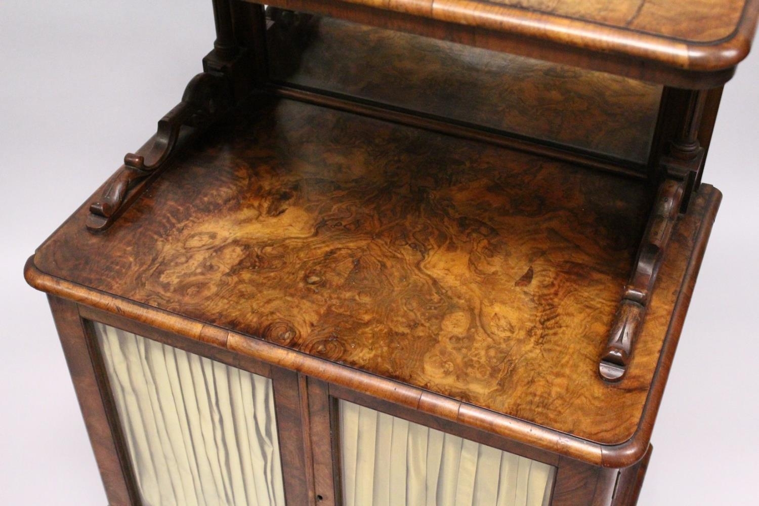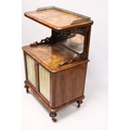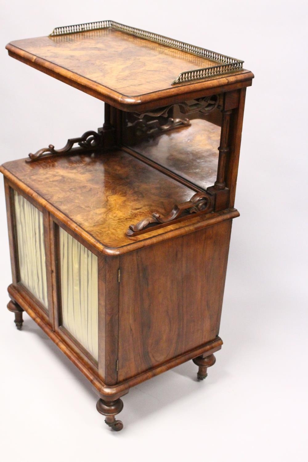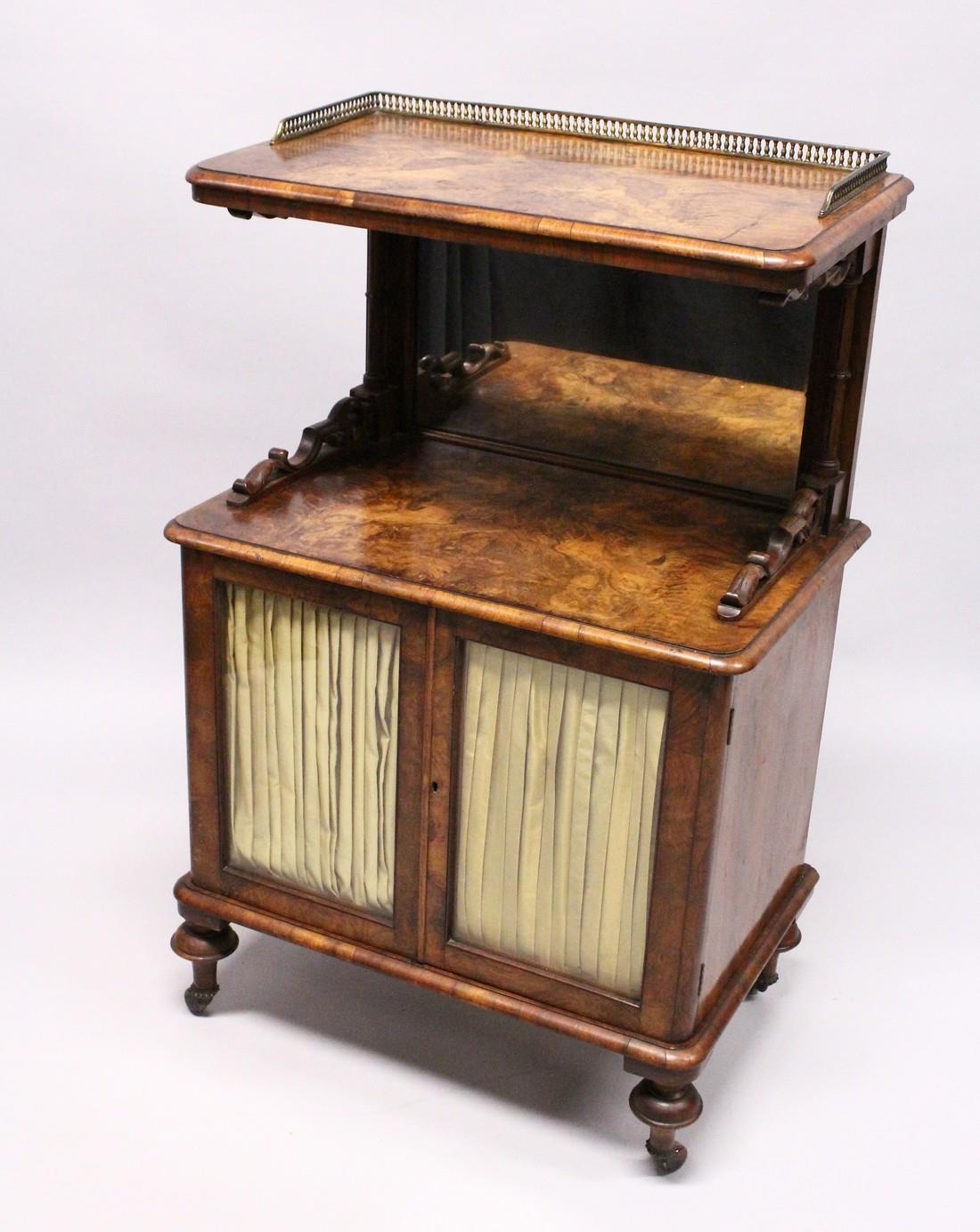 A GOOD VICTORIAN FIGURED WALNUT CUPBOARD with brass gallery, mirrored back over a pair of silk lined doors, on tripod legs with casters.