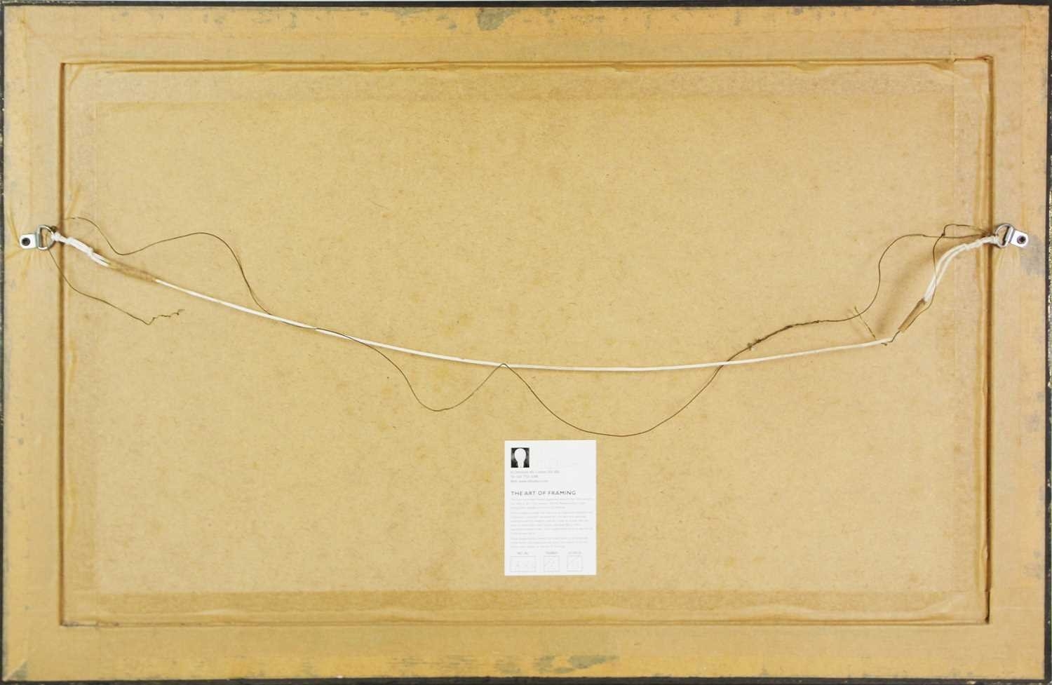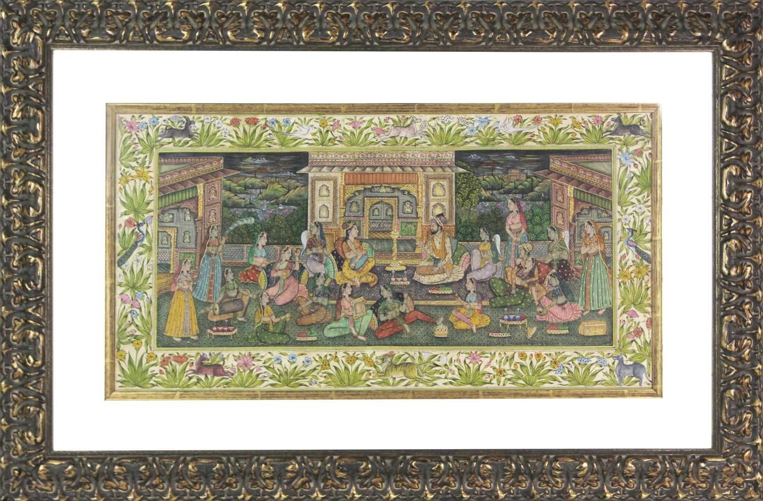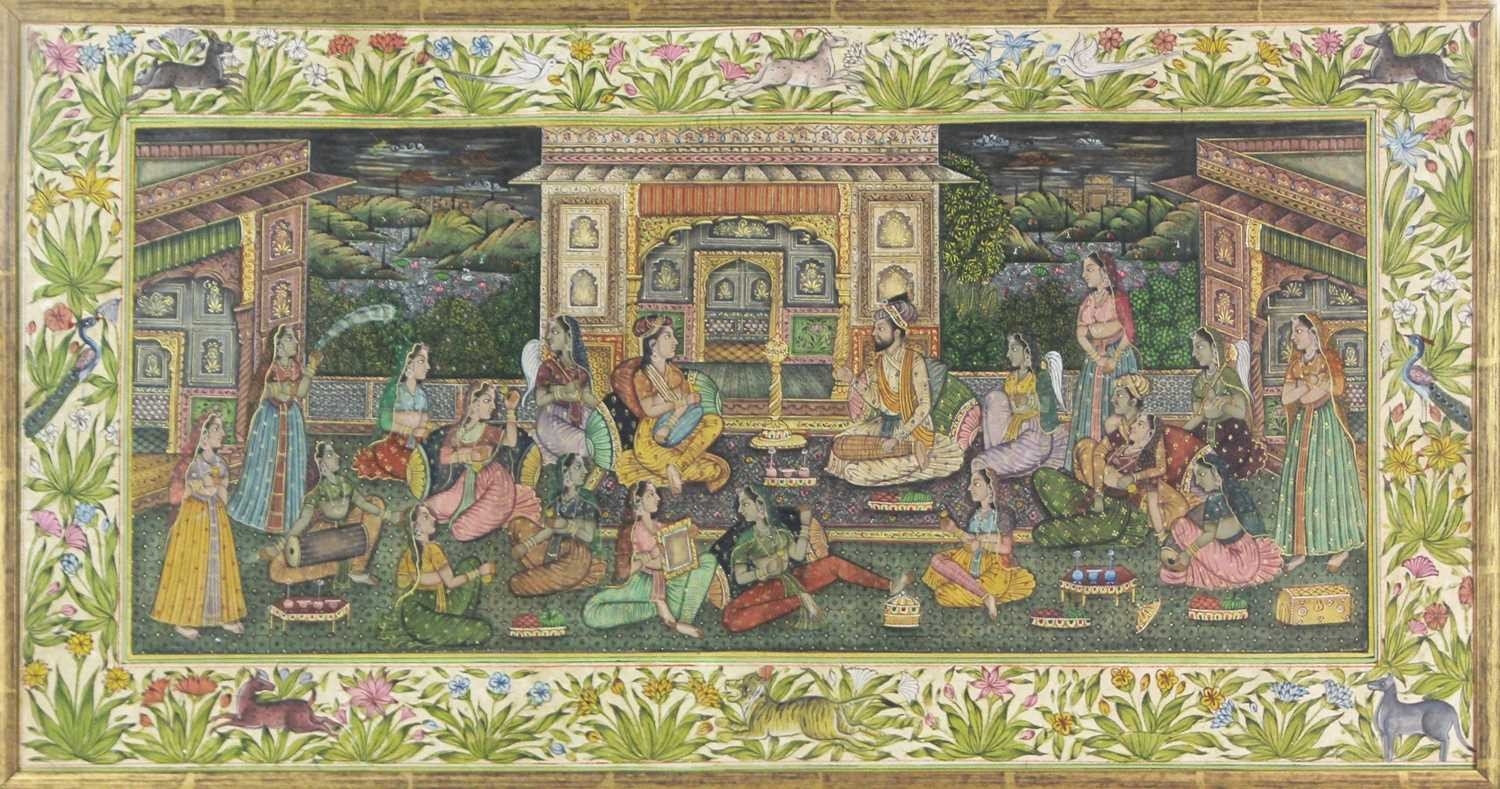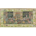 Indian Mughal School, 19th century. A courtly scene with a noble couple and attendants, within an ornate border, watercolour on paper, 28 x 55cm, framed, 50.5 x 78.5cm.
