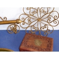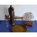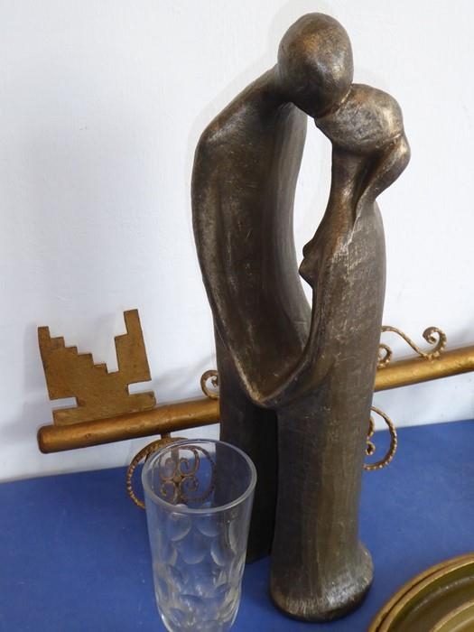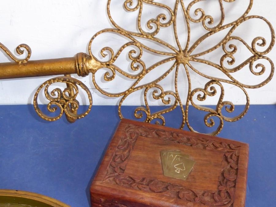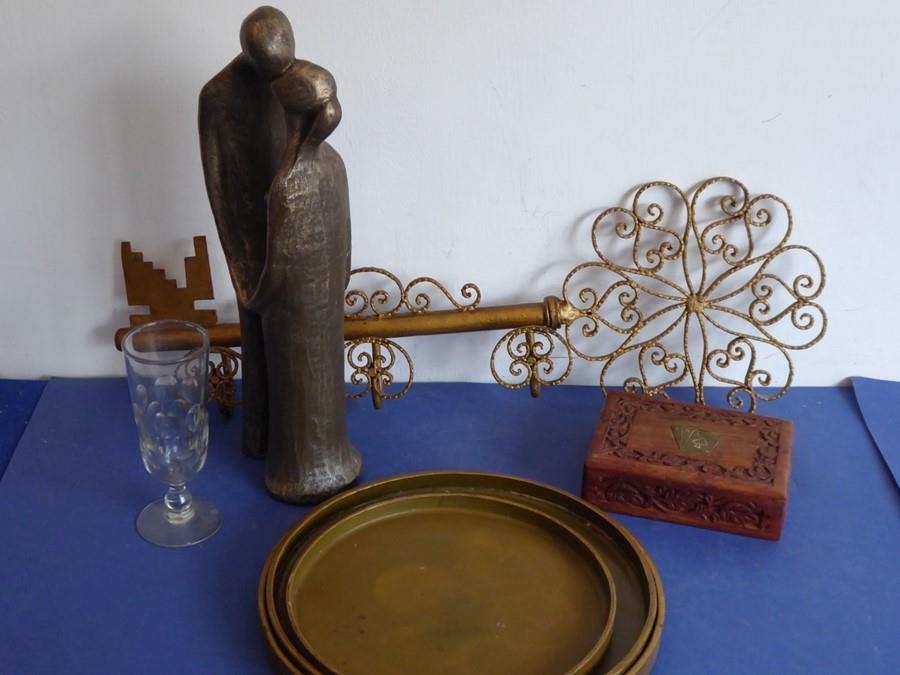 An unusual mid-20th century hat and coat rack modelled as a wall-hanging gilded key (66cm) together with other items including three concentric Japanese gilded papier-mâché trays, a single late 19th century cut-glass flute, a 20th century brass-inlaid carved hardwood box containing two sets of cards and a handmade and signed bronzed sculpture by Geert Kunen (Dutch) (41cm) (selection)